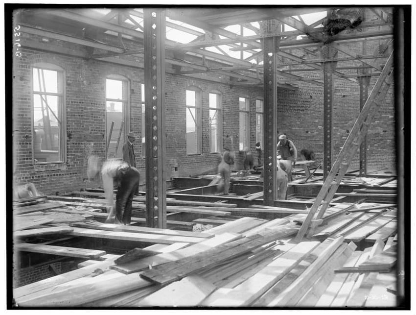 The image depicts the construction of unidentified buildings in West Springfield, Massachusetts. Several workers are engaged in building activities inside a partially constructed brick structure with visible steel beams and wooden planks. The walls have large windows.