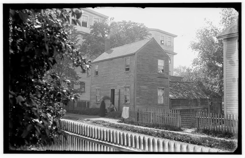 The image shows the east view of the Savings Bank House or the J. Maher House in Natick, Massachusetts. It depicts a two-story wooden building with several windows and surrounded by a picket fence. In the foreground, a person holds an umbrella, and another person is seated on the steps leading to th...
