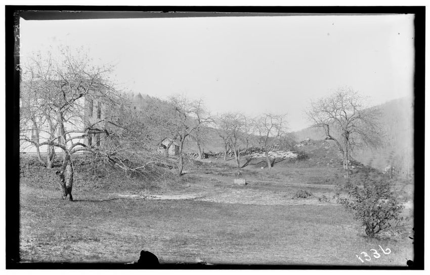The image shows a grassy hillside with scattered bare trees and fencing visible in the foreground. In the background, there is a wooden structure, possibly a barn, situated on the slope. The scene is open, featuring a mix of natural elements and man-made structures.
