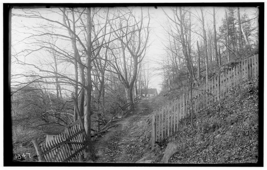 The image depicts an old lane bordered by trees and a wooden fence on a sloped hillside in Chester, Massachusetts. In the background, a house is visible among the trees at the end of the path. The scene is wooded, with bare trees lining the winding path.