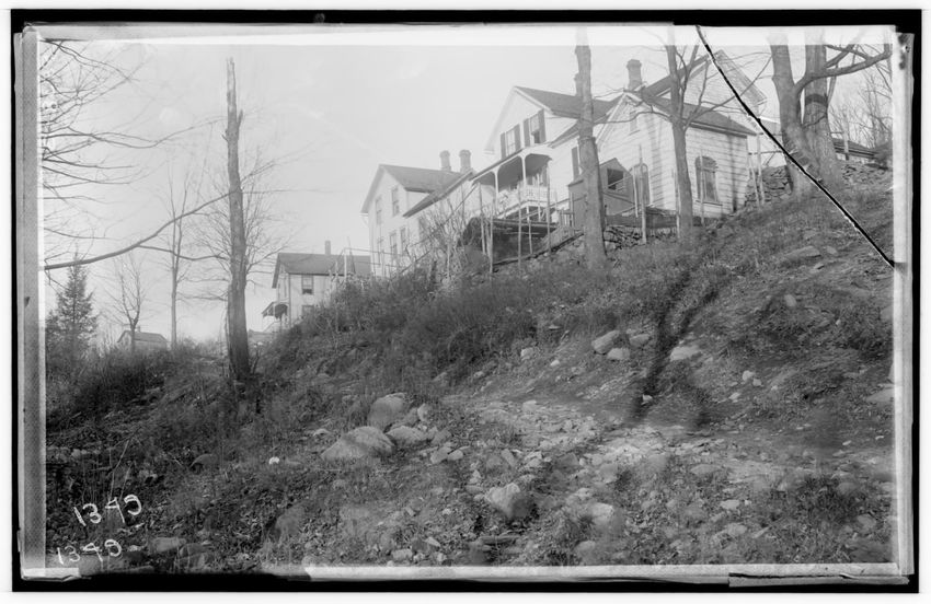 The image shows a hillside landscape in Chester, Massachusetts, with houses situated beside a railroad. The foreground includes rocky and grassy terrain, along with several trees, some of which are bare. There are two visible houses, both with multiple stories and chimneys, perched on the slope abov...