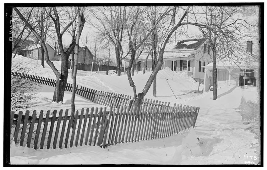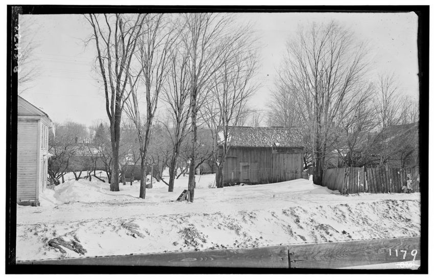 The image depicts a snow-covered landscape associated with Plunkett Manufacturing Co. land on the east side of Hinsdale, Massachusetts. Visible are a wooden building and several leafless trees. In the foreground, there is a wooden fence, while a larger structure is visible in the distance amidst the...