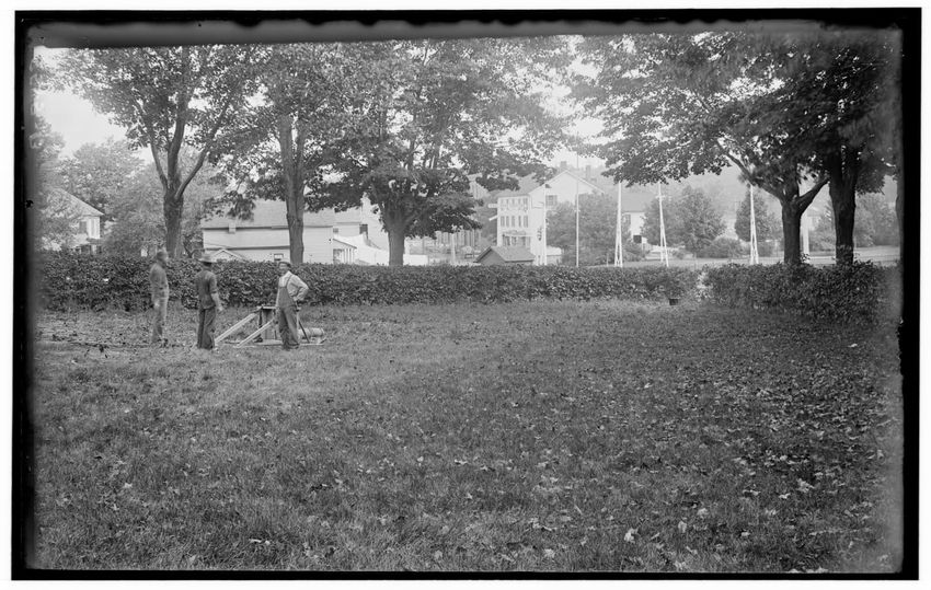 The image shows a view during the grade crossing elimination project in Hinsdale, Massachusetts. Three men are standing near a piece of equipment on a grassy area. Trees and buildings are visible in the background.