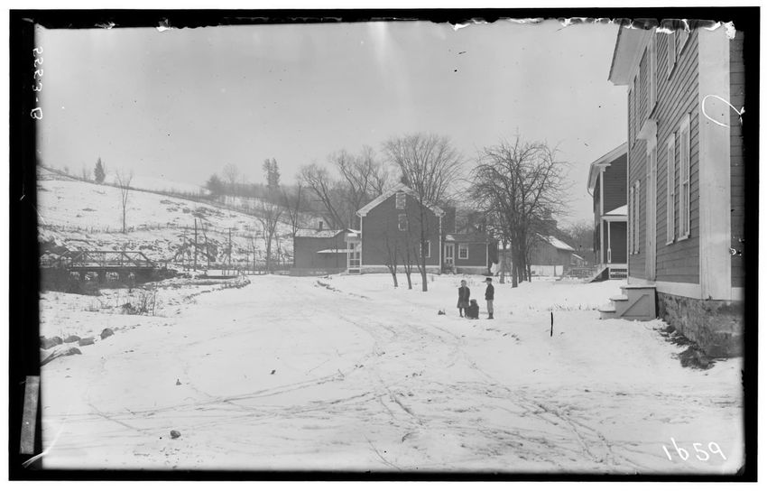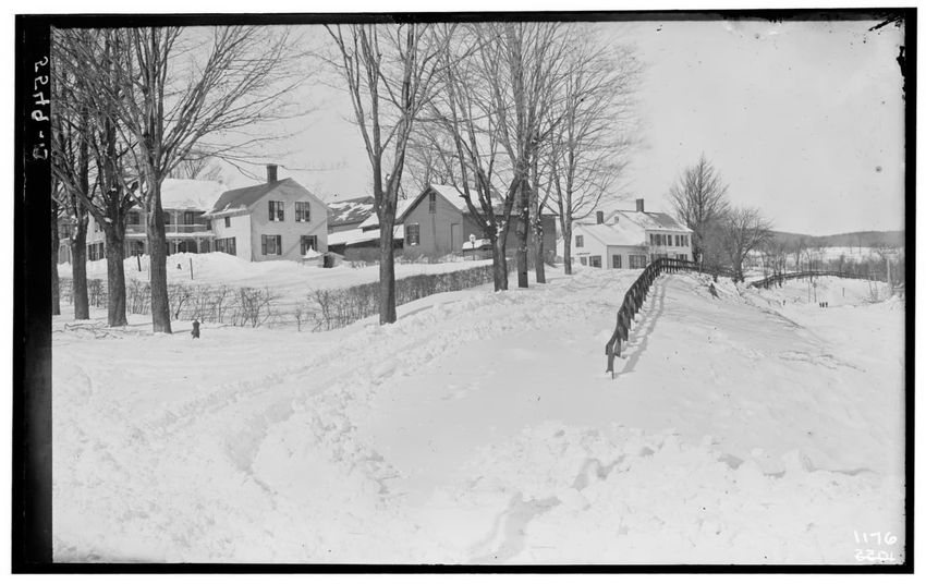 The image depicts a snowy landscape looking north from the Phillips House in Maple Grove, Adams, Massachusetts. There are several buildings visible, with trees scattered throughout the area. Three people are standing on the snow-covered ground near the center of the image, with a small bridge visibl...