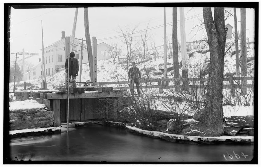 The image shows a gate to a raceway in a stream, associated with a dam in Adams, Massachusetts. Two individuals stand on a small wooden bridge above the water. In the background, there is a snow-covered landscape with bare trees and industrial-style buildings. A sign reading "Railroad Crossing" is v...