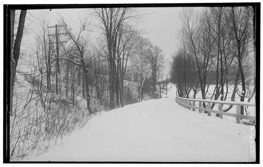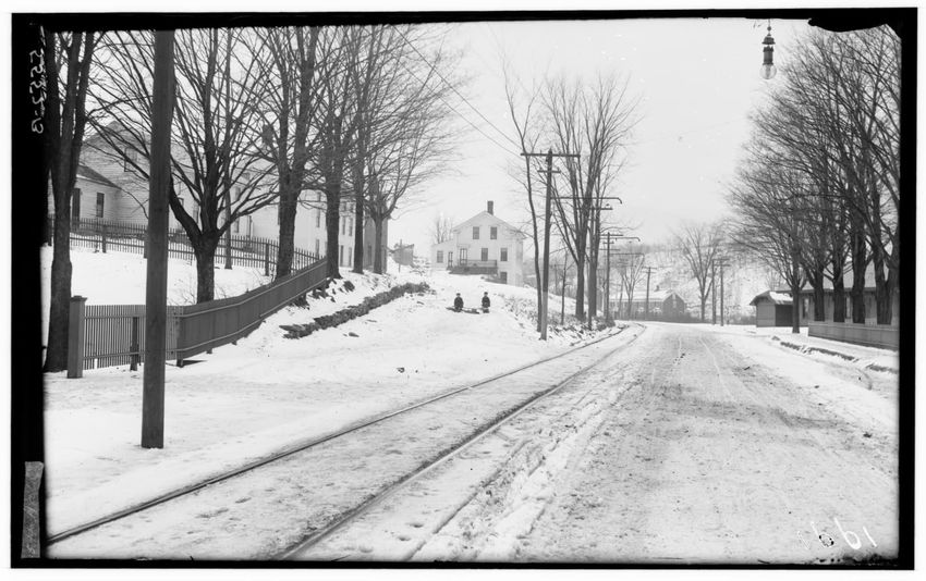 At 23rd milepost, road on left with trolley line, Framingham, Massachusetts, 5557-B