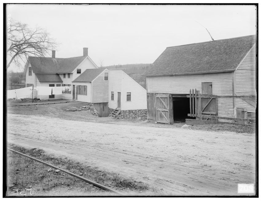 The image depicts a rural area near the 23rd milepost in Framingham, Massachusetts. It features a house and a barn situated next to an unpaved road. The house has a tree nearby, and laundry is hanging outside.