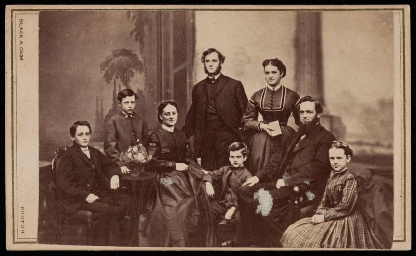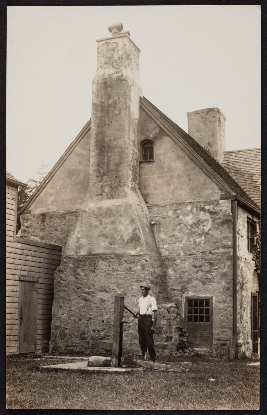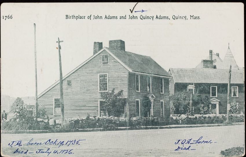 Handwritten text on the item verso reads "On the left is the house where John Adams lived after he was married. The one on the right is where he was born. It was built in 1681. These two houses are on the corner of Presidents Ave. and Independence Ave., Quincy, Mass. Purchased 23 March 1925 for $1, ...