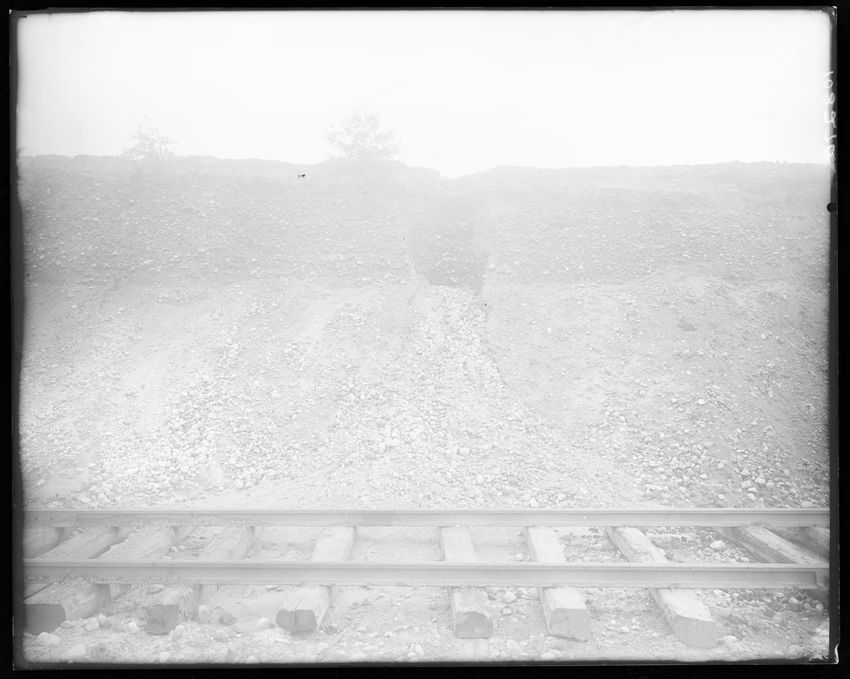 The image shows a gravel bank in Wilbraham, Massachusetts. In the foreground, railroad tracks are visible running parallel to the gravel bank. The bank rises behind the tracks, with a variety of gravel and small rocks present, and some vegetation is noticeable at the top.