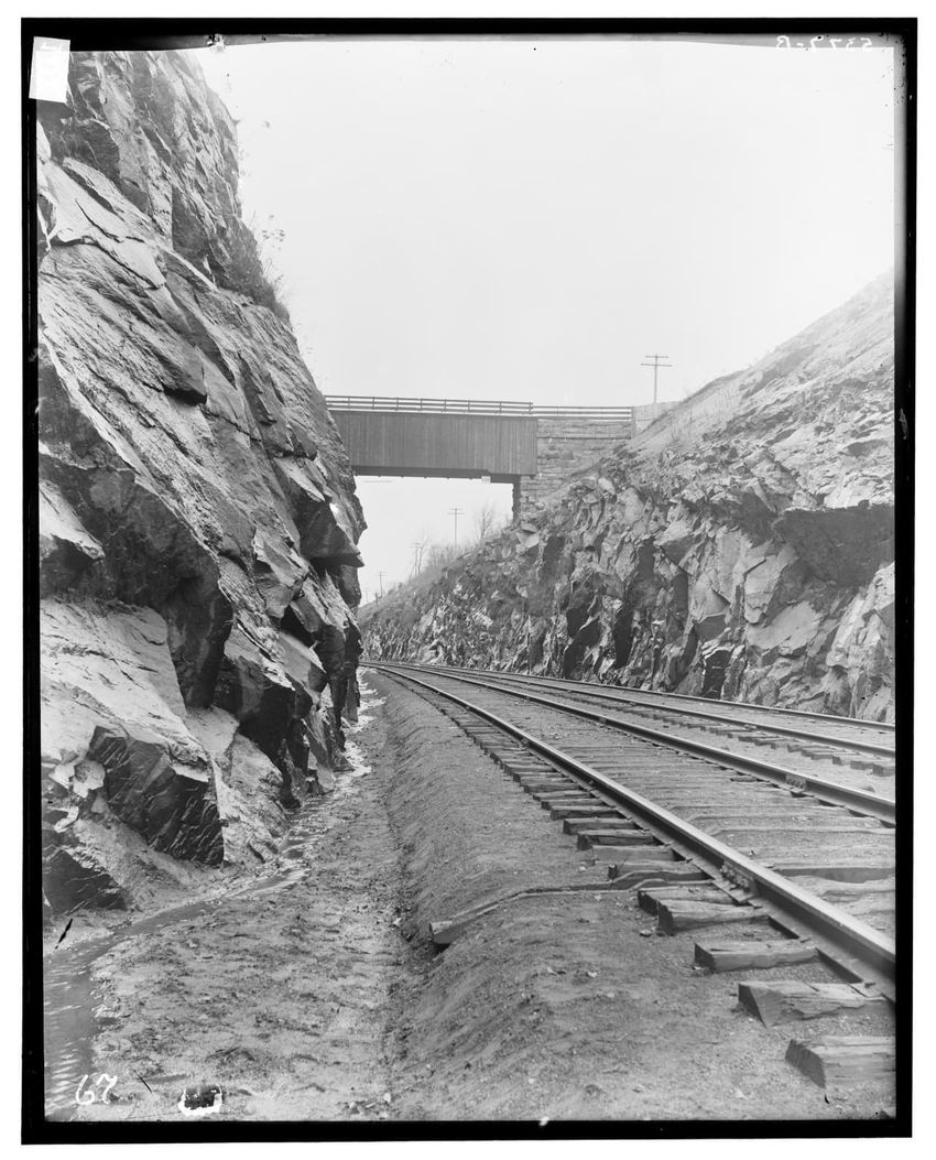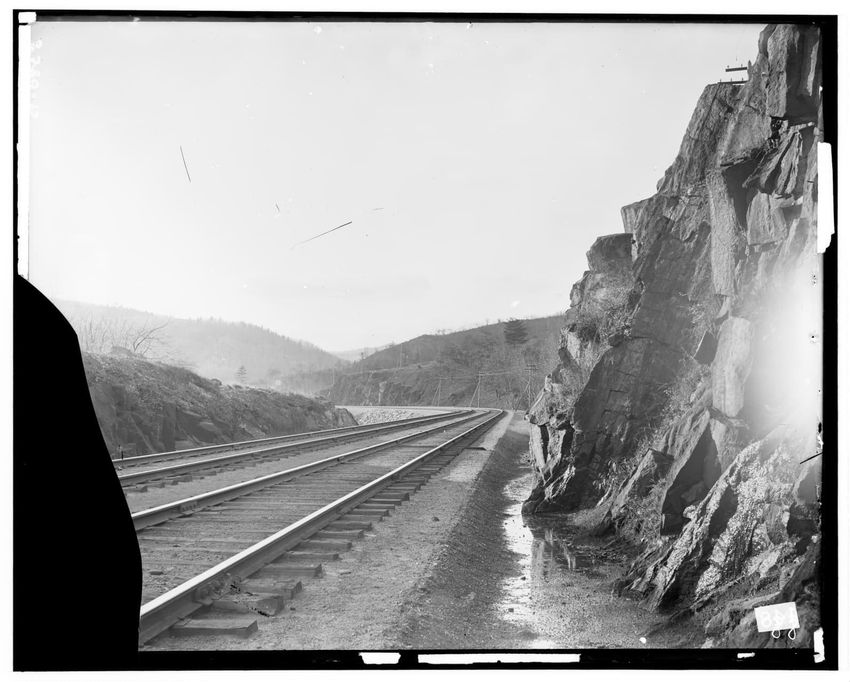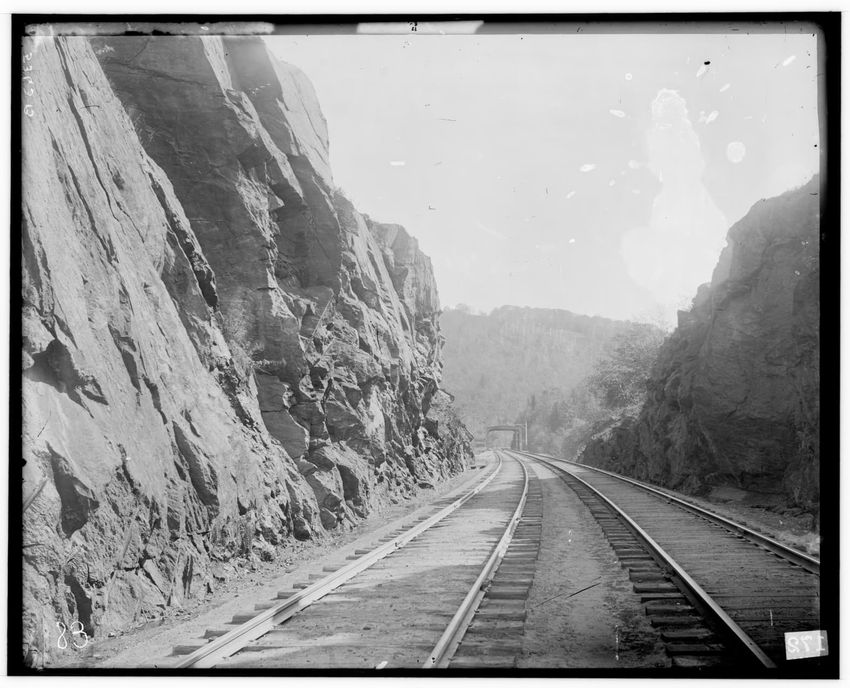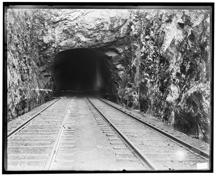The image depicts the entrance of a railway tunnel carved into a rocky hillside, identified as the State Line Tunnel. The double railroad tracks run into the tunnel's dark opening. A person is standing to the side of the tracks, near the tunnel entrance. The rocky walls surrounding the tunnel are ru...