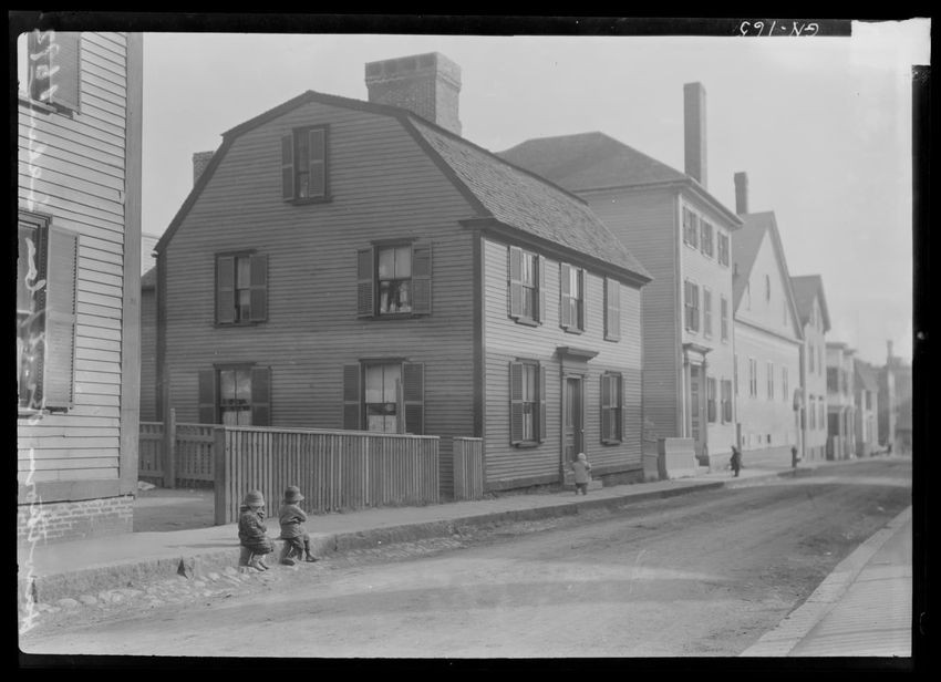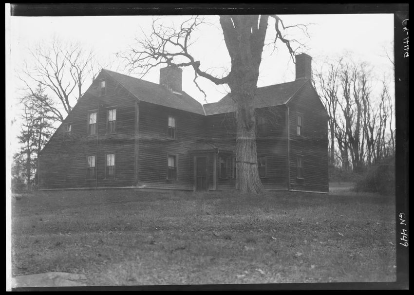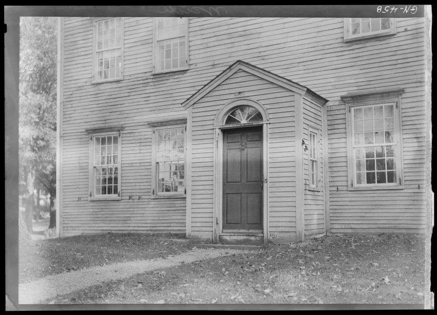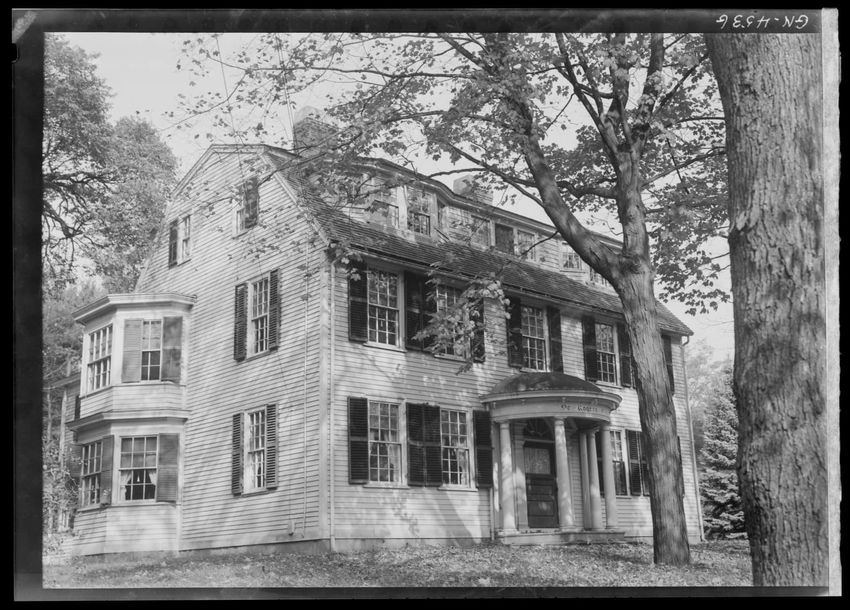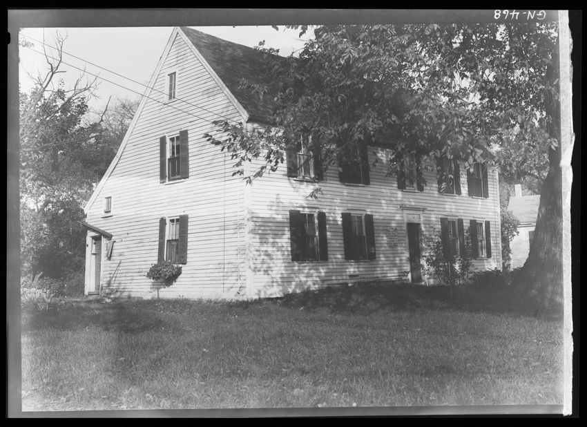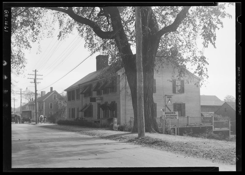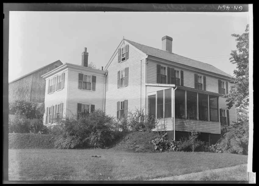 The image shows the Hovey House, a traditional wooden structure located in Ipswich, Massachusetts. It features two stories with multiple windows, each adorned with dark shutters. A tree partially obscures the right side of the house and a grassy area is visible in the foreground.