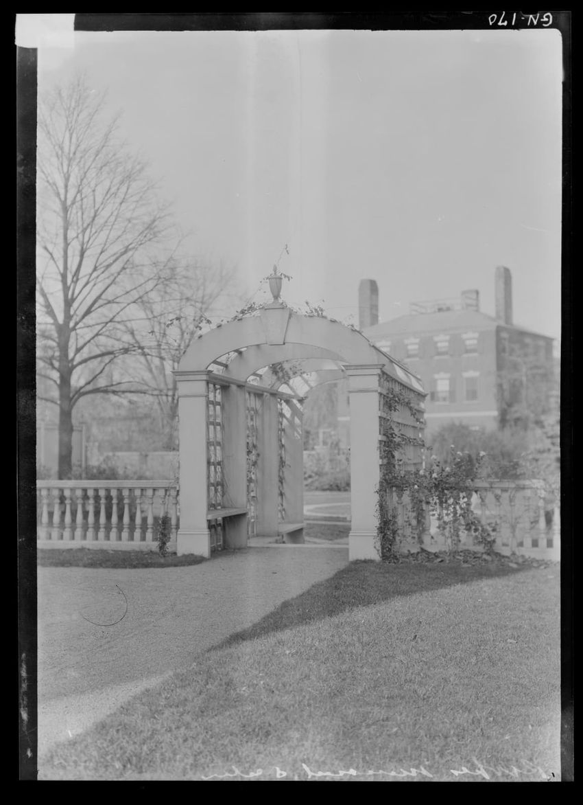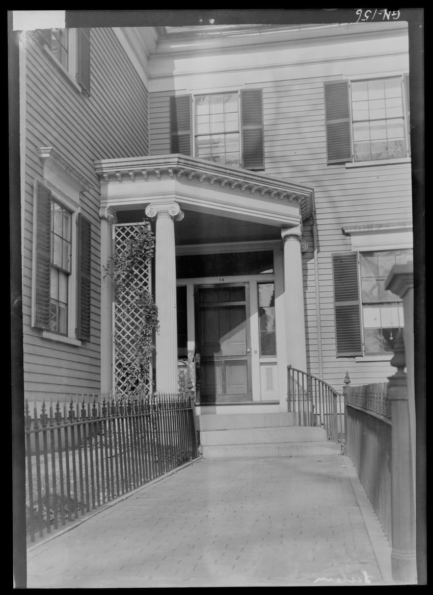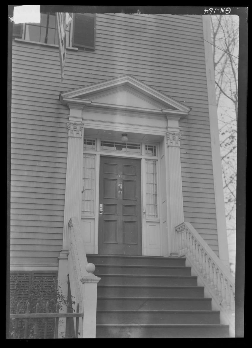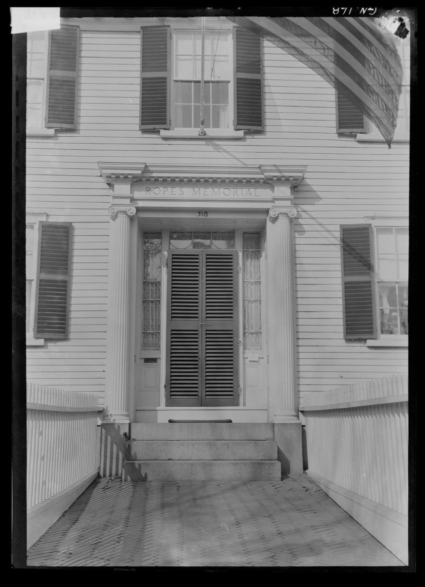 The image shows the Hovey House, a traditional wooden structure located in Ipswich, Massachusetts. It features two stories with multiple windows, each adorned with dark shutters. A tree partially obscures the right side of the house and a grassy area is visible in the foreground.