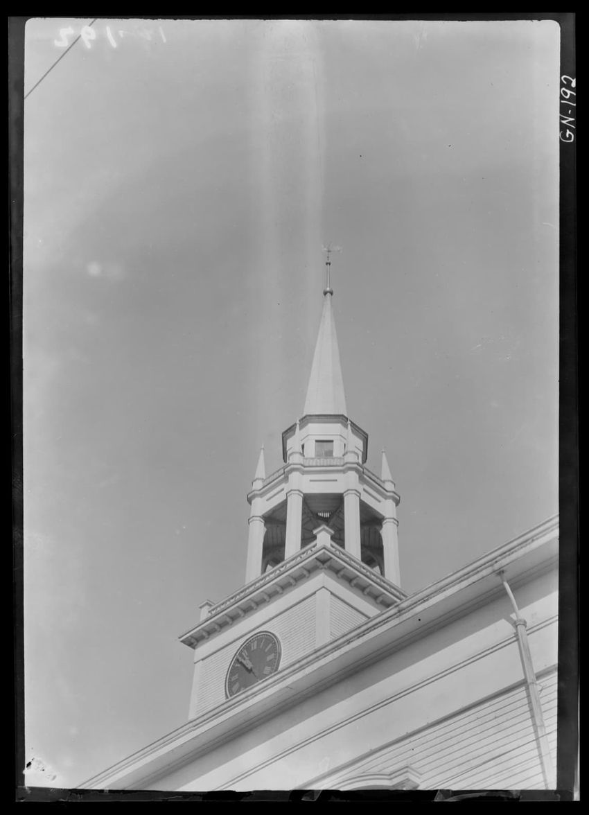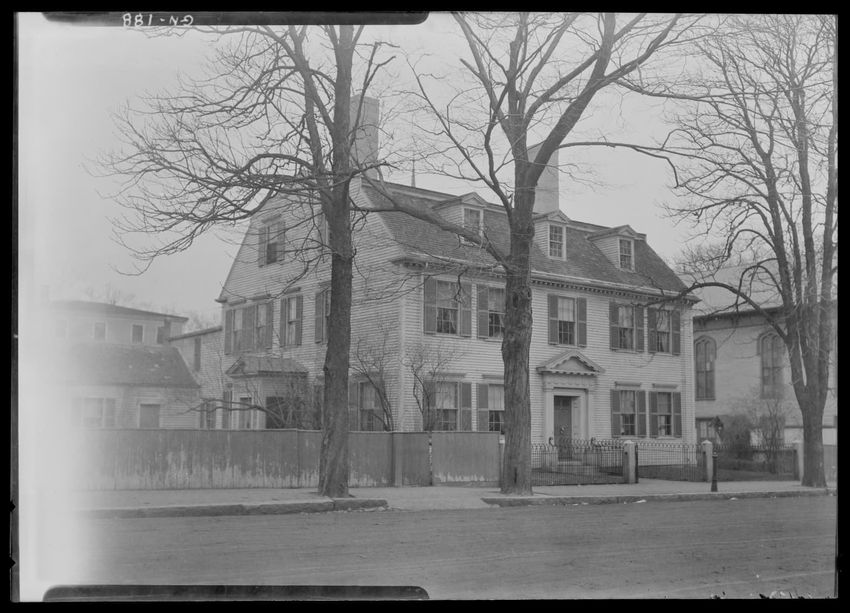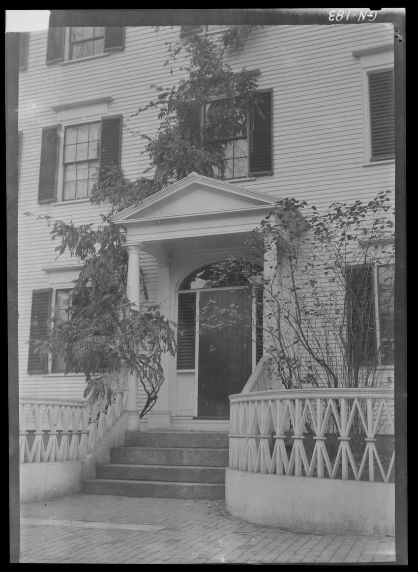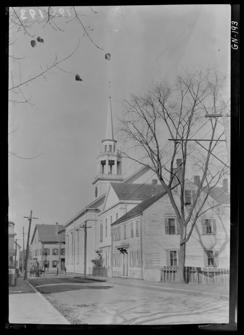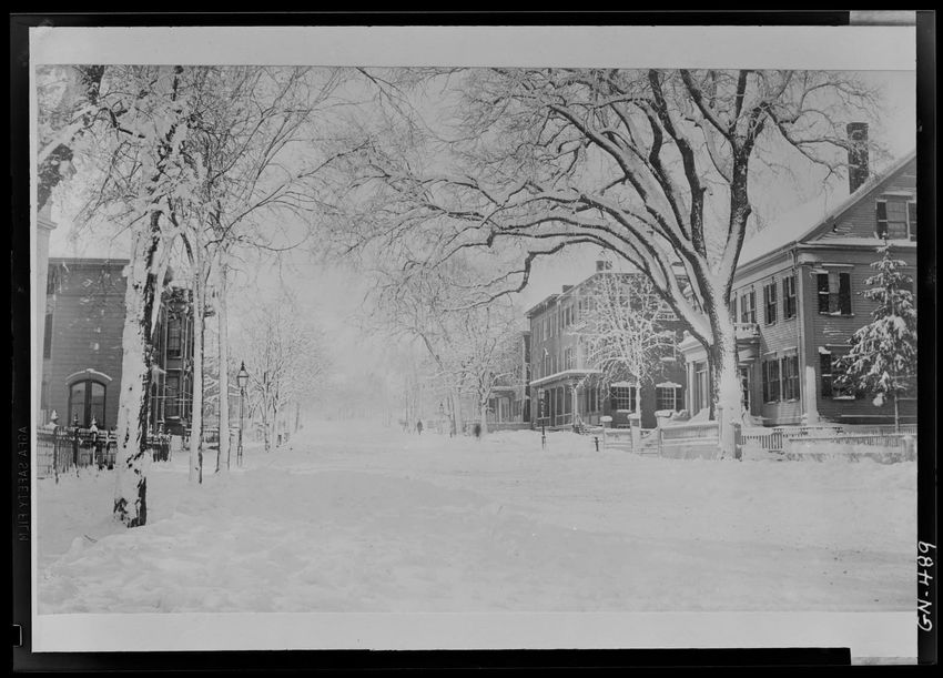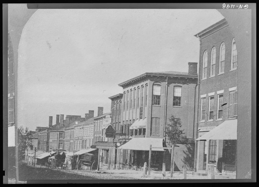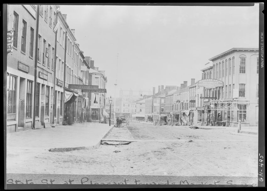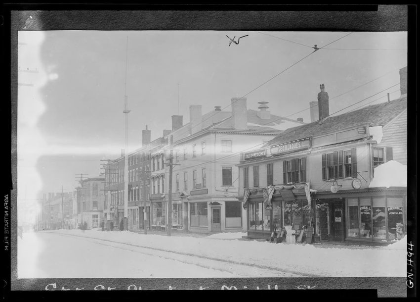 The image depicts a row of brick buildings on State Street, below Essex Street, in Newburyport, Massachusetts. Visible businesses include "W.B. Morss," "Albion Hall - Ambrotype Saloon," and "G.W. Clark." Signs for a photographer, "H.P. Macintosh," and a business named "L.N. Moulton" are also present...