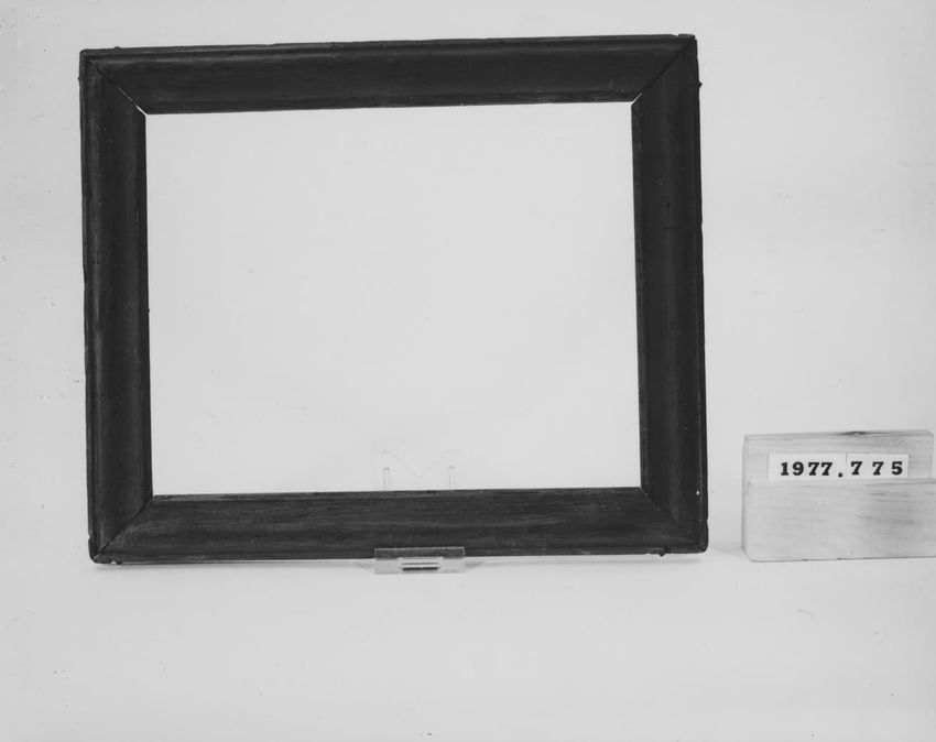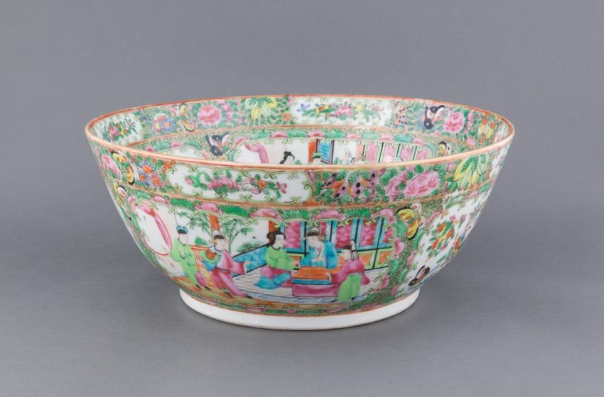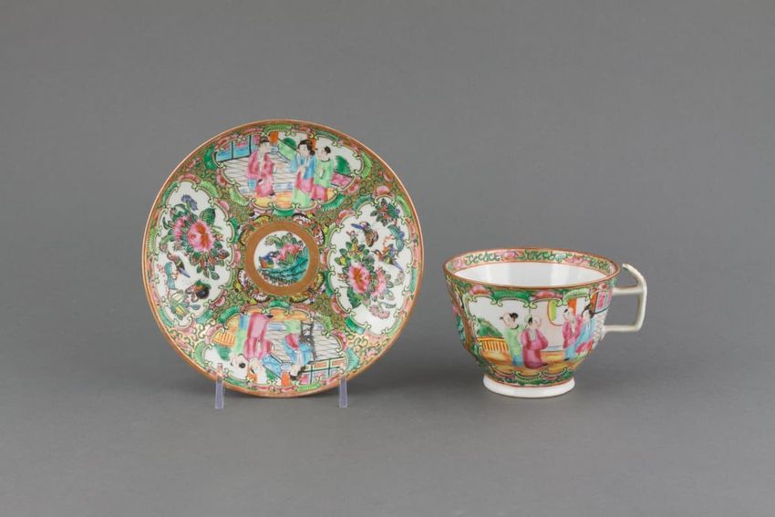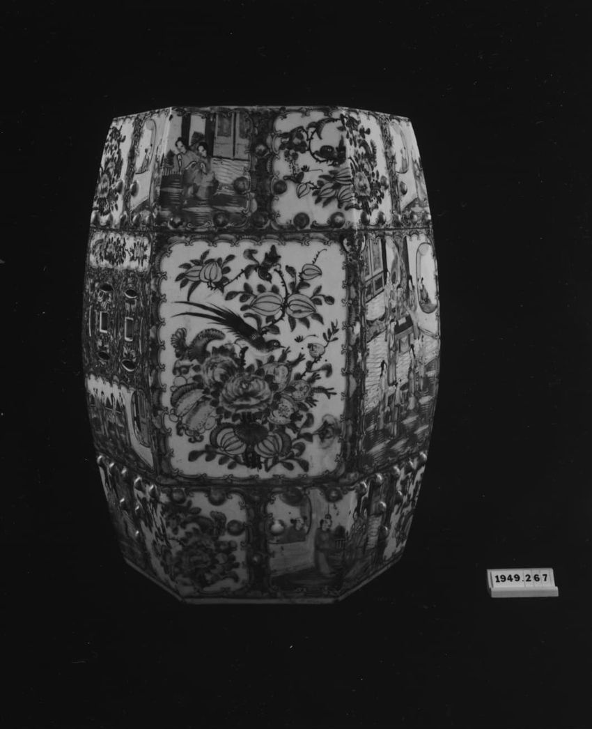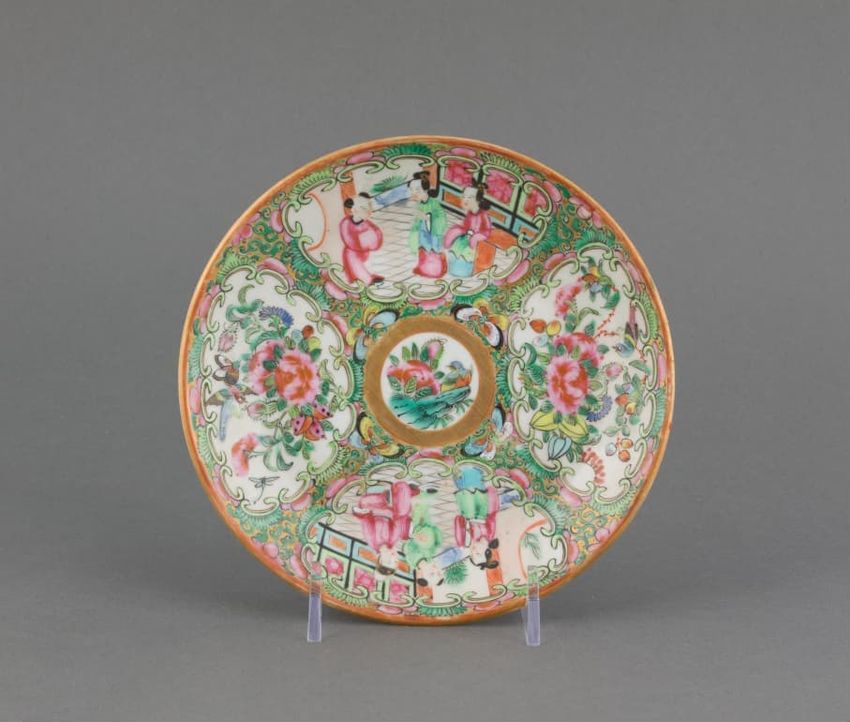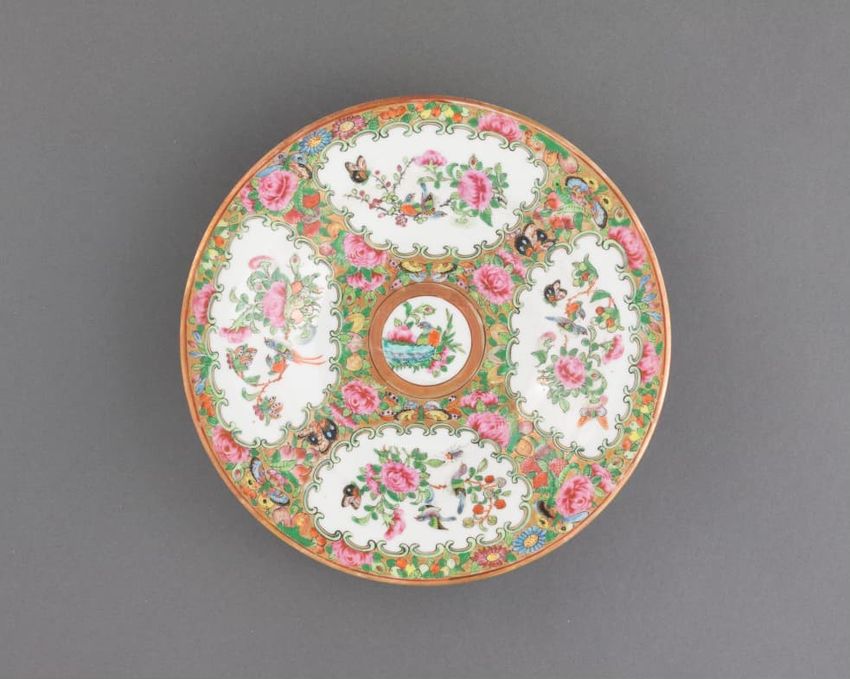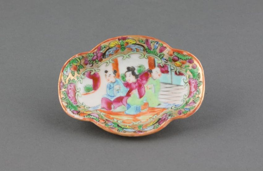 Blue and white; deeply scalloped squarish edge, interior: network and scallop border; central decoration: mountains in background of house with tree and rocks in water, foreground; exterior: trellis border; two identical scenes of pavillion, right, bridge, foreground, hills and other buildings, dist...