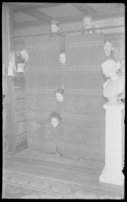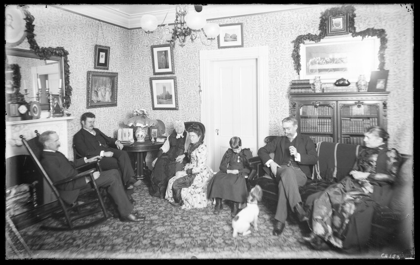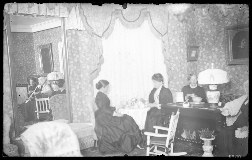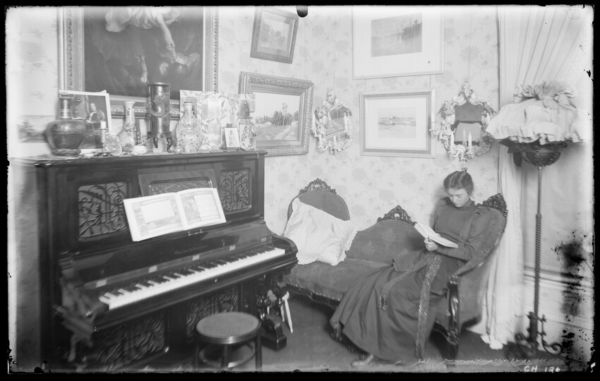 Study with bookcases, sofa, man, woman, and children on lap, CH90-B Three women and baby on porch, CH91-B Three women with baby, CH92-B Woman reading to another woman at table in corner of parlor, CH93-B Group of people seated at table, eating, CH94-B Corner of parlor looking into another room; piano, pictures, and books, CH95-B Three children in room with bed and crib, CH96-B Cluttered parlor, books, flowers, paintings, and tapestry, CH97-B Room with desk and table, group of people talking, and woman with fan, CH98-B Group of people seated at set table with food, CH99-B Group of people seated at table, eating, CH100-B Group of people seated at table, eating, CH101-B Group of people seated at table, eating, CH102-B Group of people playing cards, CH103-B Child in fur-lined carriage near fireplace, CH104-B Shadyside library, southwest corner, CH105-B Shadyside Christmas tree, CH106-B Shadyside parlor, G.C. gifts, CH107-B Studio, shadyside, girl with hat sitting in front of curtain, CH108-B Library, shadyside, northeast corner, CH109-B Man and woman reading in room with books, table, and chairs, CH110-B Room with table set with wine bottle and glasses, decanter, and pictures on mantle, CH111-B Room with wicker chairs, bookcase, and woman at desk, CH112-B Dining room with set table, sideboard, and rack with dishes, CH113-B Room with books, chairs, windowseat with banjo, tea set, and woman with teacup, CH114-B View from hallway into two rooms, dining room and study, CH115-B Library window, Grace Chandler, and Bessie Milthum, CH116-B Bedroom with three girls on bed, washstand, CH118-B Bedroom with three girls on bed, washstand, CH119-B People poking their heads through curtain, statue, [possibly shadyside studio], CH120-B Four women having tea at table with lamp and their reflection in a mirror, CH121-B Corner of room, frilly lamp, ornate chair, painting, and objects on mantle, CH122-B Parlor with family gathered and dog, CH123-B Couple with baby near table with lamp, books, and photos, CH124-B Three dolls on rocking chair, CH125-B Parlor with piano, woman reading, CH126-B Woman with child and doll in crib, bureau, and pictures, CH127-B Woman and two boys on sofa in corner of room with paintings, CH128-B Couple in room, man reading at desk, and woman at table with flowers, CH129-B Group of people seated at table set with decanters and wine glasses, CH130-B Musicians play, observed by group, room with chandelier, CH131-B Room with desk, showing entry stairs, CH132-B Room with desk, fireplace, and tigerskin rug, CH133-B Small dining area, table, fireplace, and sideboard, CH134-B Interior of a church, showing pews and windows, CH135-B Nursery, bare room with toys on mantel; two girls, two women, and man, CH136-B Room with tables covered with books, plants, piano, and wall covered with pictures, CH137-B Corner of library showing bookcases, statues, and clocks, CH138-B Girl standing at top of steps, wallpaper, CH139-B String quintet playing in room with bookcases, CH140-B