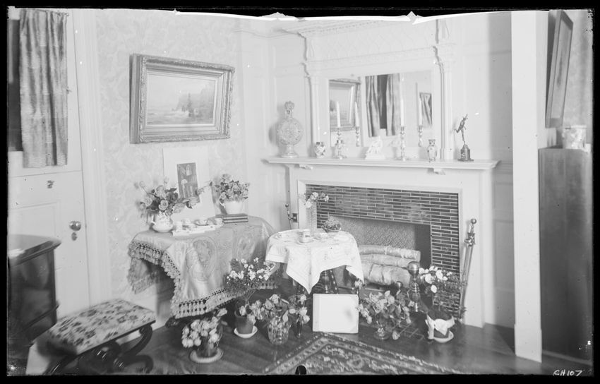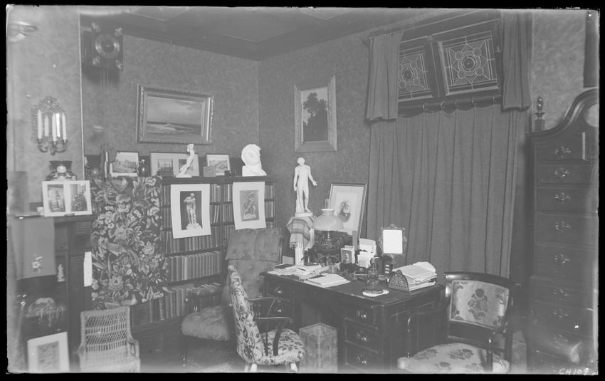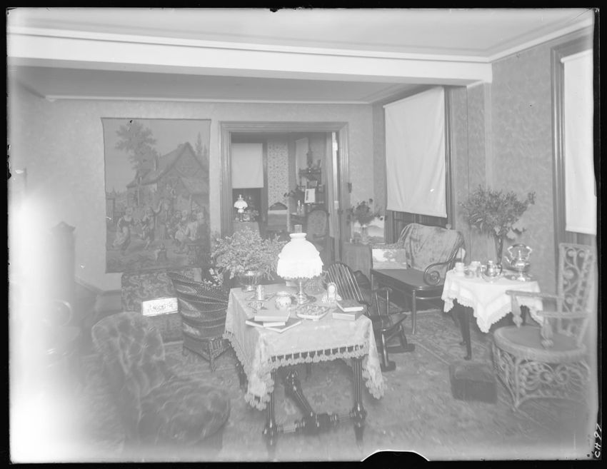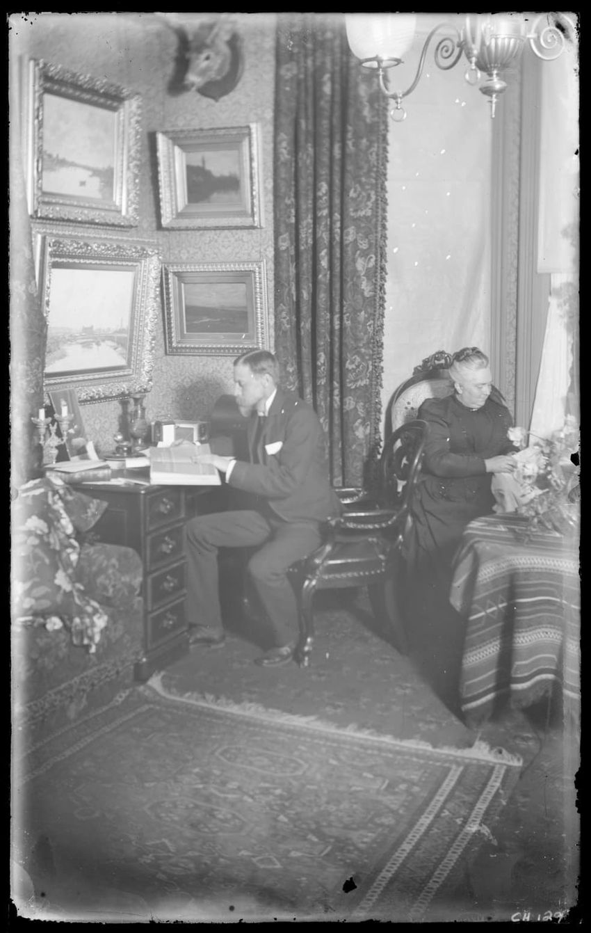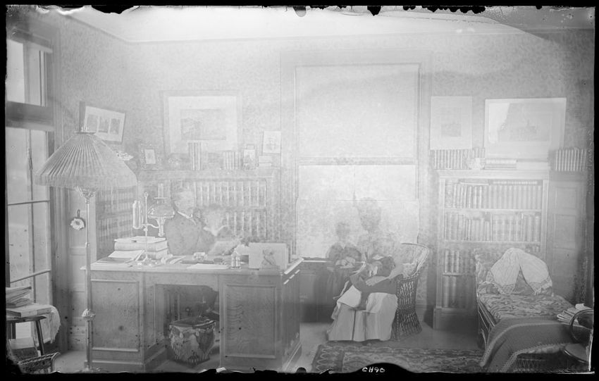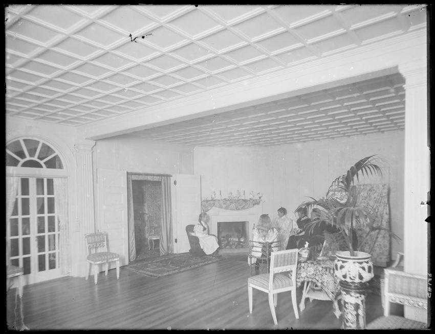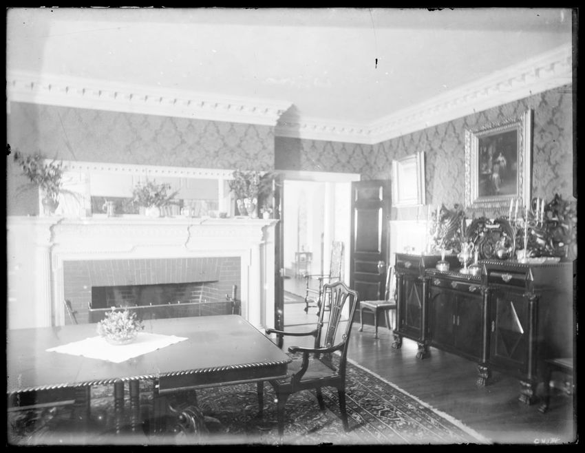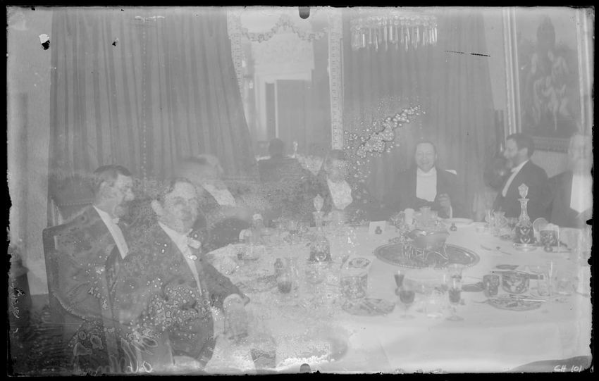 The image shows a group of men seated around a dining table, dressed in formal attire, engaged in a meal. The table is set with various dishes, glassware, and utensils. In the background, two large framed artworks are visible on the wall, along with a chandelier hanging above the table.