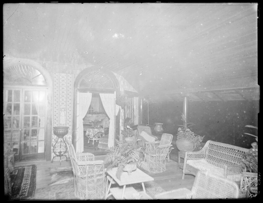 The image shows four women in an ornate interior setting. One woman is seated at a piano, while two others stand nearby, one of whom is adjusting a curtain. Another woman is seated at a desk, which is adorned with candlesticks and other objects. The room features decorative curtains, framed artwork,...