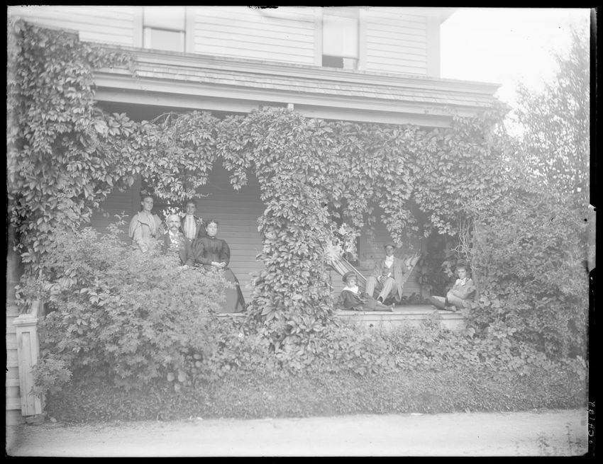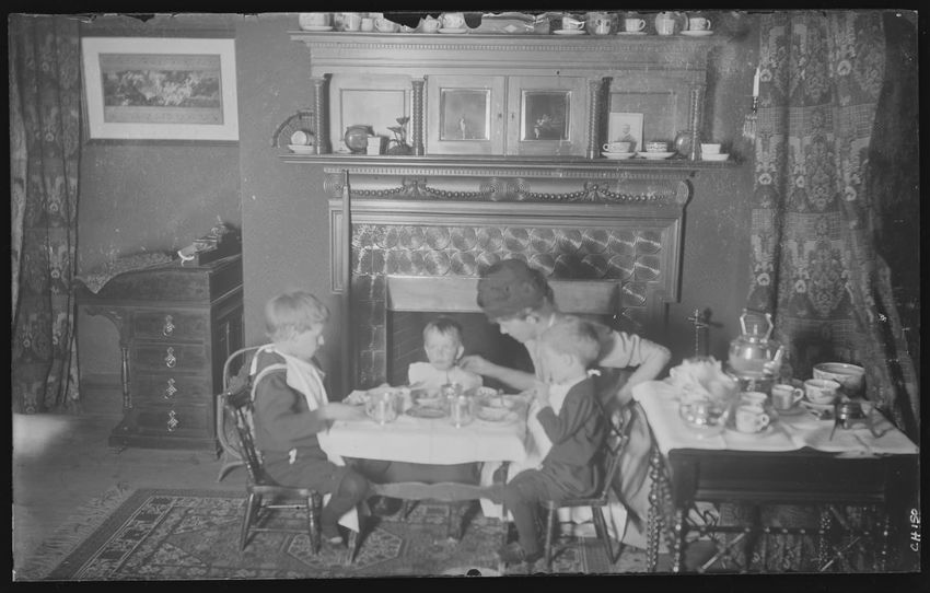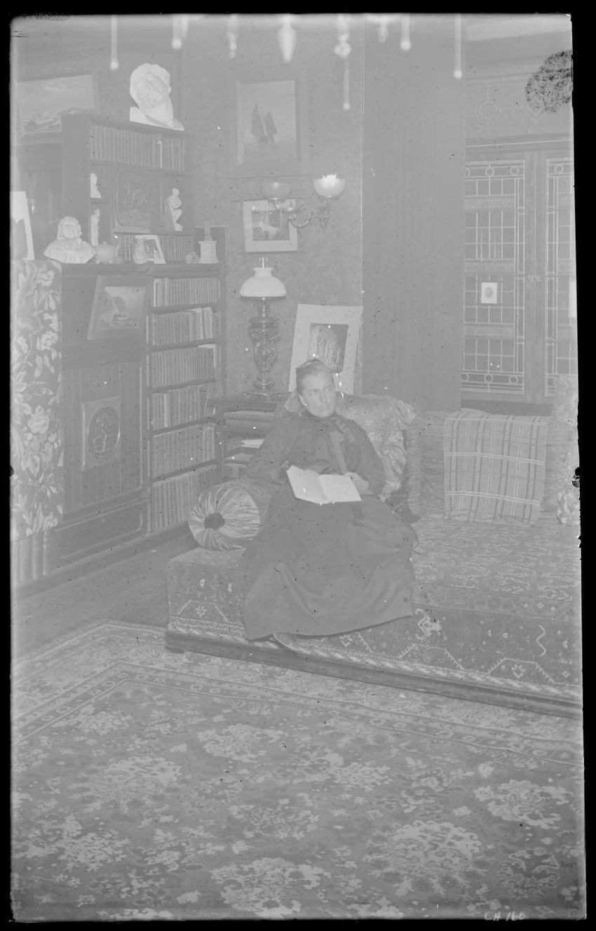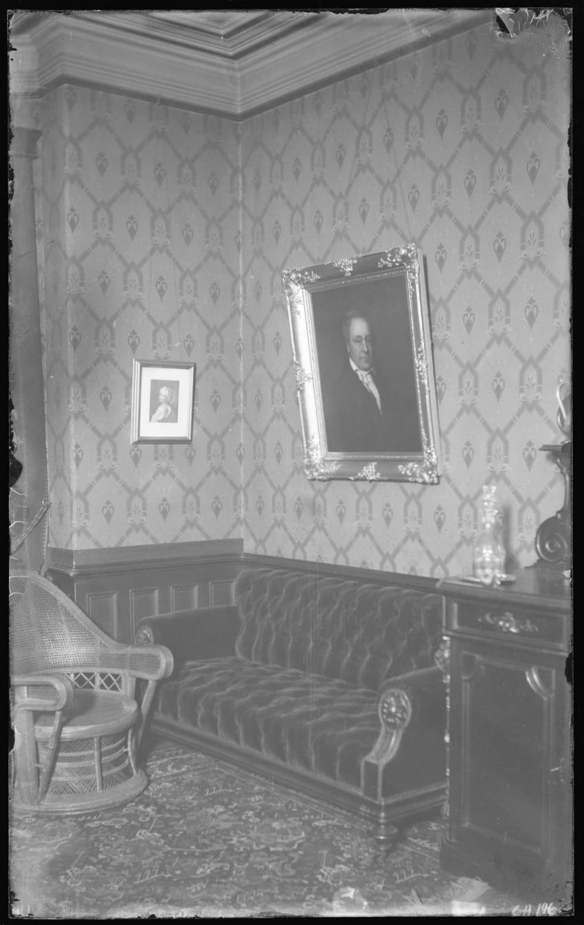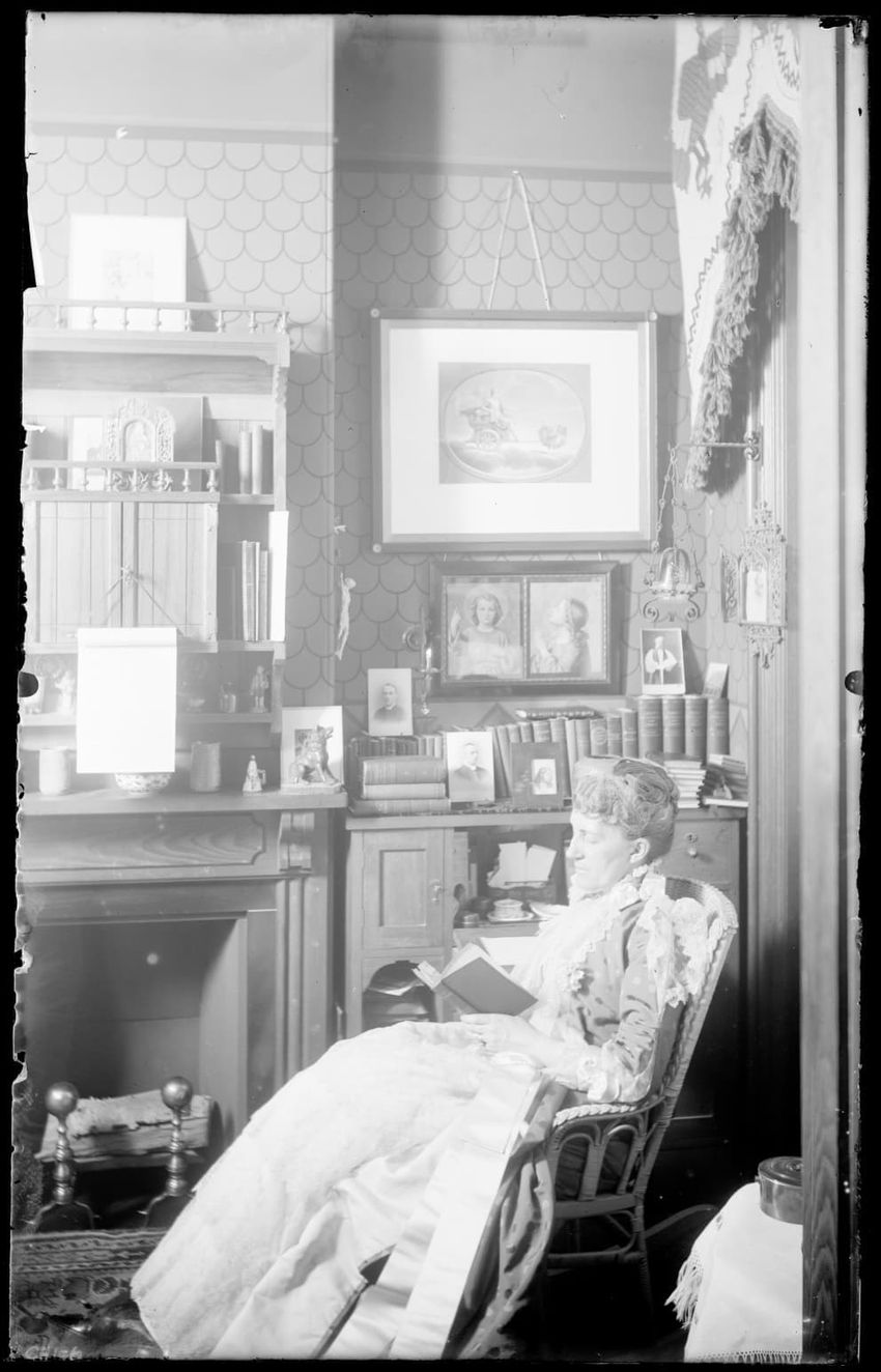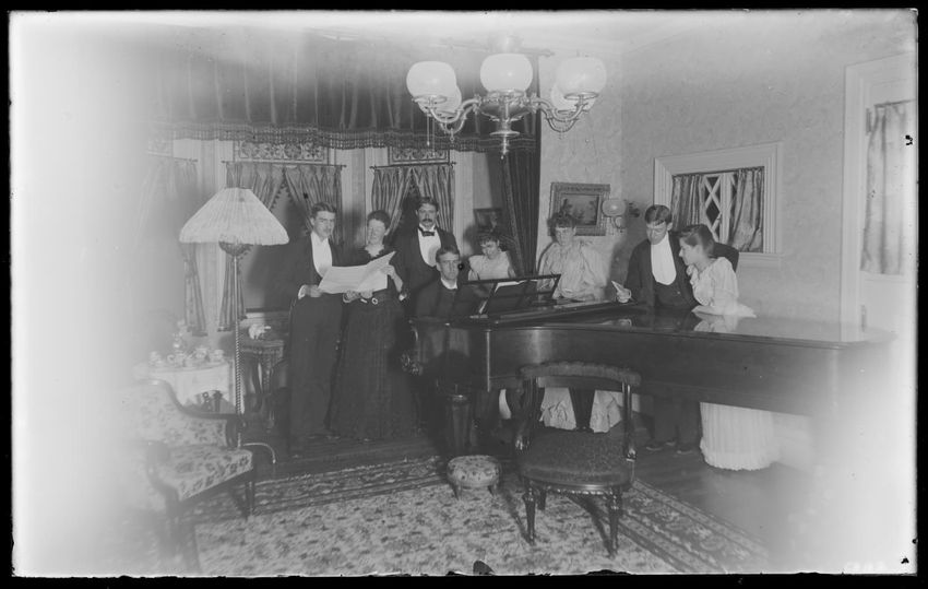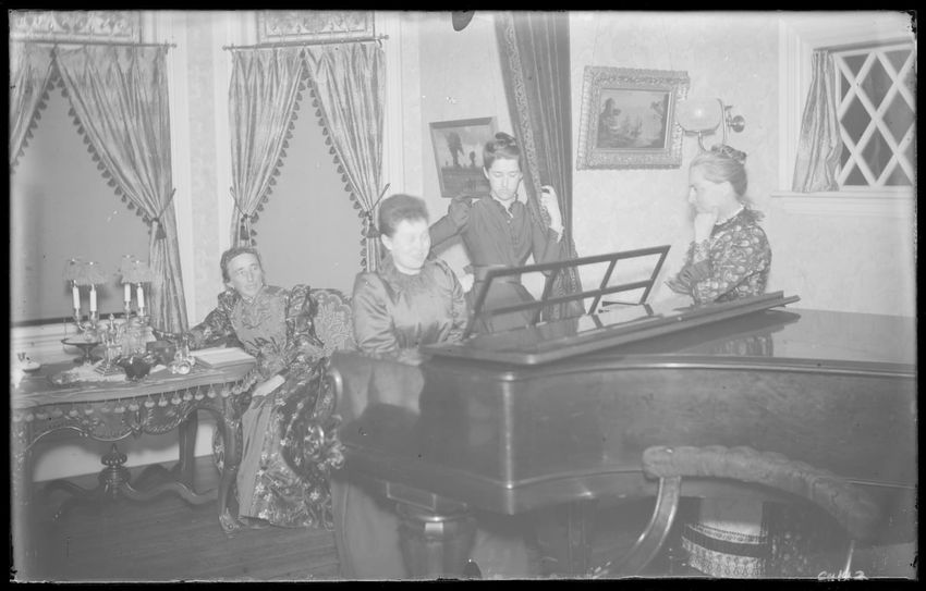 The image shows four women in an ornate interior setting. One woman is seated at a piano, while two others stand nearby, one of whom is adjusting a curtain. Another woman is seated at a desk, which is adorned with candlesticks and other objects. The room features decorative curtains, framed artwork,...