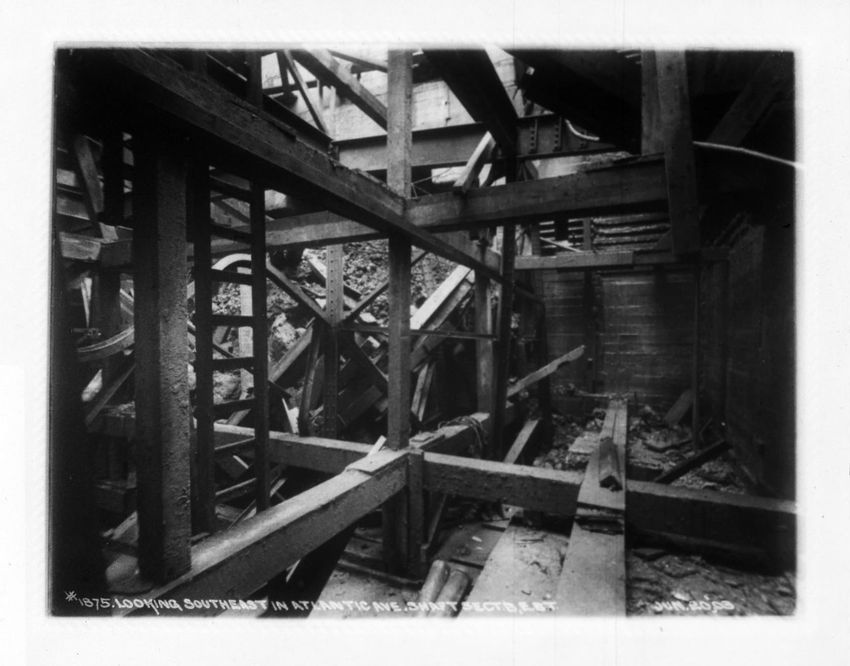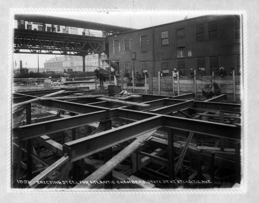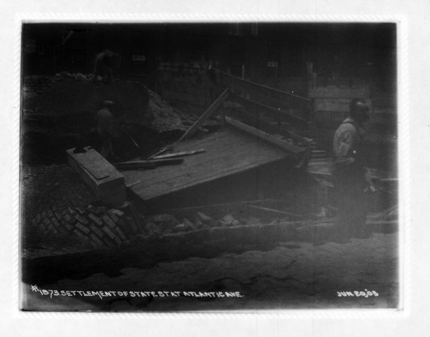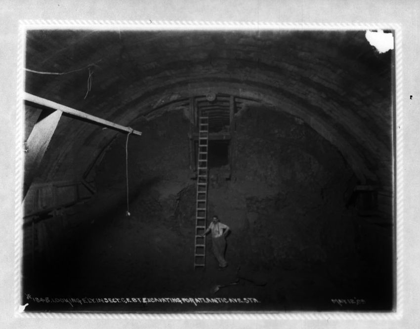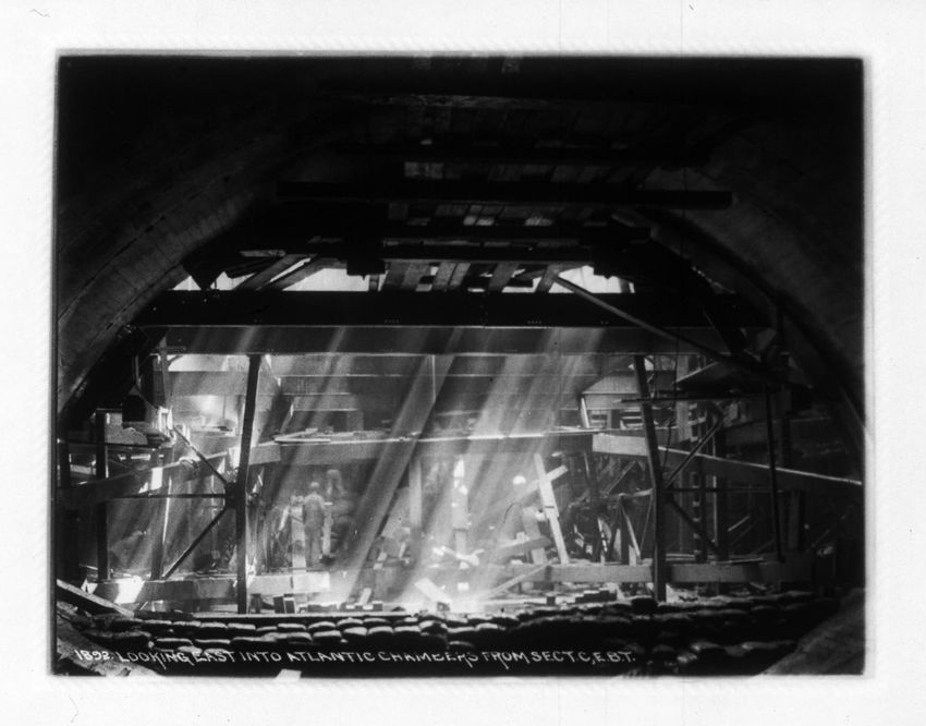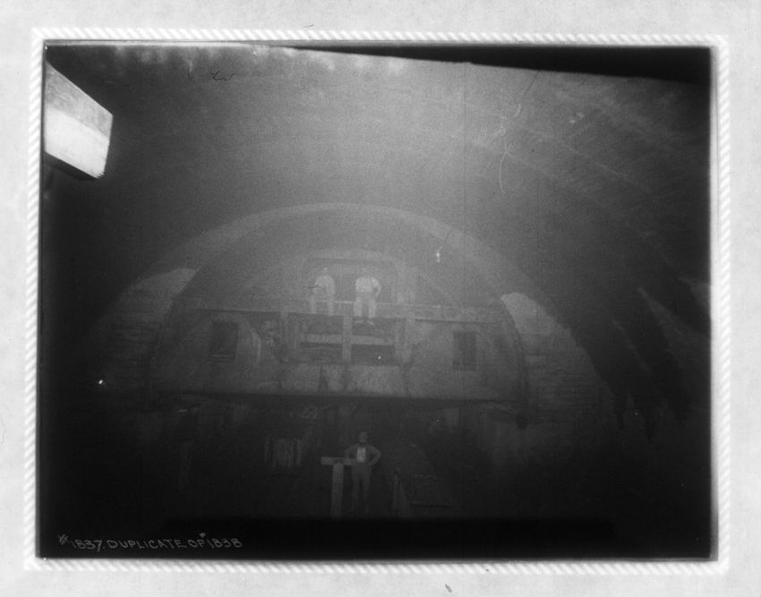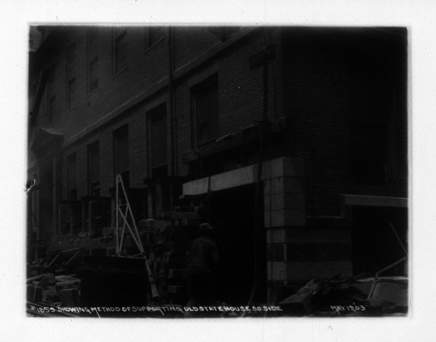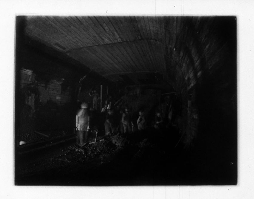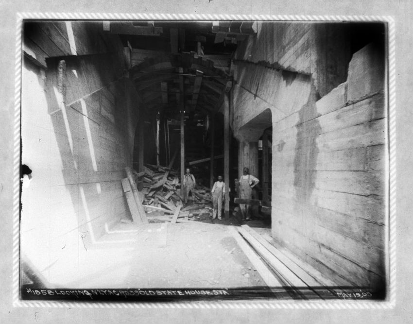 Three workmen face the camera in the State Street Subway Station in the Old State House.