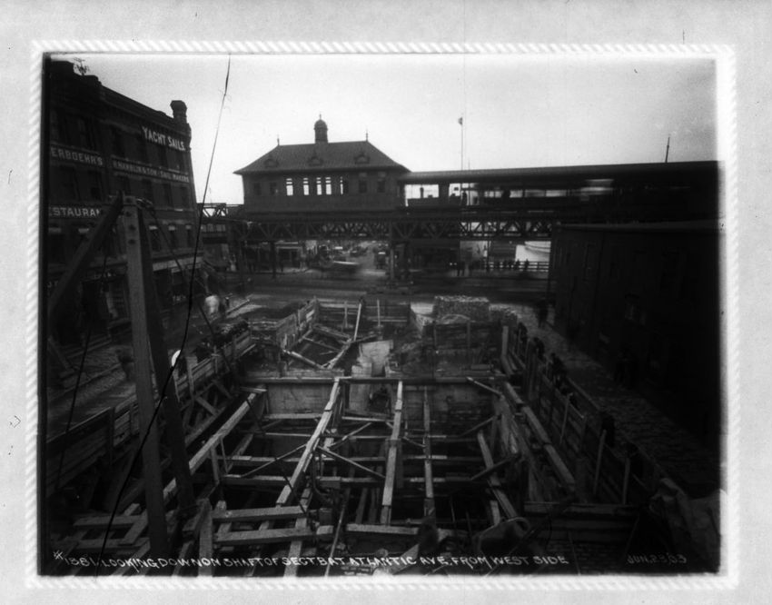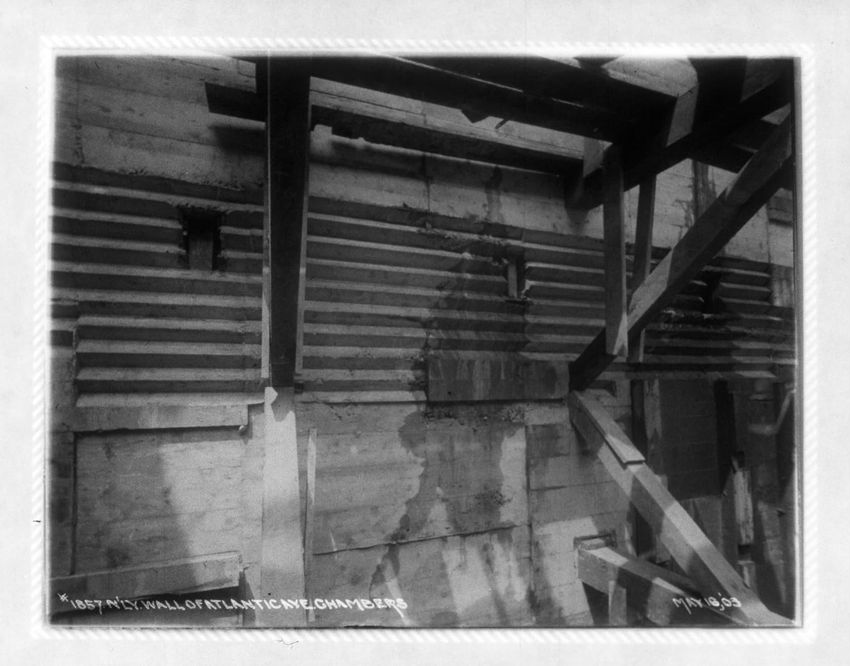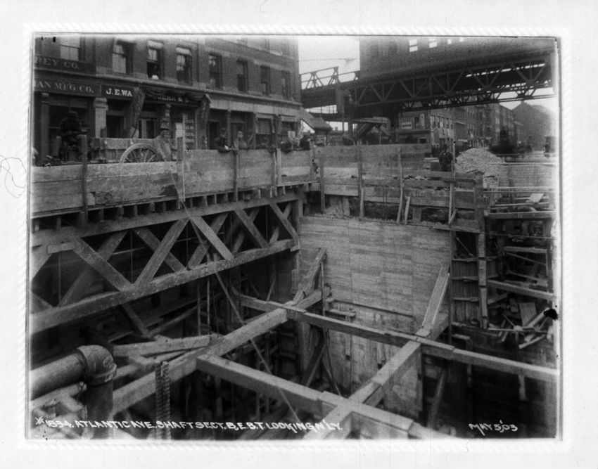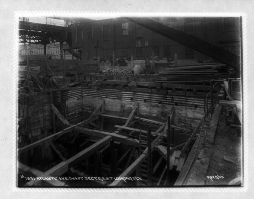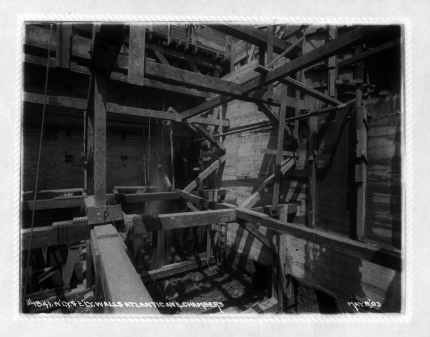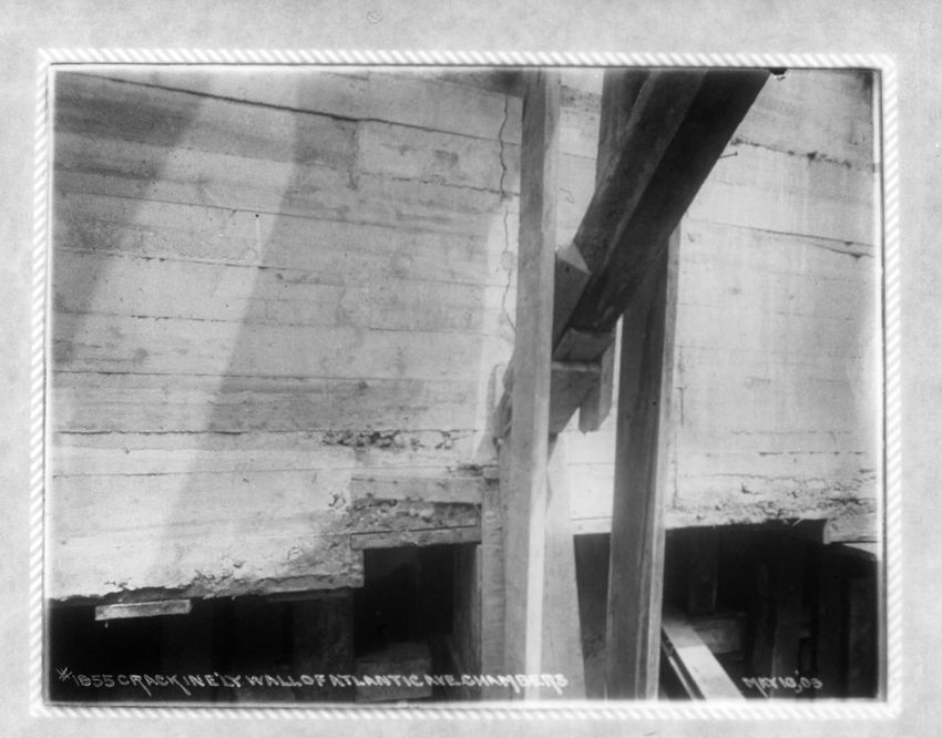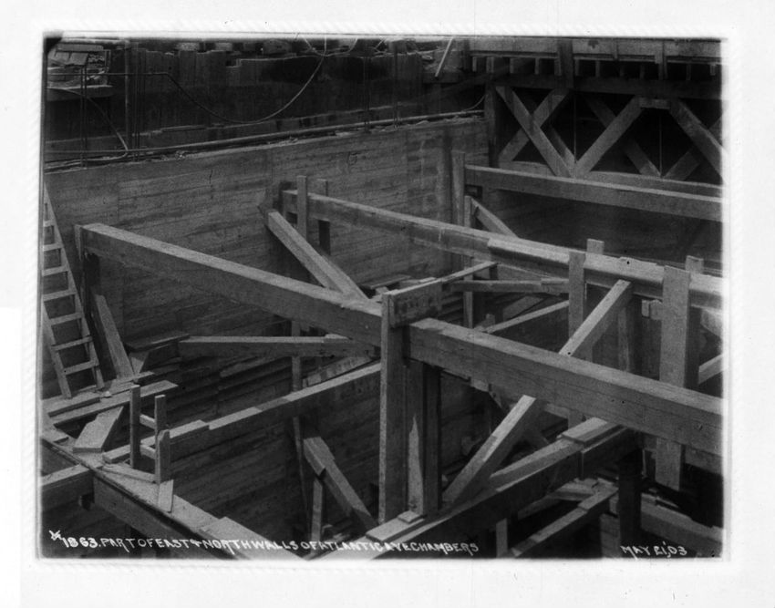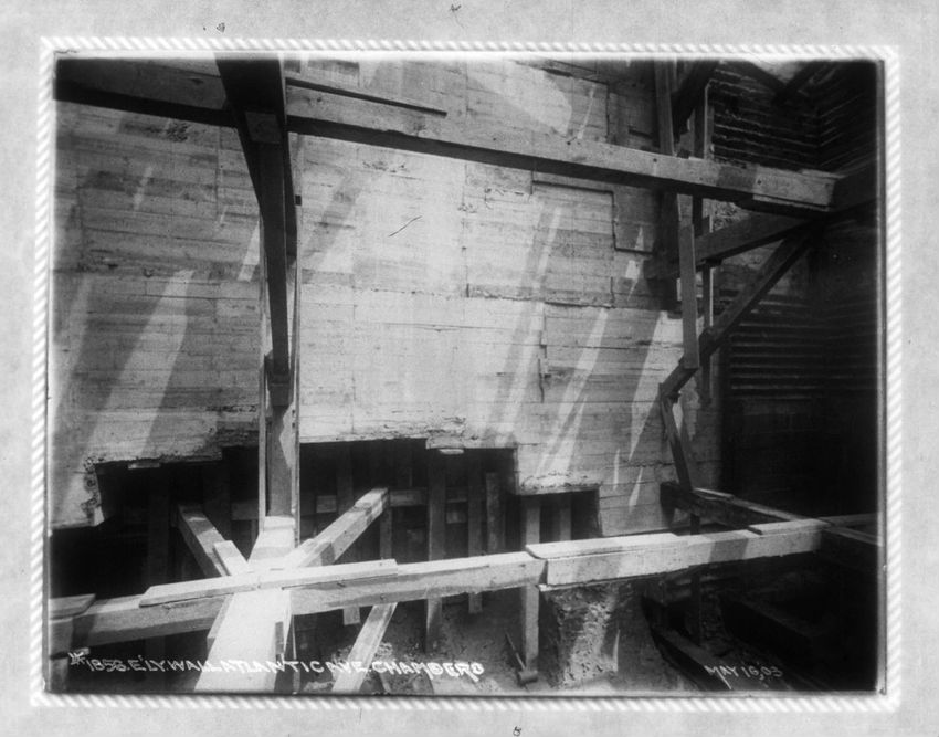 Three workmen face the camera in the State Street Subway Station in the Old State House.