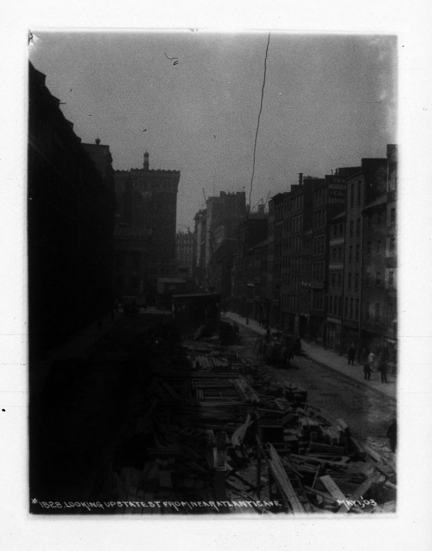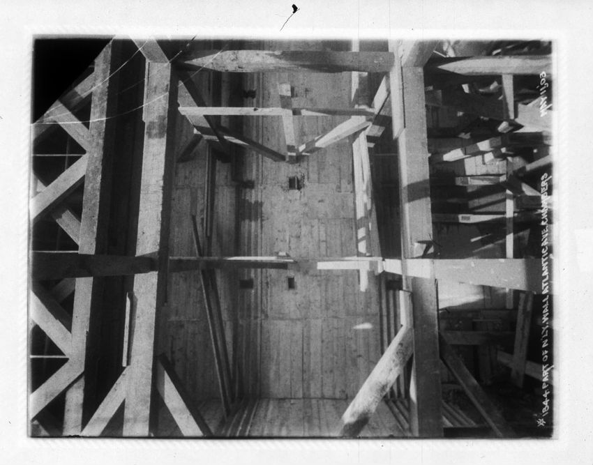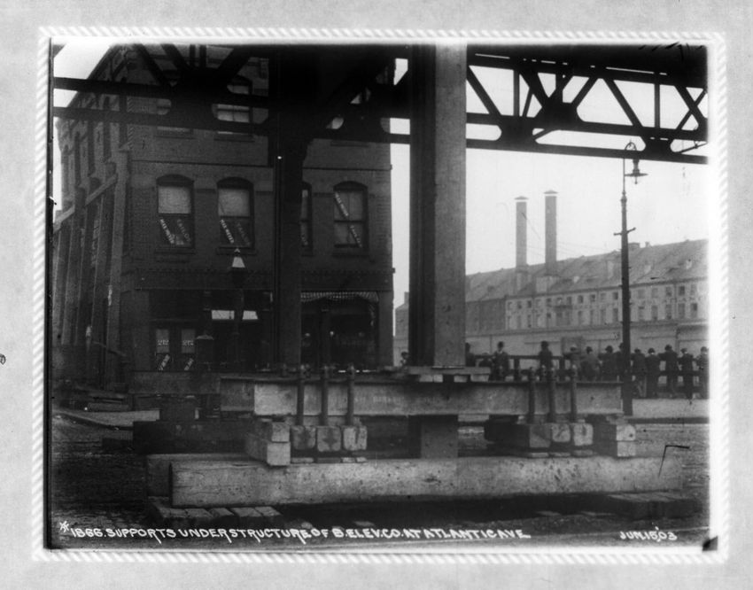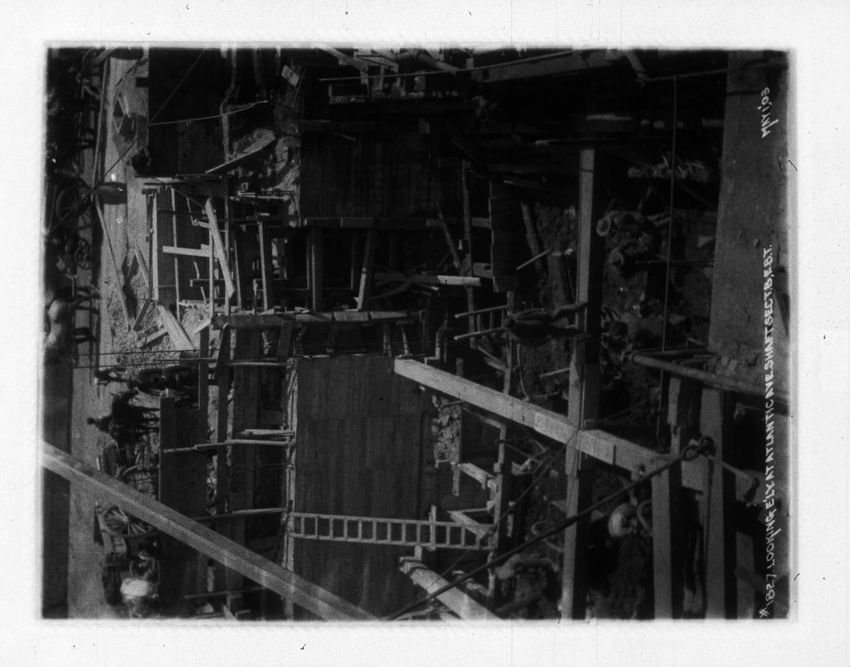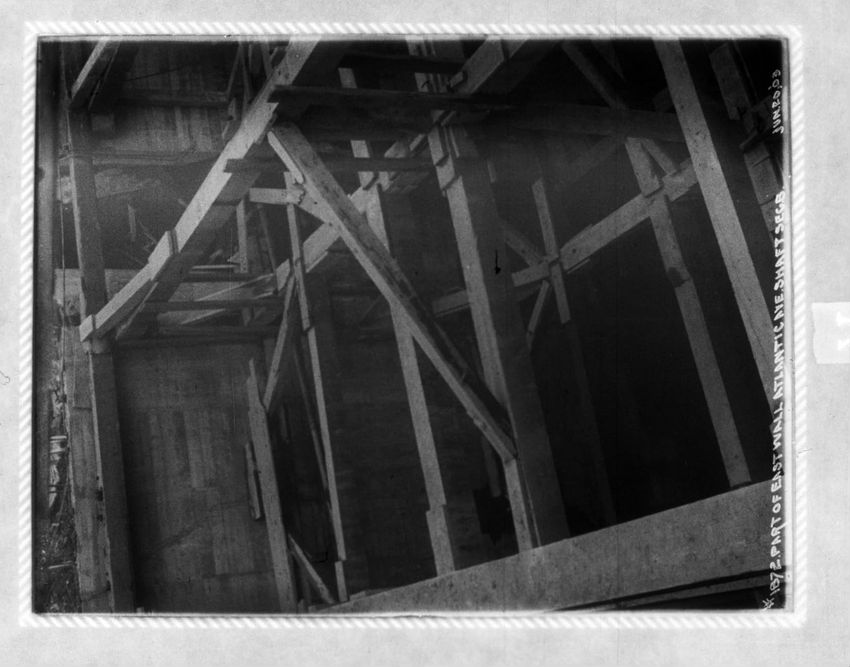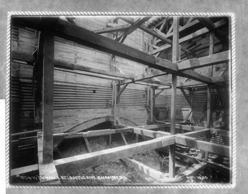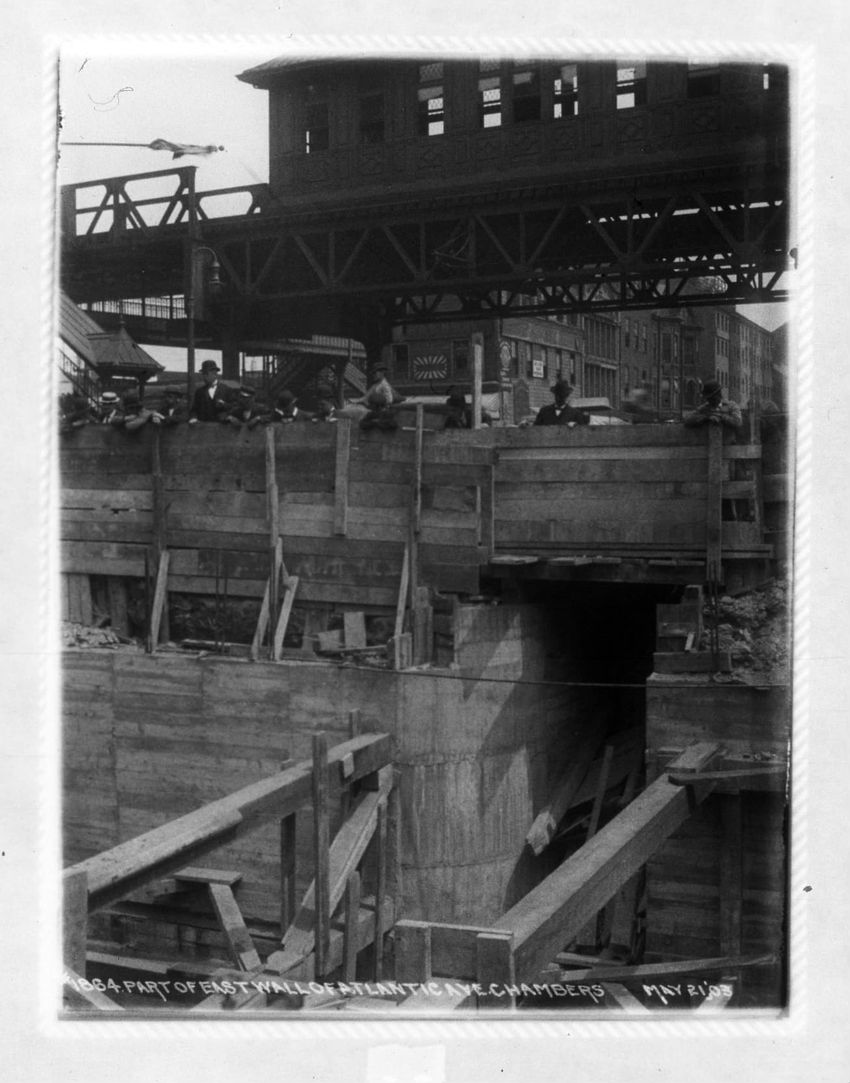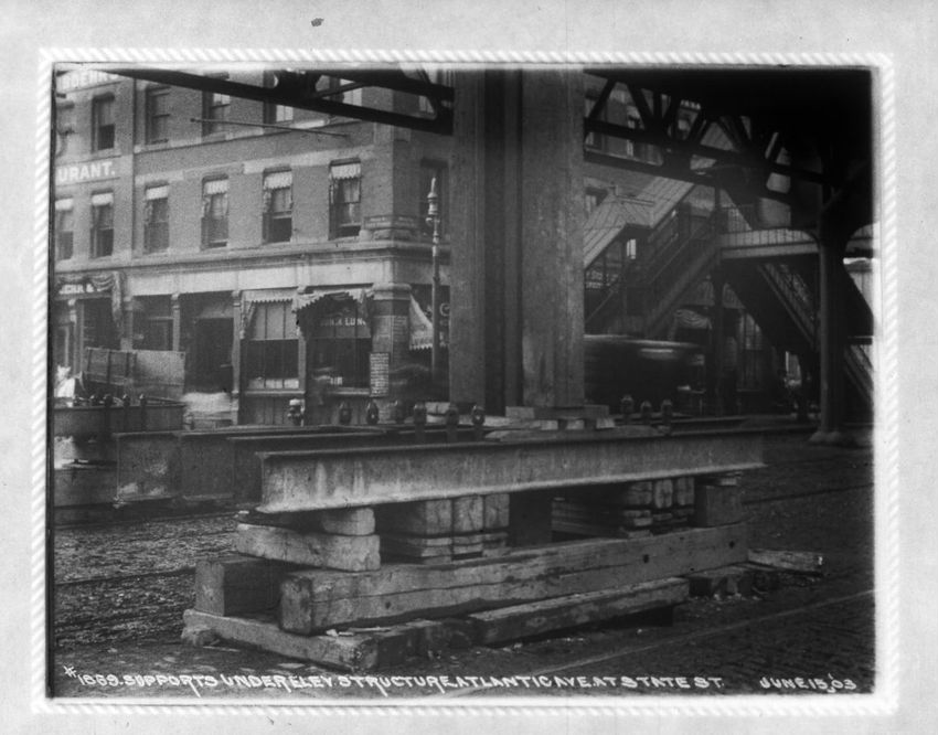 Three workmen face the camera in the State Street Subway Station in the Old State House.