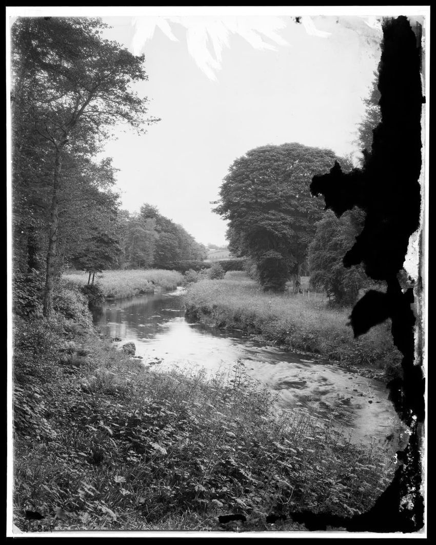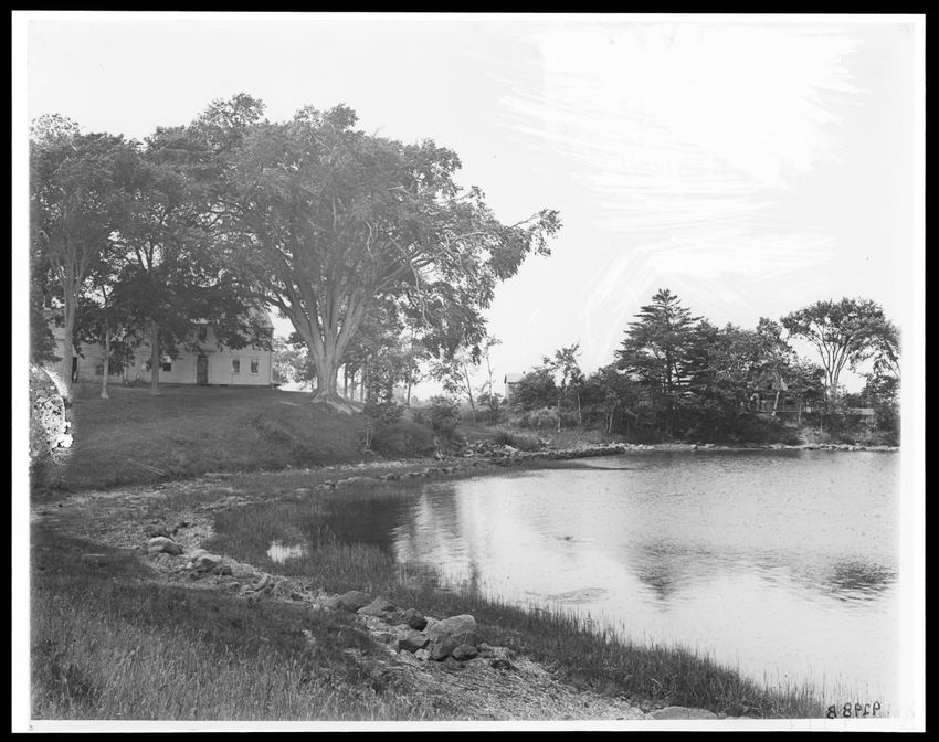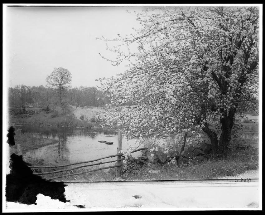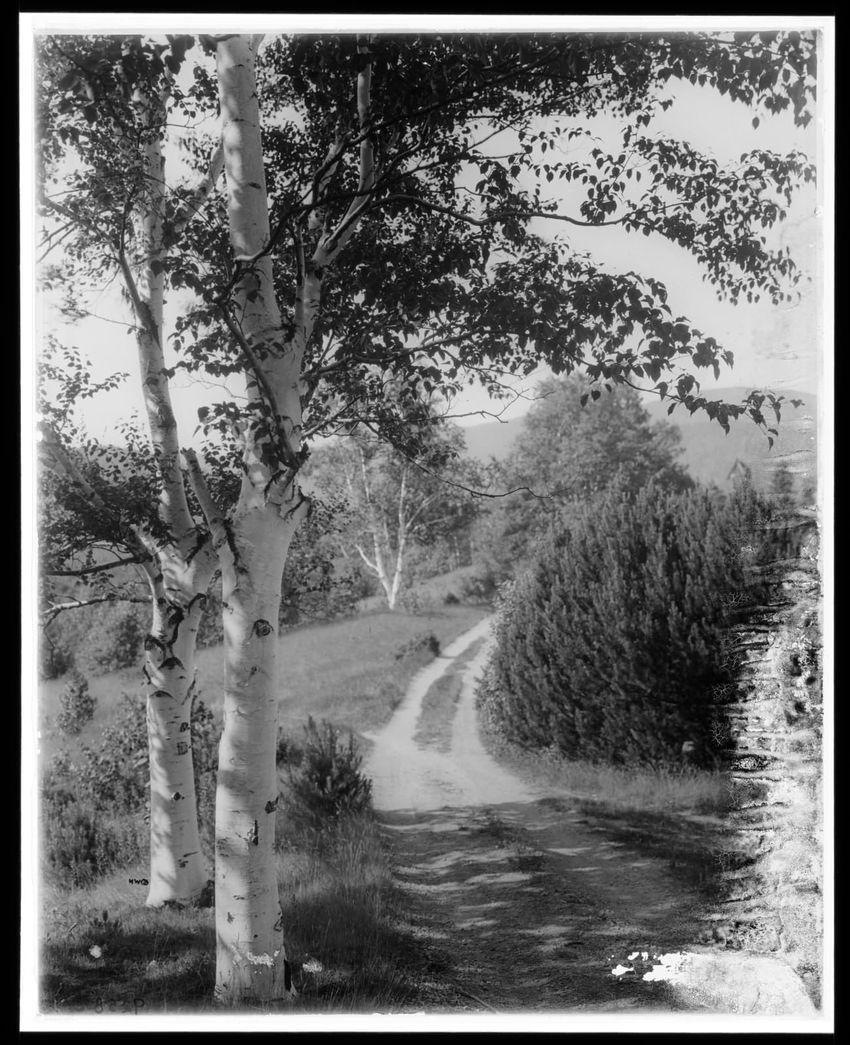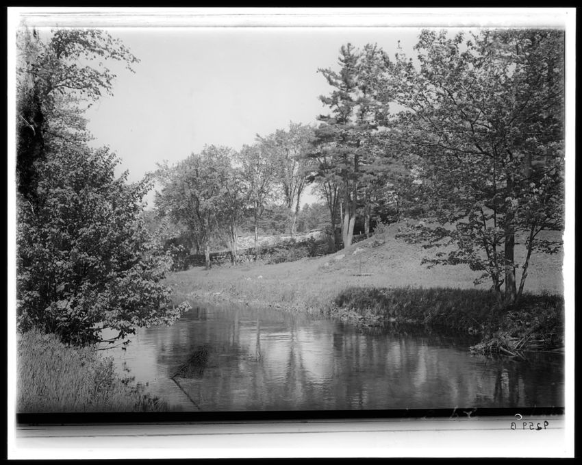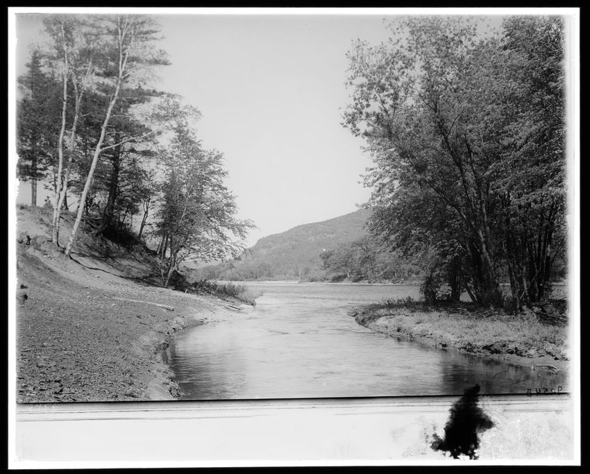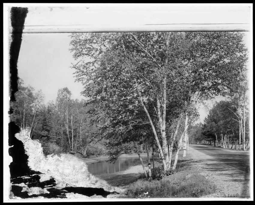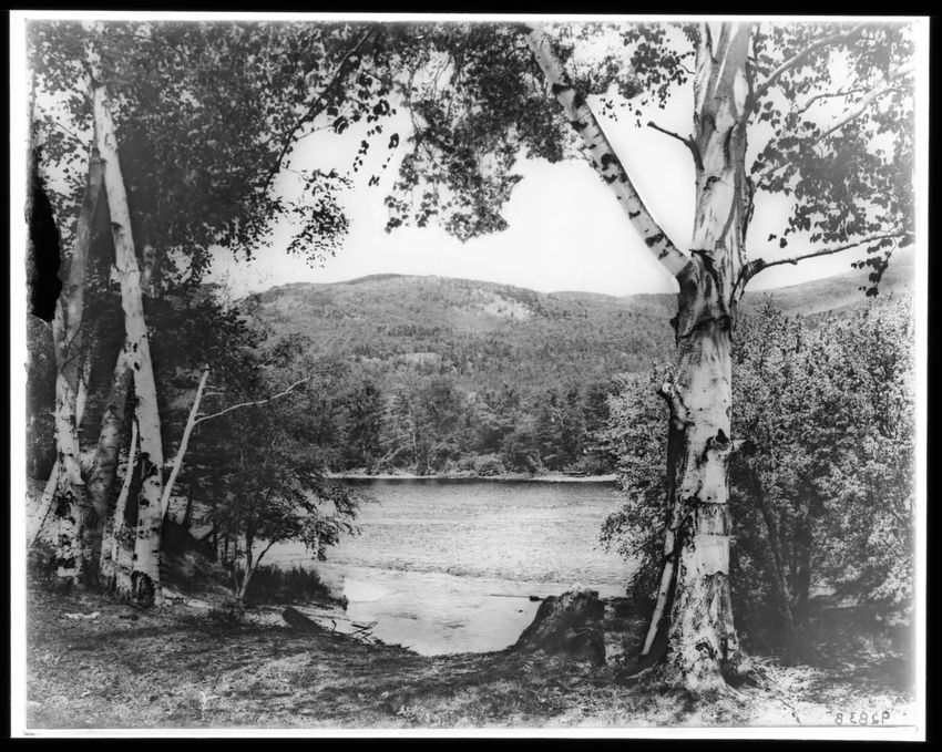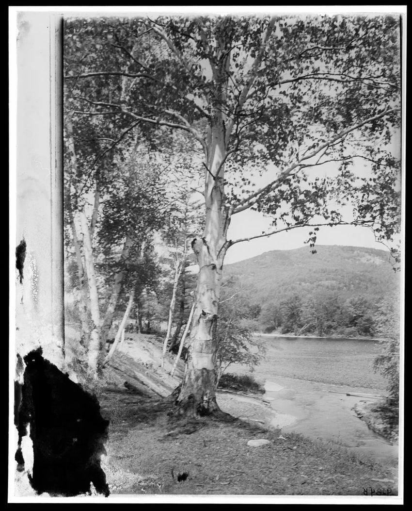 The image depicts a body of water, either a lake or river, situated near a hill. In the foreground, there are several trees, including two prominent birch trees, framing the view. The landscape features lush vegetation both around the water and on the hill in the background.