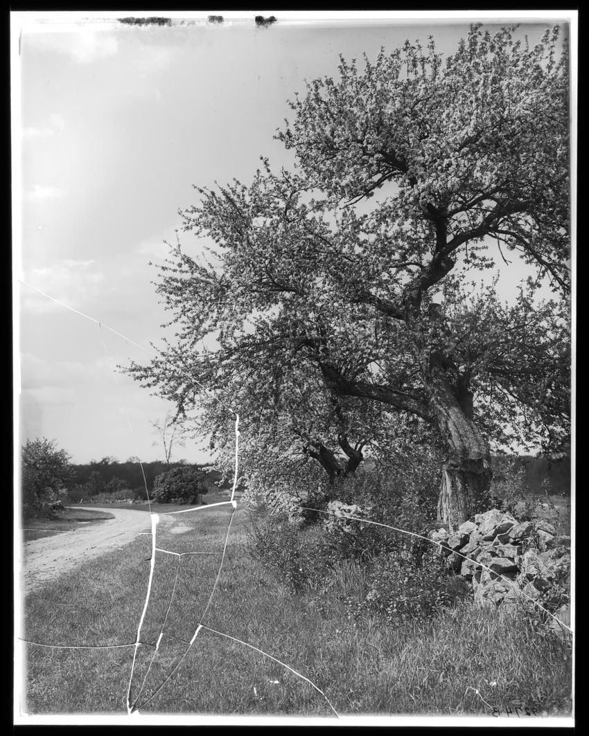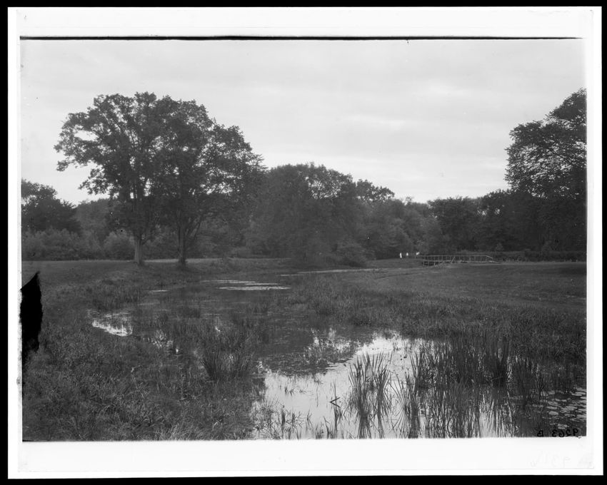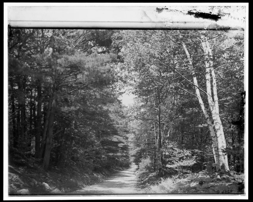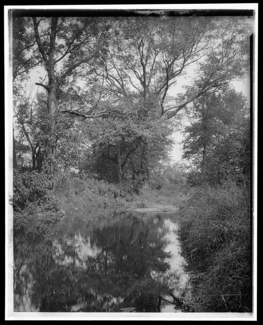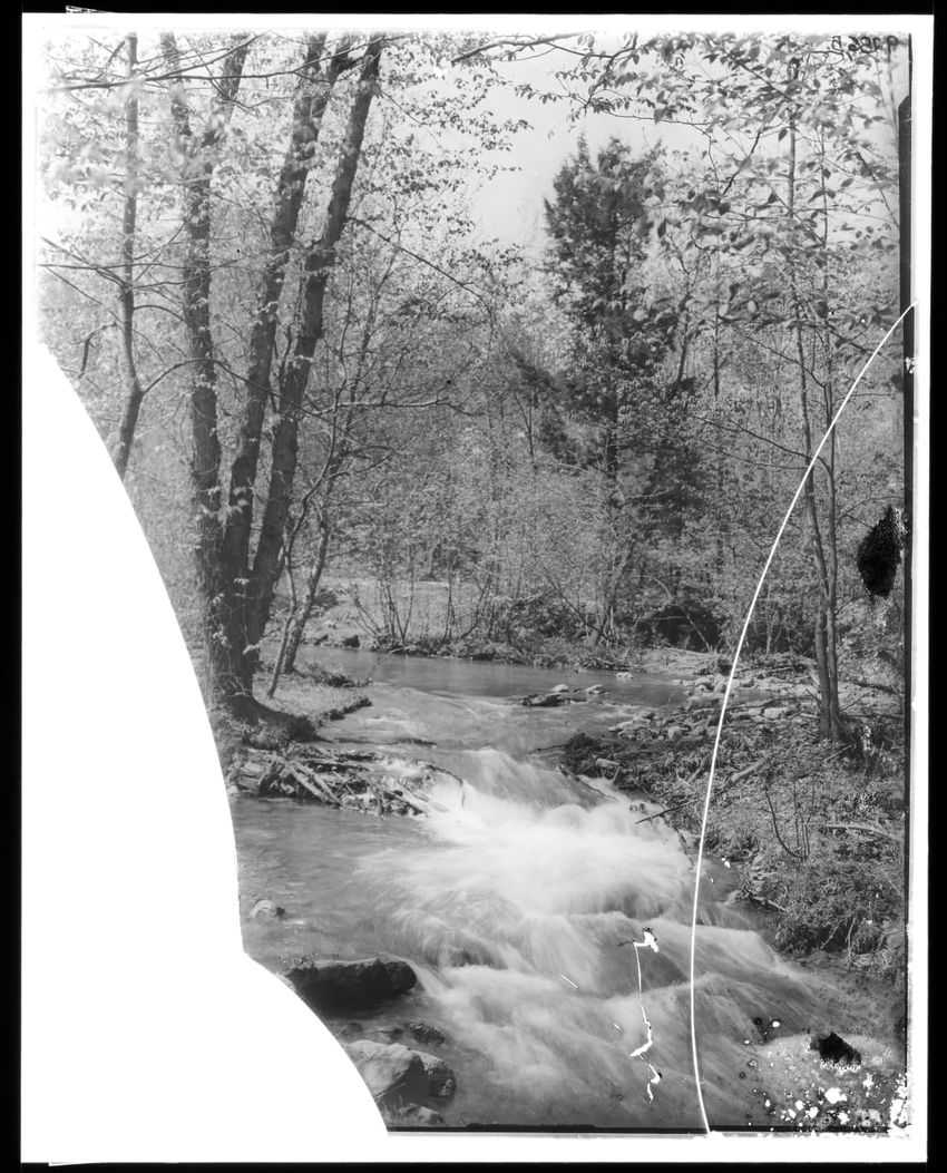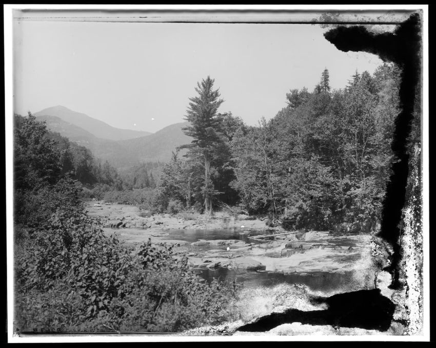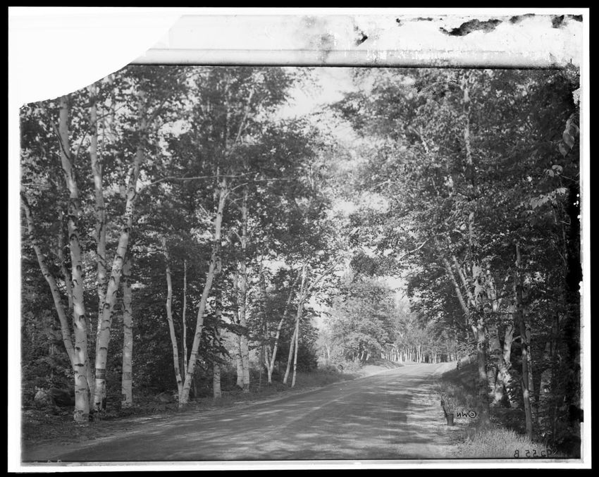The image depicts a body of water, either a lake or river, situated near a hill. In the foreground, there are several trees, including two prominent birch trees, framing the view. The landscape features lush vegetation both around the water and on the hill in the background.
