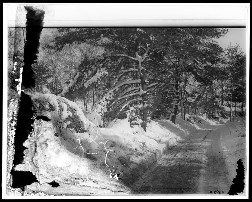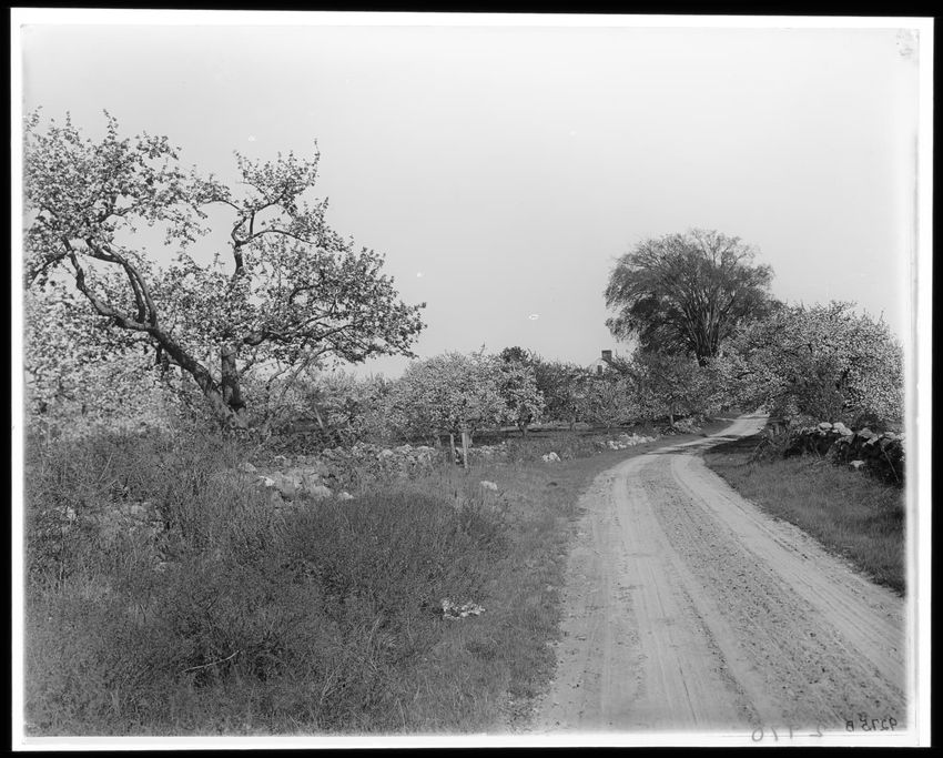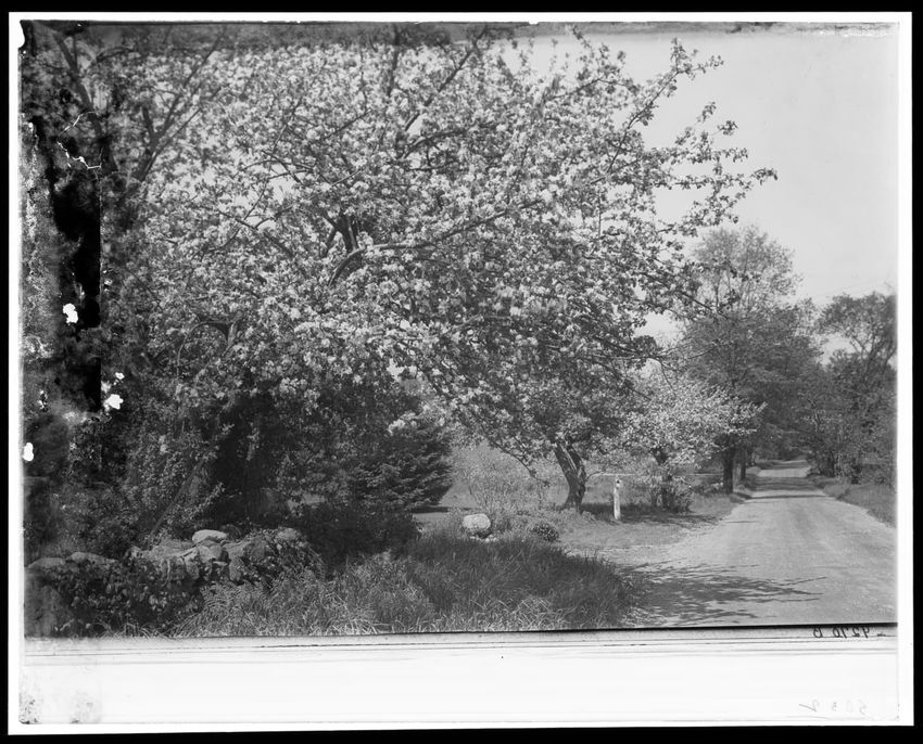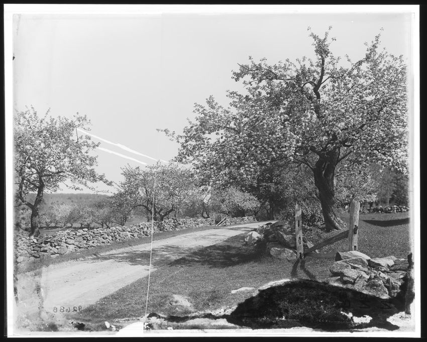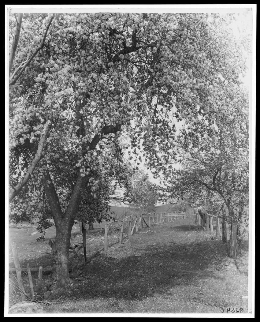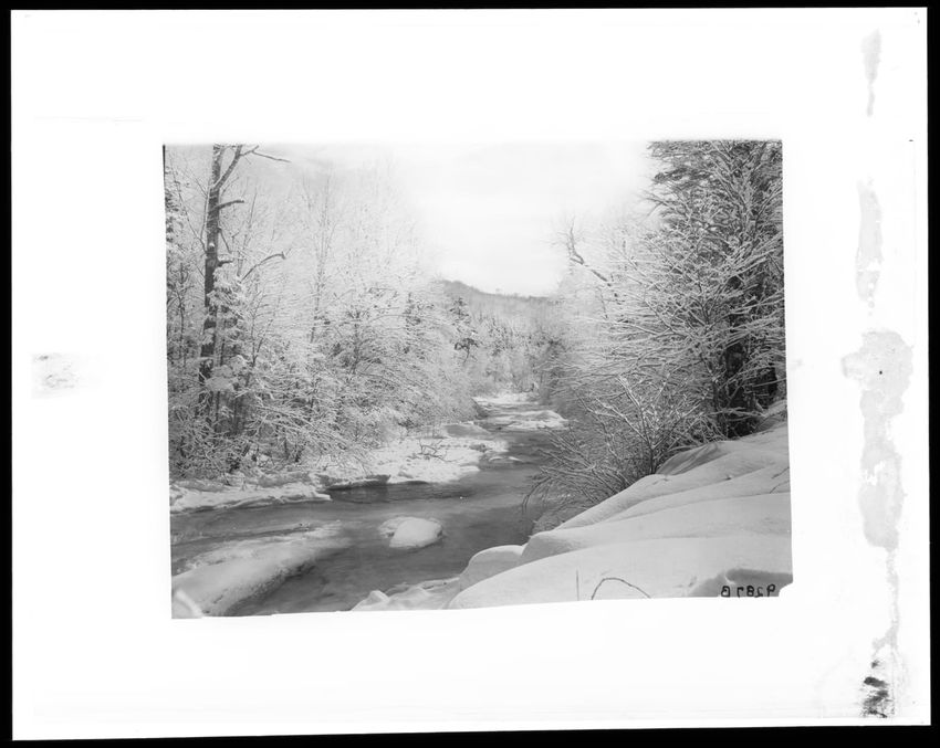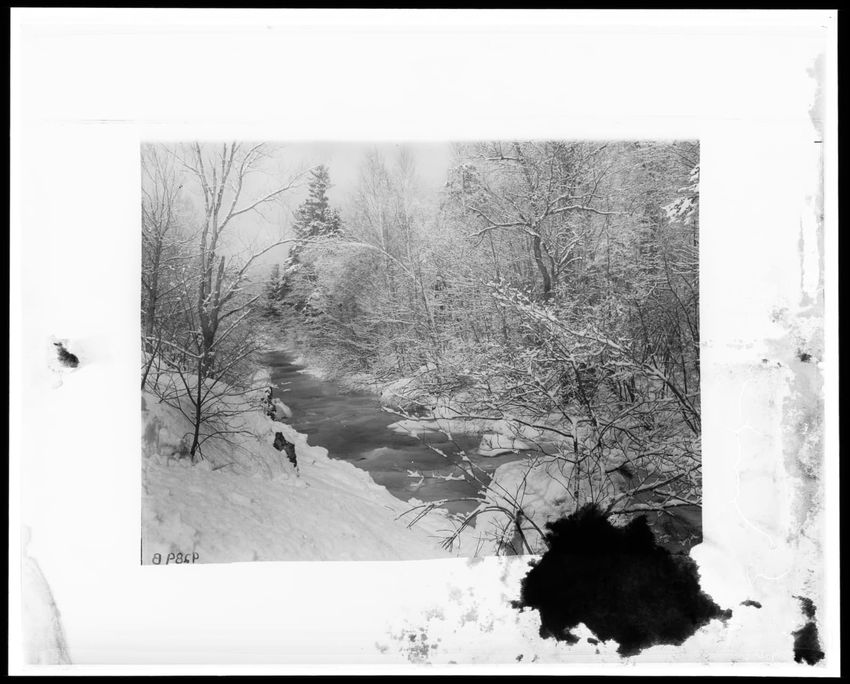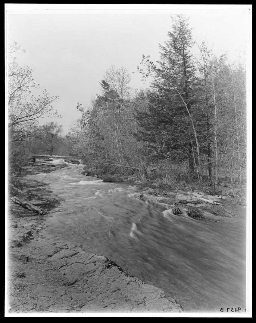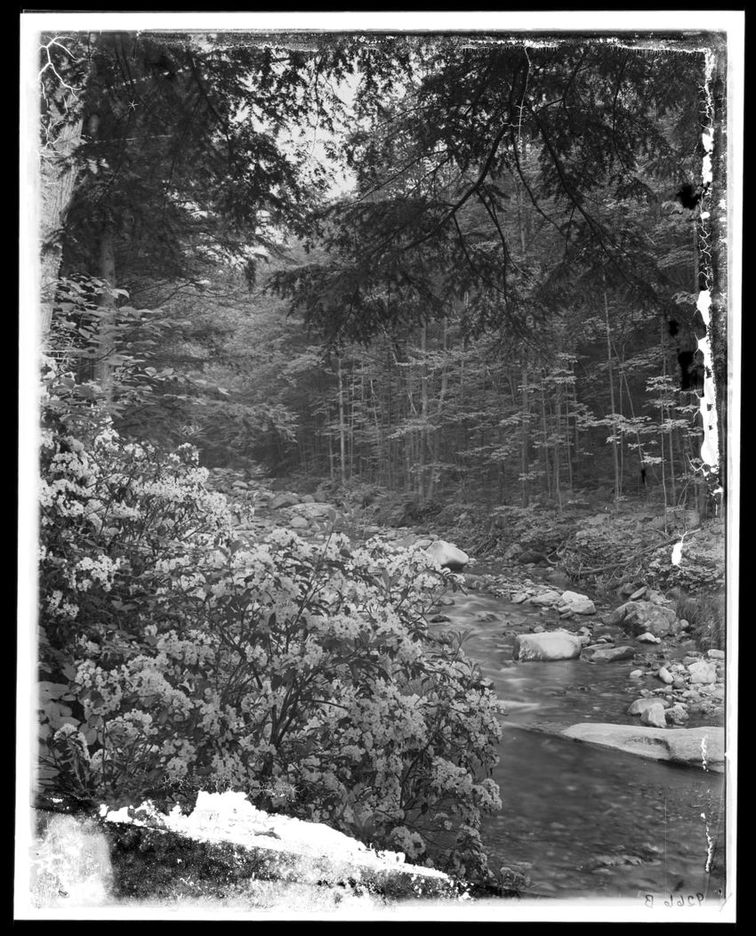 The image depicts a body of water, either a lake or river, situated near a hill. In the foreground, there are several trees, including two prominent birch trees, framing the view. The landscape features lush vegetation both around the water and on the hill in the background.