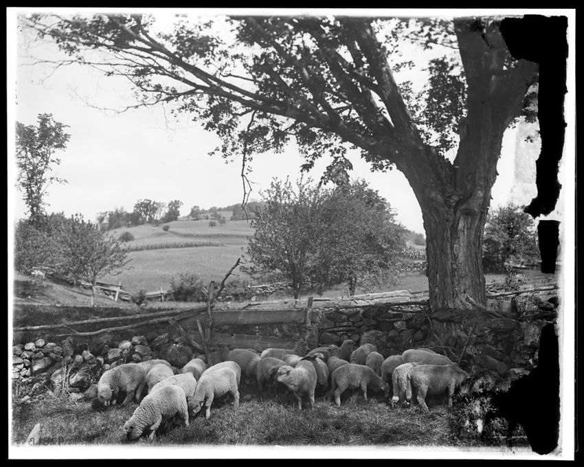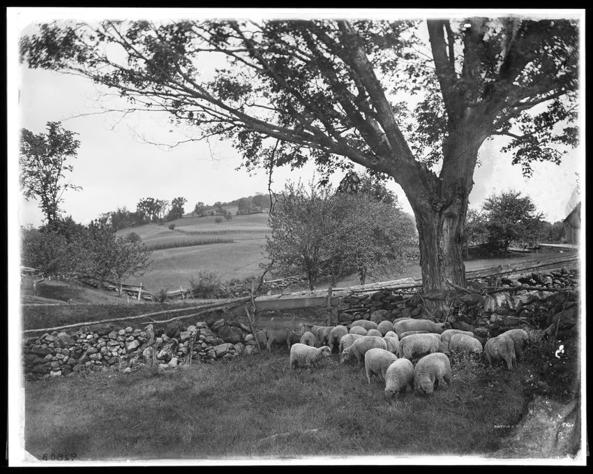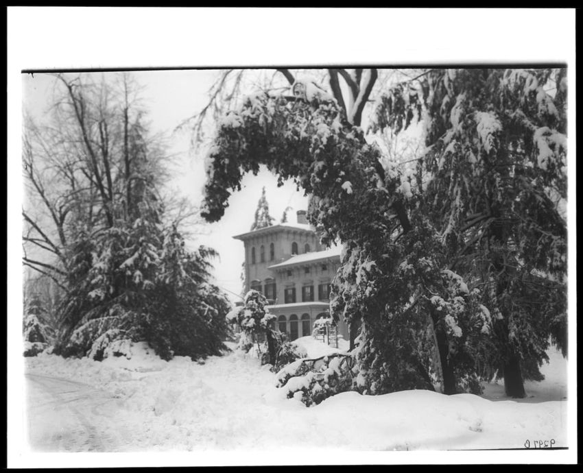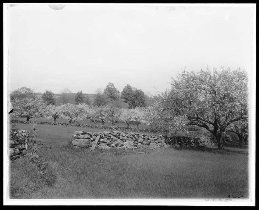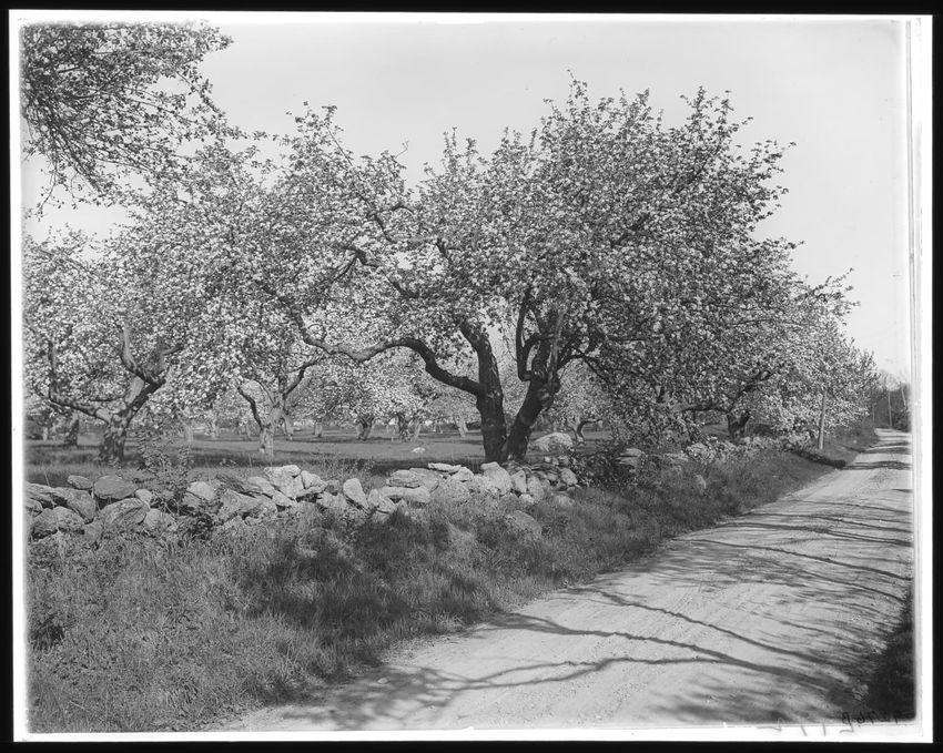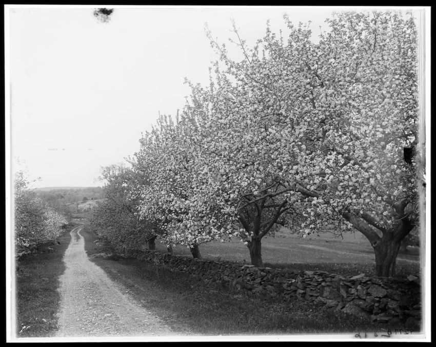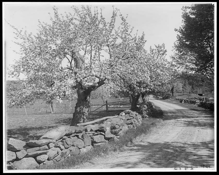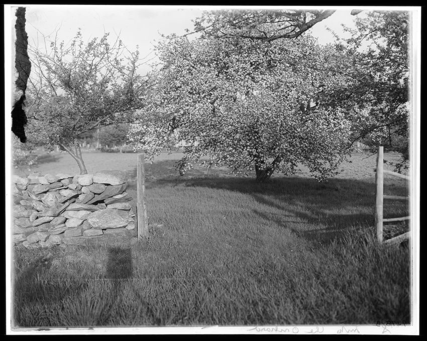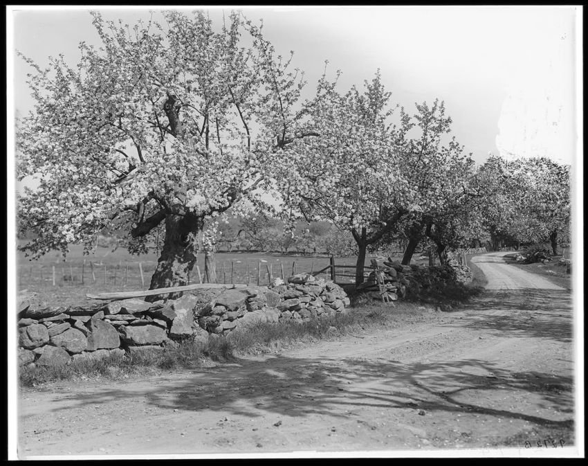 The image depicts a body of water, either a lake or river, situated near a hill. In the foreground, there are several trees, including two prominent birch trees, framing the view. The landscape features lush vegetation both around the water and on the hill in the background.