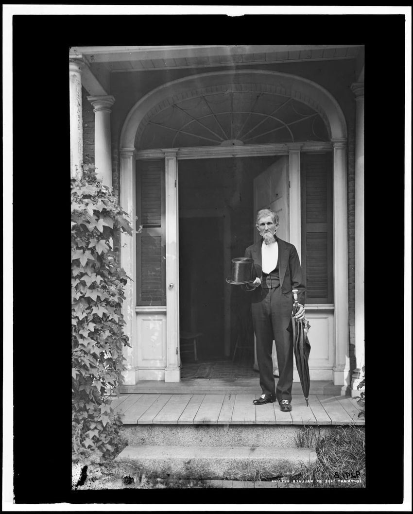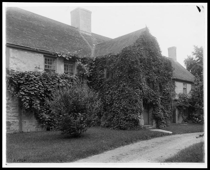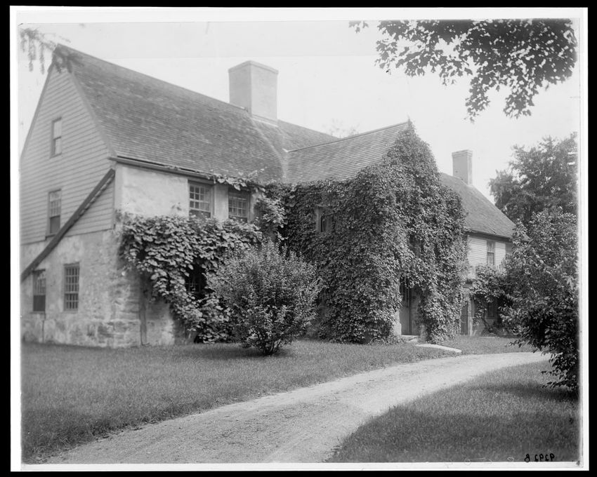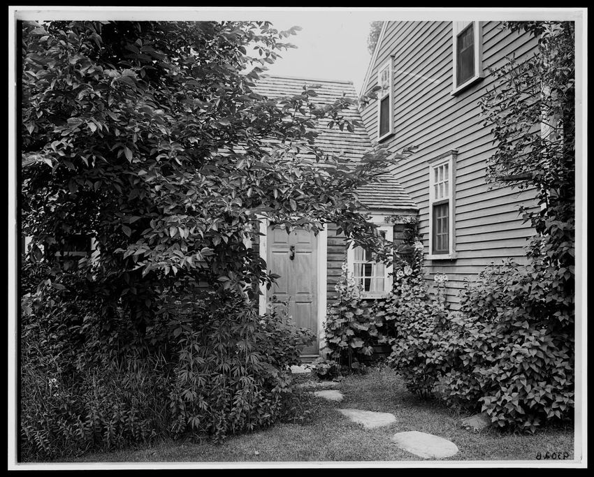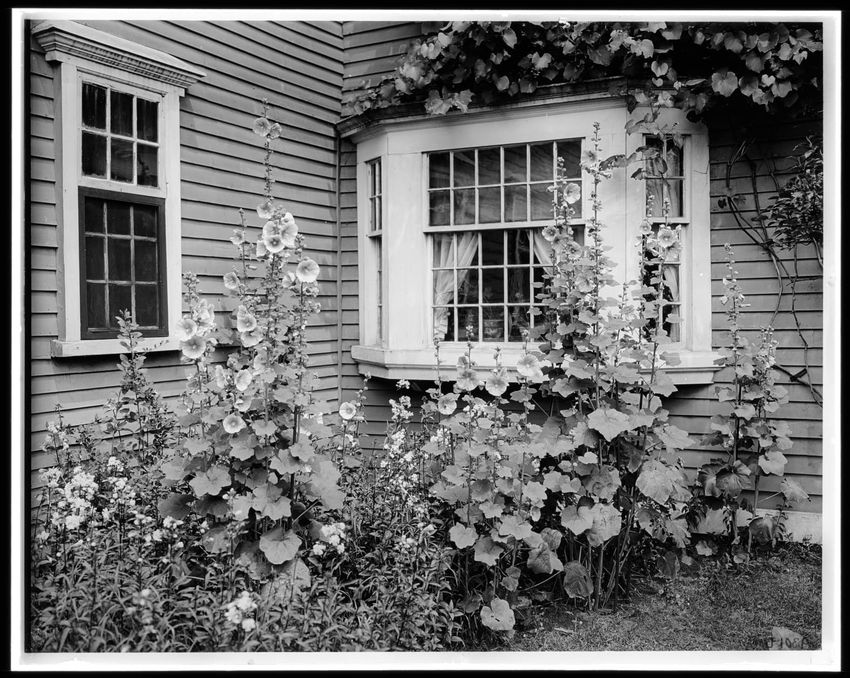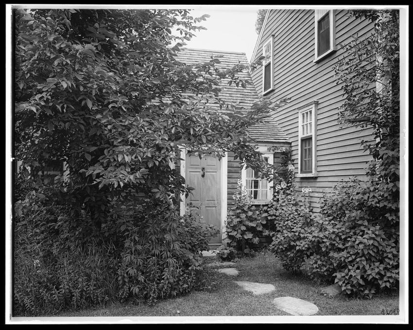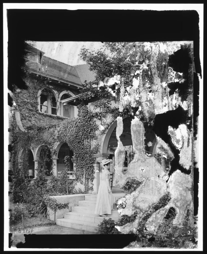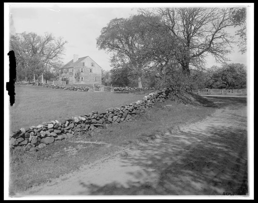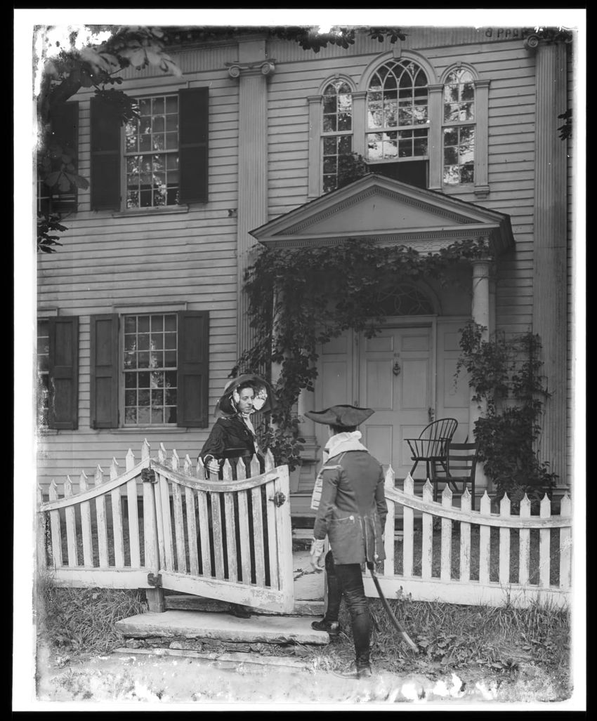 The image depicts a body of water, either a lake or river, situated near a hill. In the foreground, there are several trees, including two prominent birch trees, framing the view. The landscape features lush vegetation both around the water and on the hill in the background.
