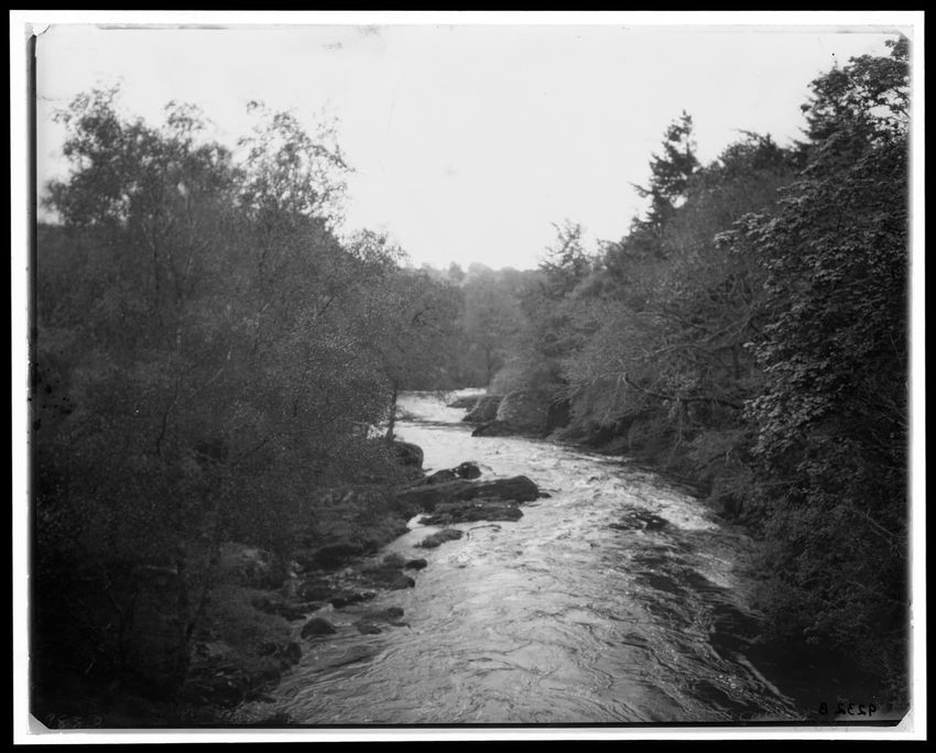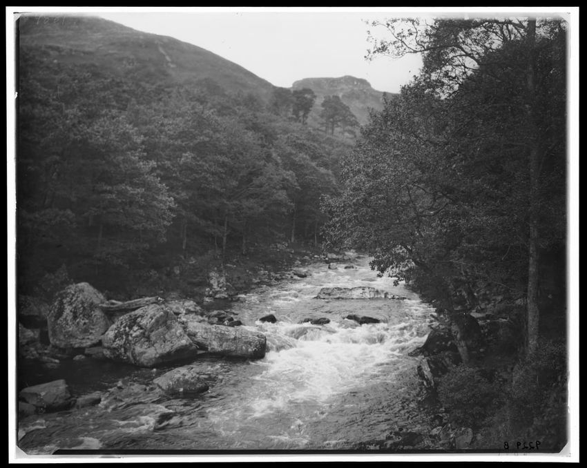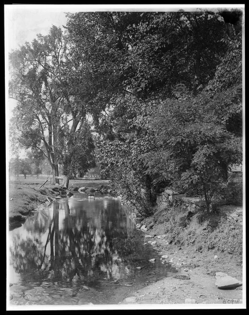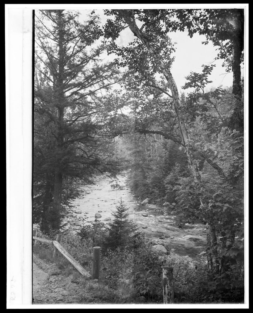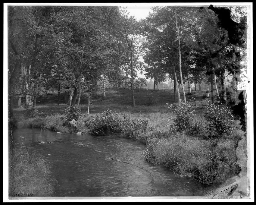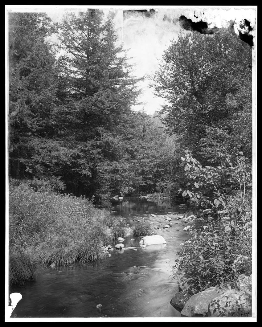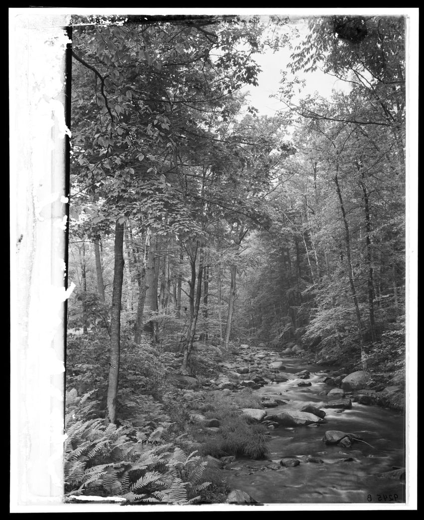 The image depicts a wooded area featuring a stream flowing through the middle. The banks of the stream are lined with rocks, ferns, and dense trees. The trees arch over the stream, forming a canopy.