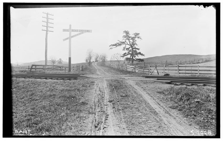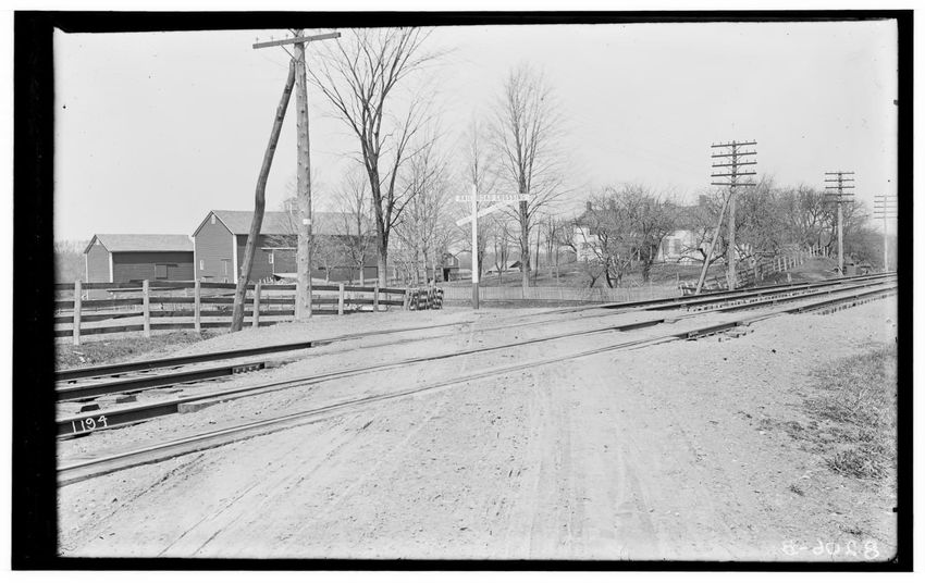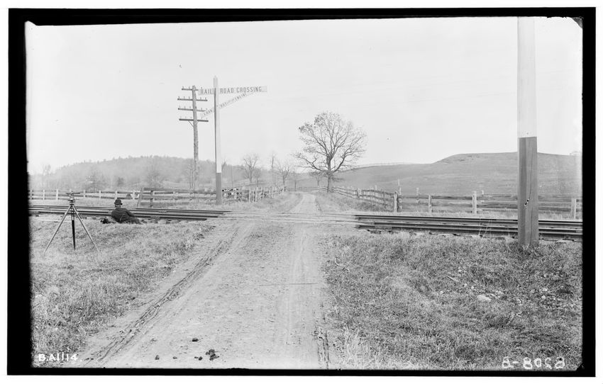 The image depicts Schermerhorn's crossing, located south of the railroad tracks in Schodack, New York. It features a dirt road, railroad tracks, and a "RAILROAD CROSSING" sign. In the background, there are several utility poles, trees, and a few buildings, including farmhouses or barns.