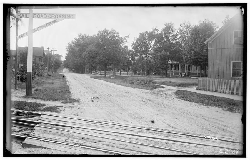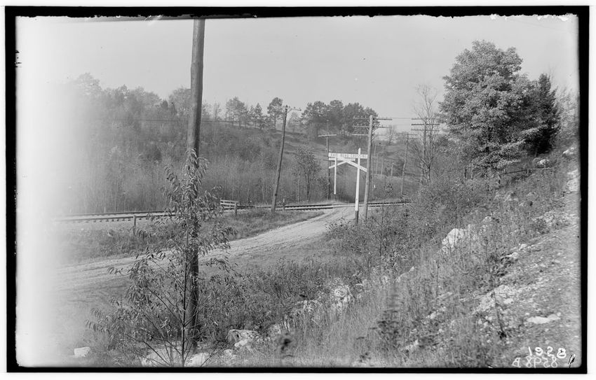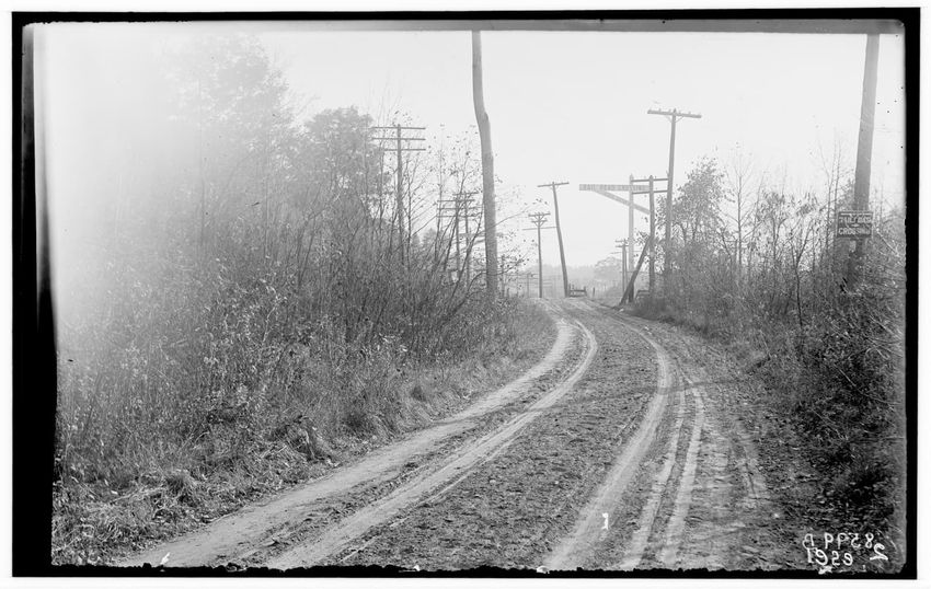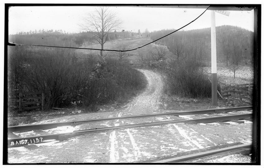 The image shows a rural landscape at Flint's East Crossing in Canaan, New York, facing north. A set of railroad tracks runs across the foreground. In the middle distance, a dirt path or road curves through bushy vegetation towards a distant, hilly horizon. A signpost is visible on the right side of ...