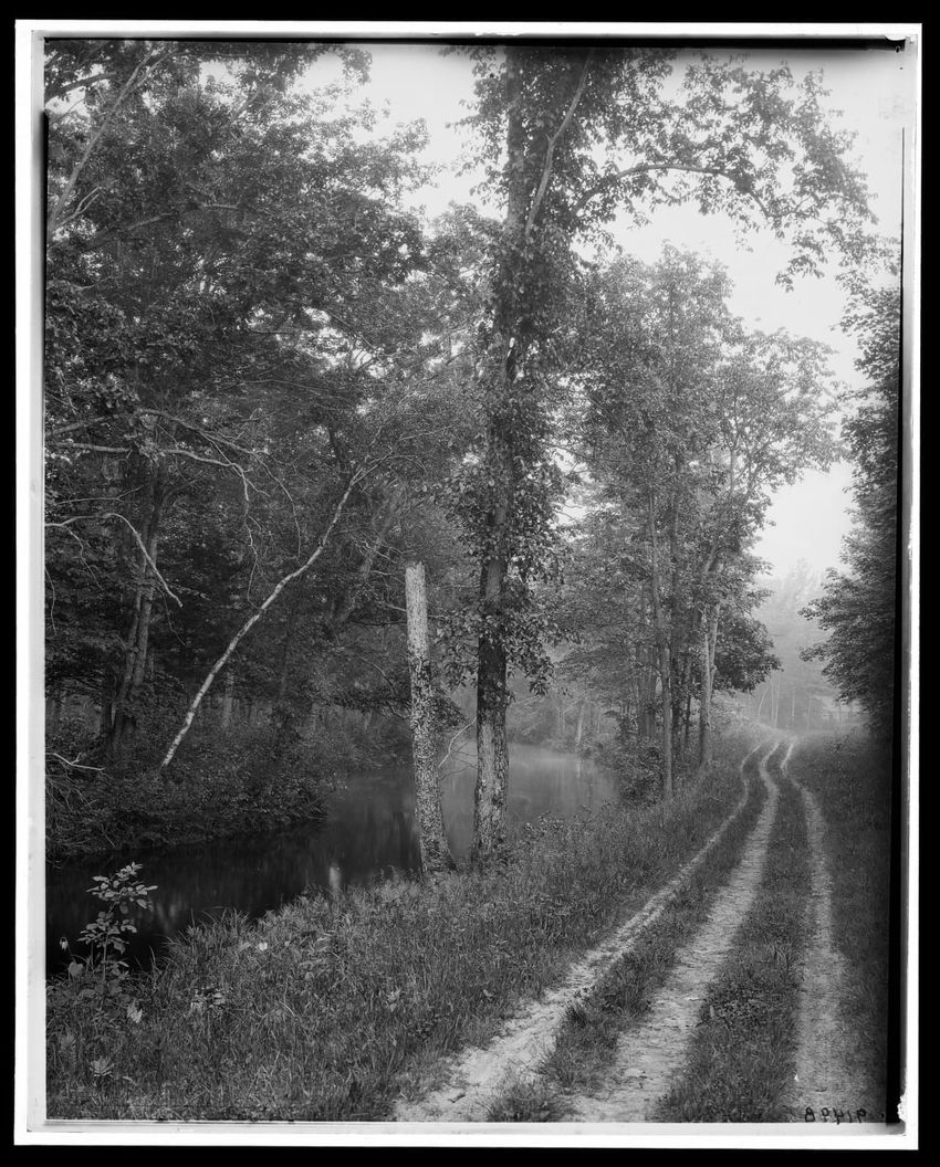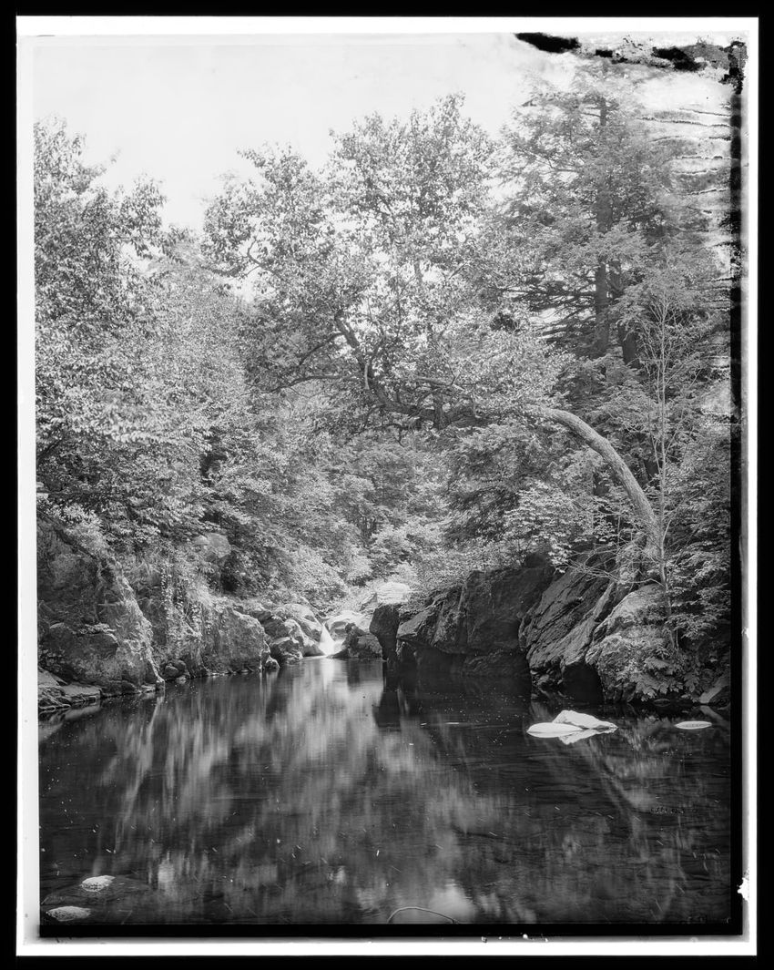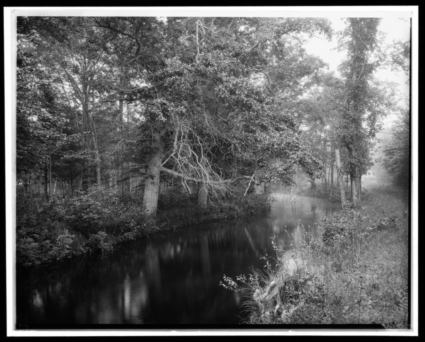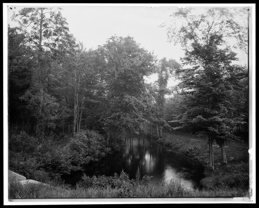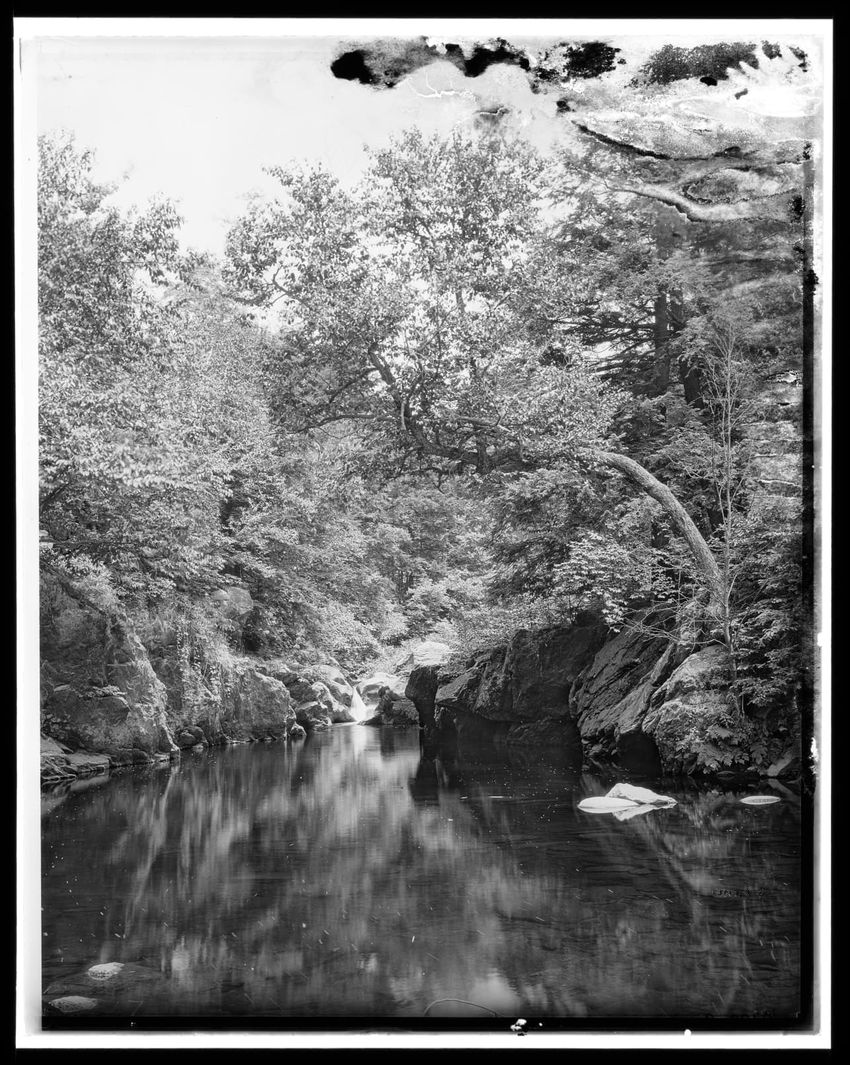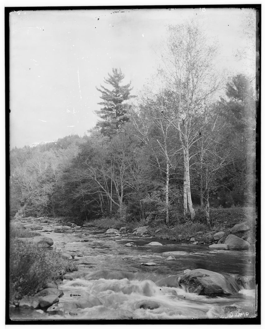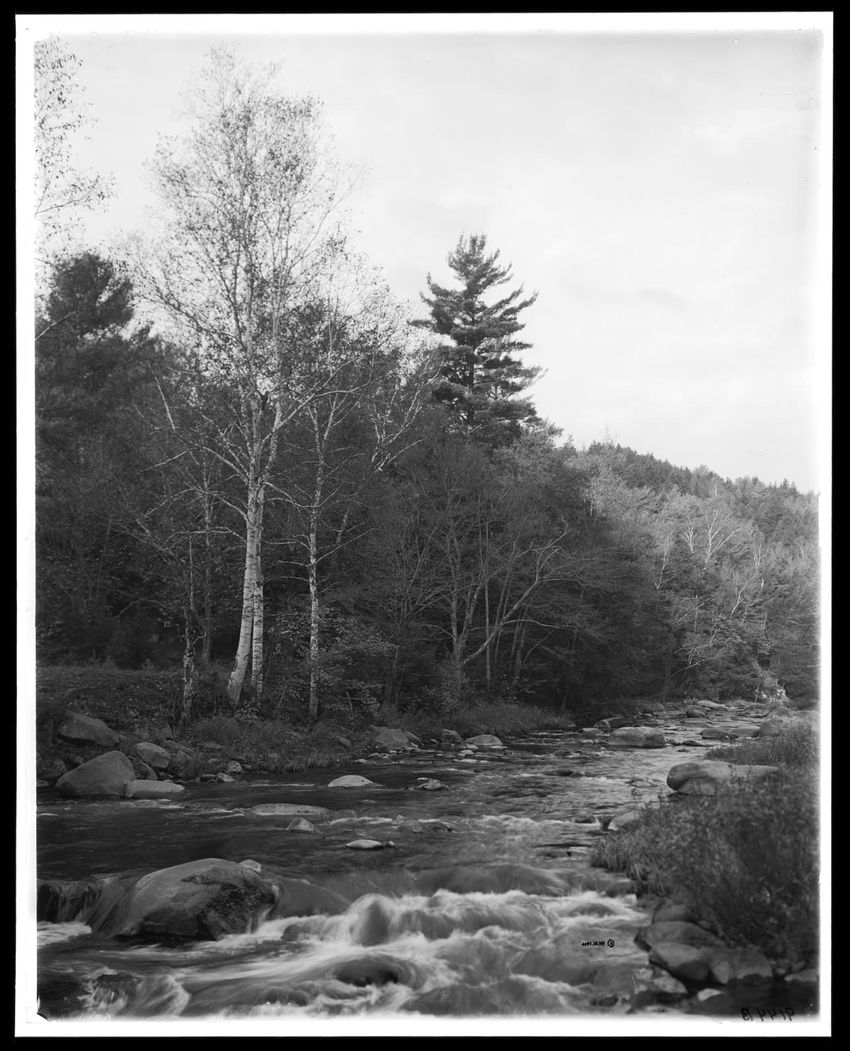 The image shows a wooded stream in Gilsum, New Hampshire, with water flowing over rocks. On the right side, there are several trees, including a prominent one with a lighter bark, set against dense foliage. The background features more trees that extend into the distance.
