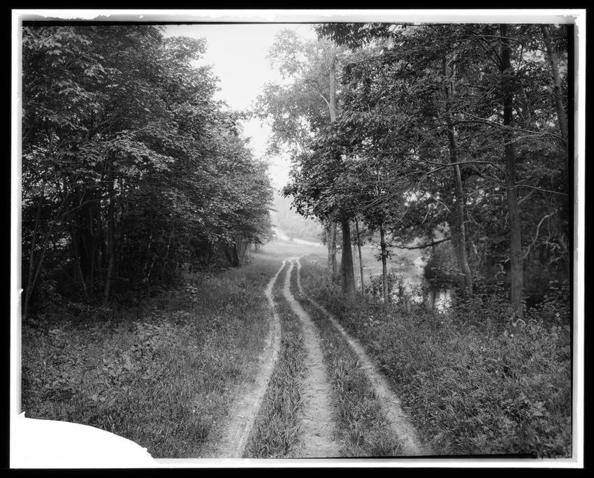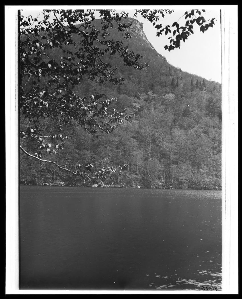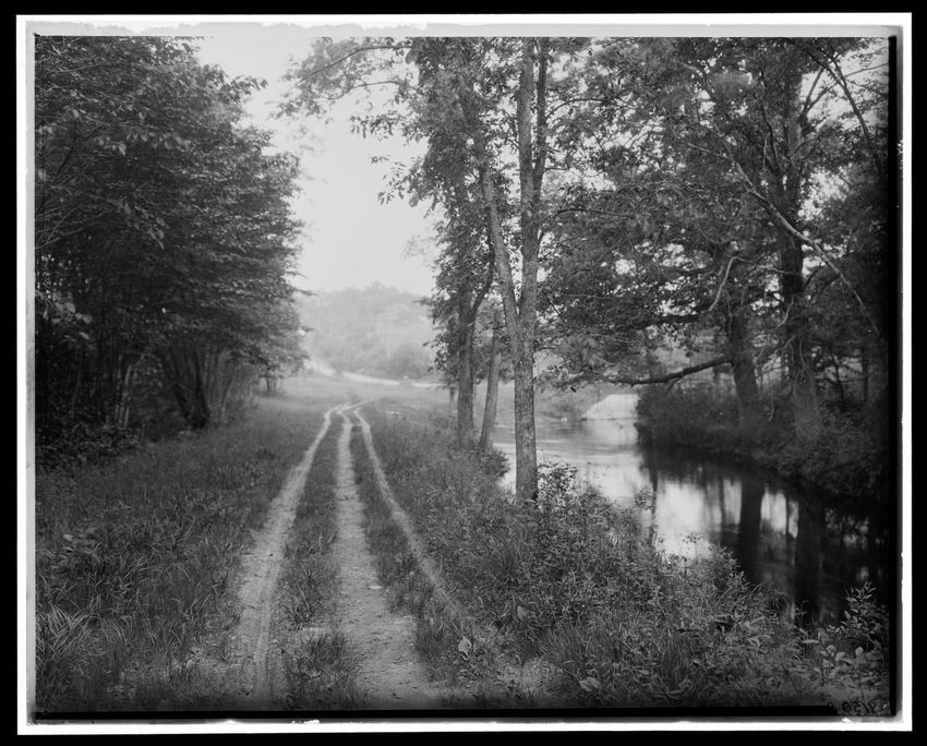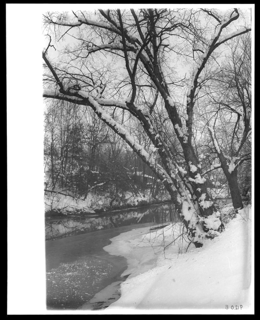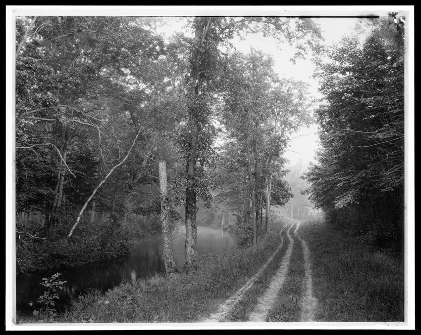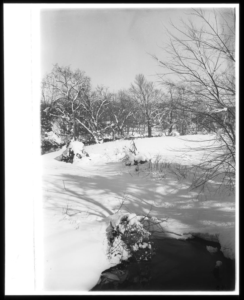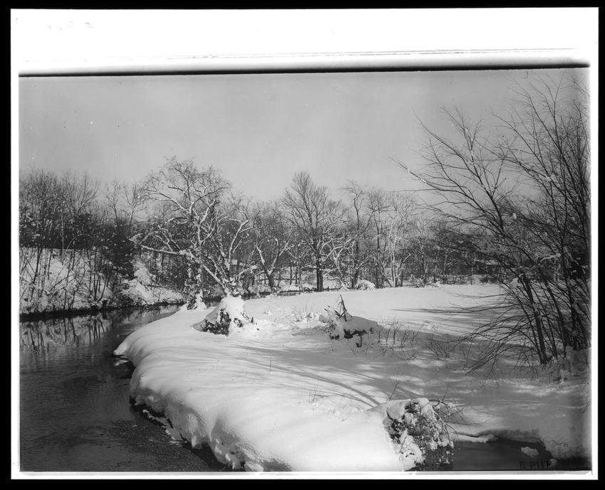 The image shows a wooded stream in Gilsum, New Hampshire, with water flowing over rocks. On the right side, there are several trees, including a prominent one with a lighter bark, set against dense foliage. The background features more trees that extend into the distance.