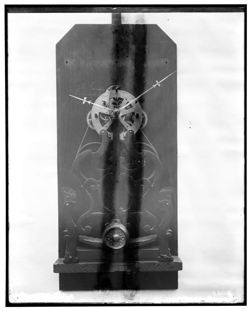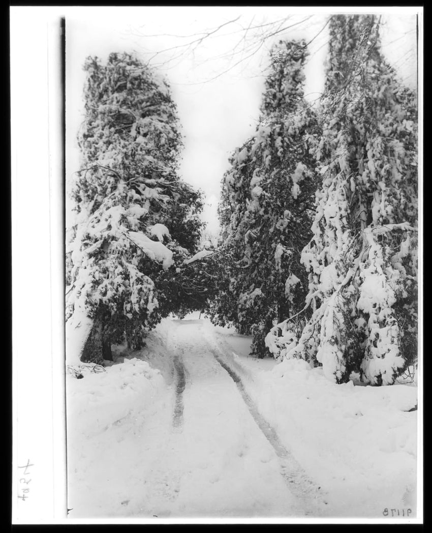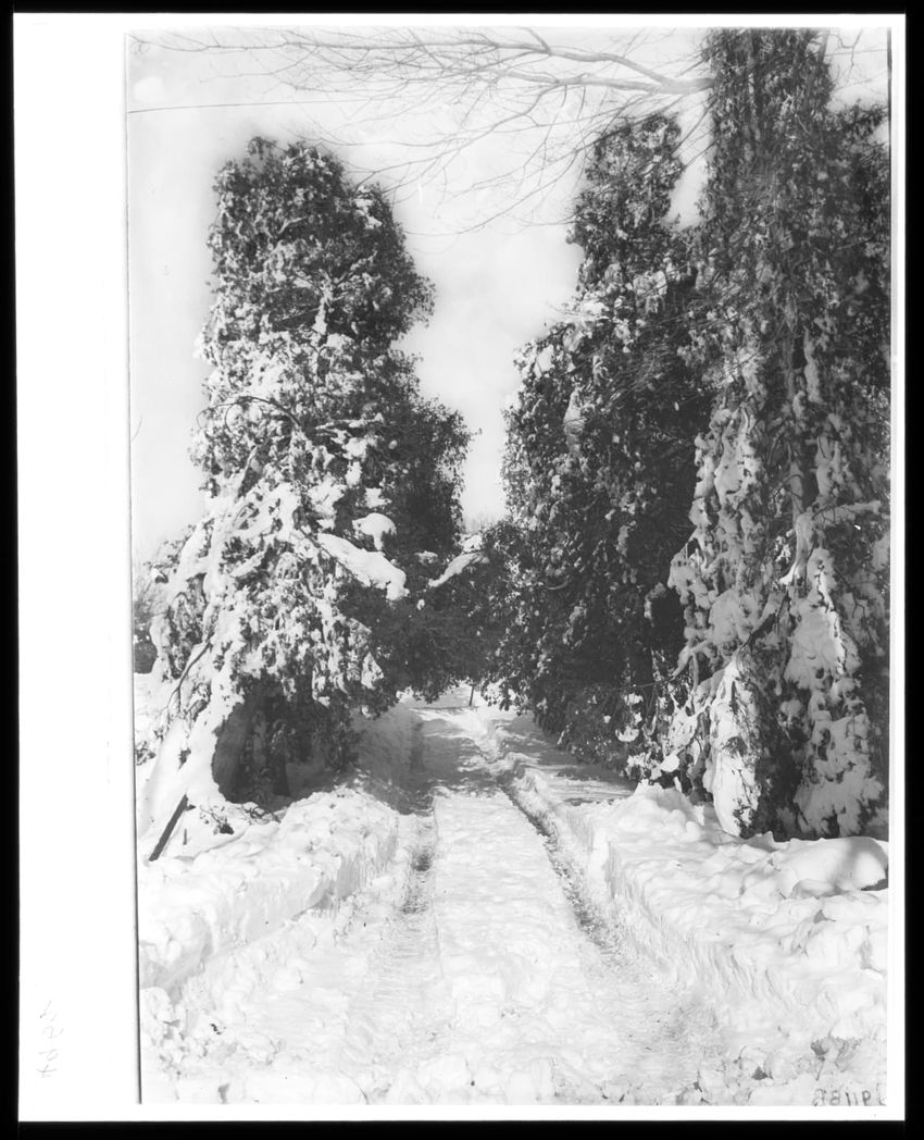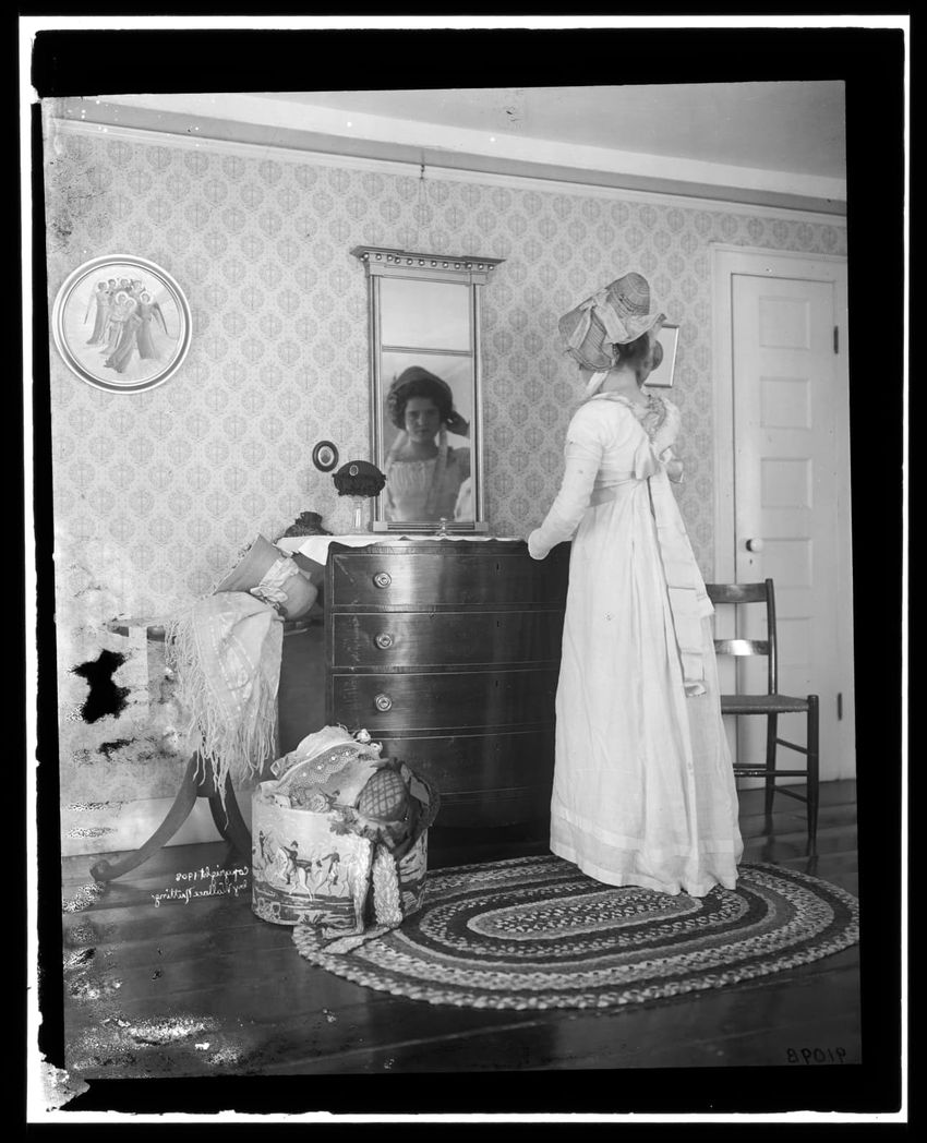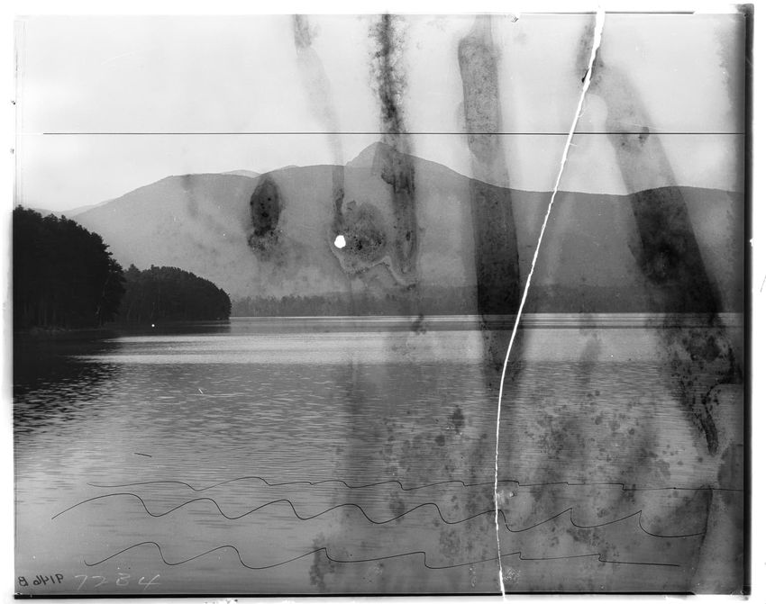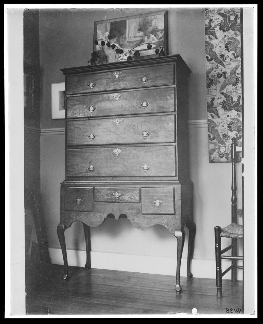 The image shows a wooded stream in Gilsum, New Hampshire, with water flowing over rocks. On the right side, there are several trees, including a prominent one with a lighter bark, set against dense foliage. The background features more trees that extend into the distance.