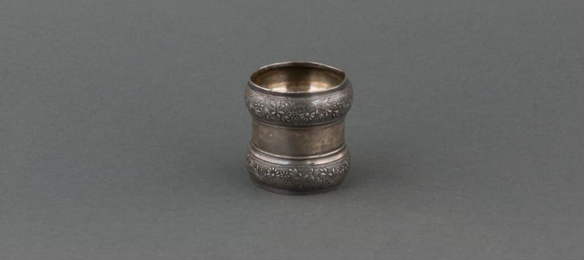 Silver napkin ring. Straight sides with molded rims and a central cartouche.
