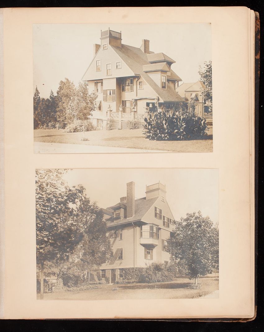 This album documents a Dorchester residence of Queen Anne style. It includes interior and exterior views (see pages 13, 15, 17, 19, 21, 23, 25, 27, 29, and 35 for wallpaper), as well as images of the house decorated for the Fourth of July and of a gathering of people celebrating the same holiday (se...