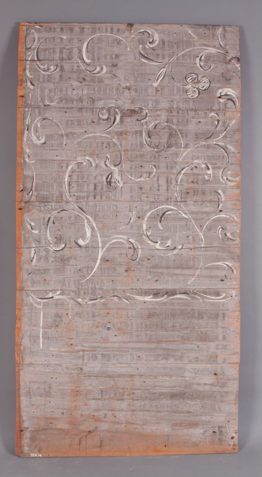 Floorboard with black, yellow, and red stenciling on a white background. Some sections are hand-painted with a blue, red and white stencil pattern of diamonds and ovals.