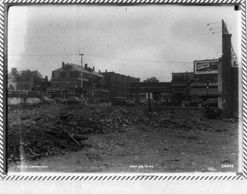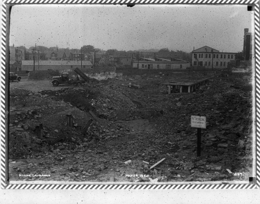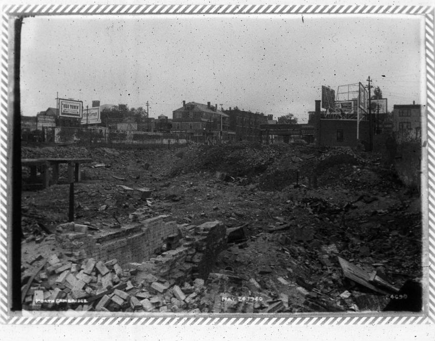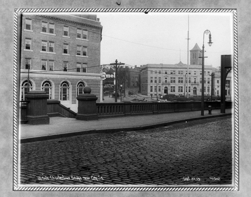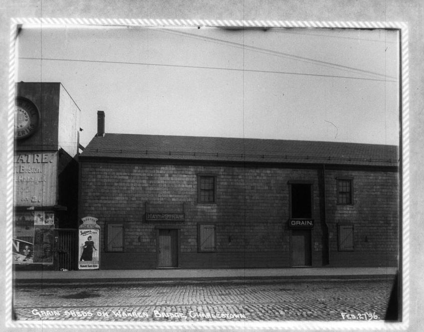 Signs on the shed read "Grain," "Hay & Straw." A large poster for the Boston Theatre advertises the play "Madame Sans Gene."