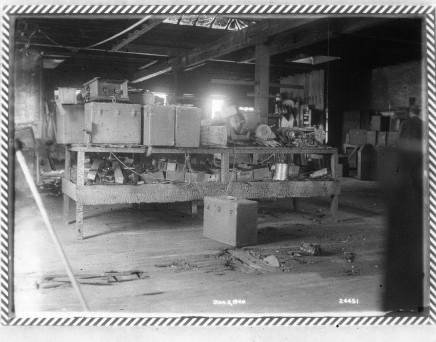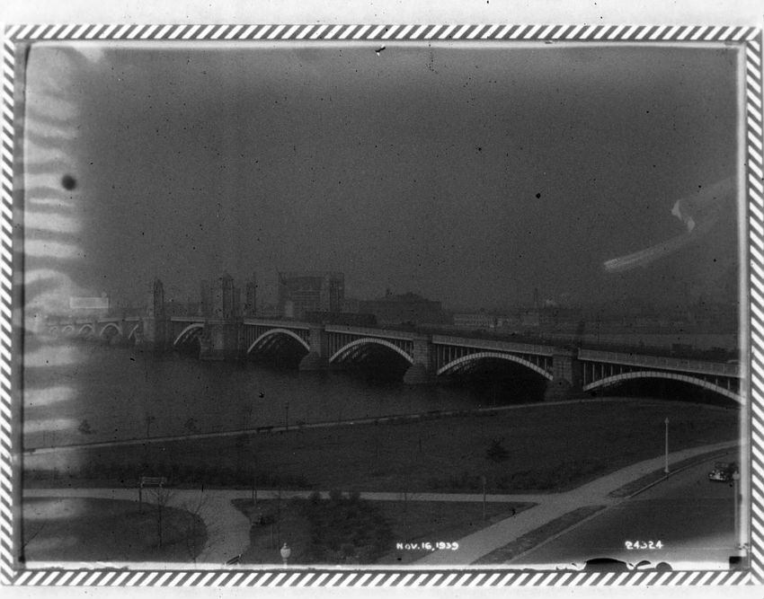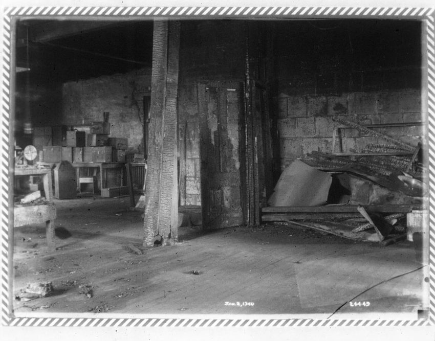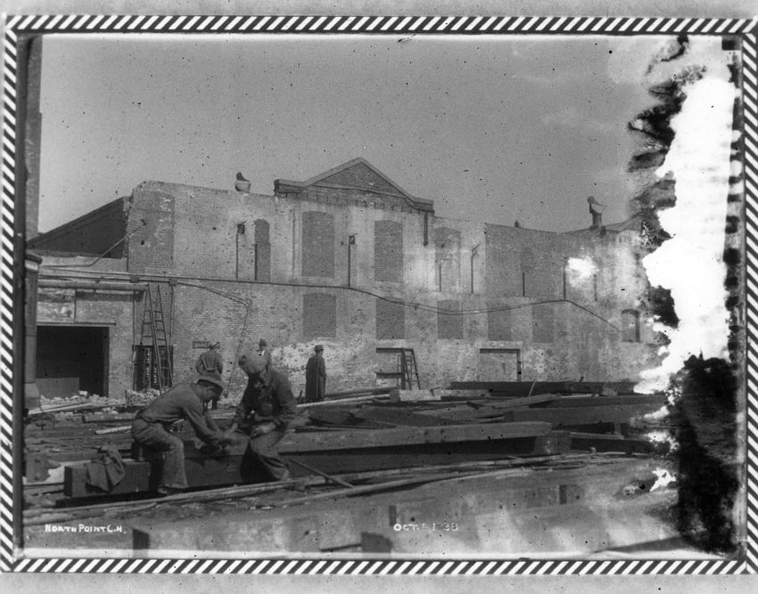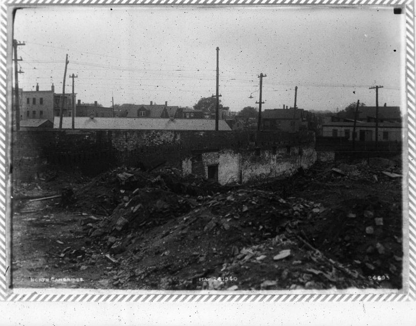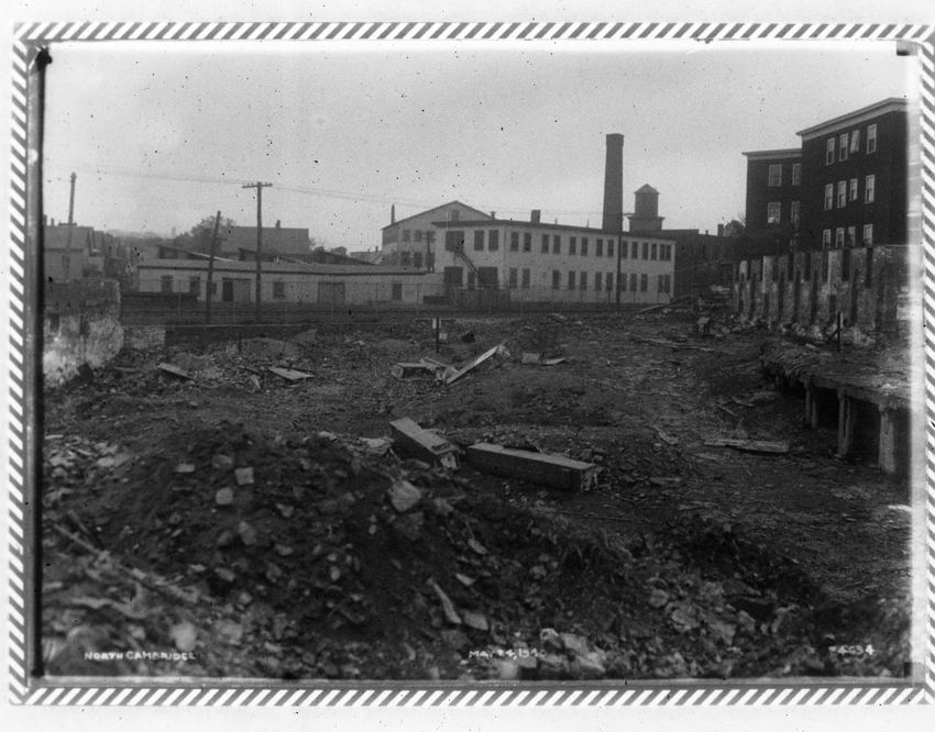 Signs on the shed read "Grain," "Hay & Straw." A large poster for the Boston Theatre advertises the play "Madame Sans Gene."