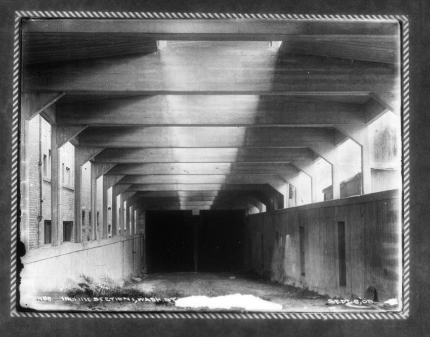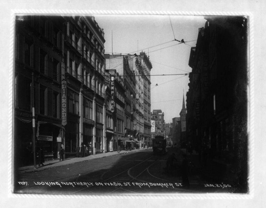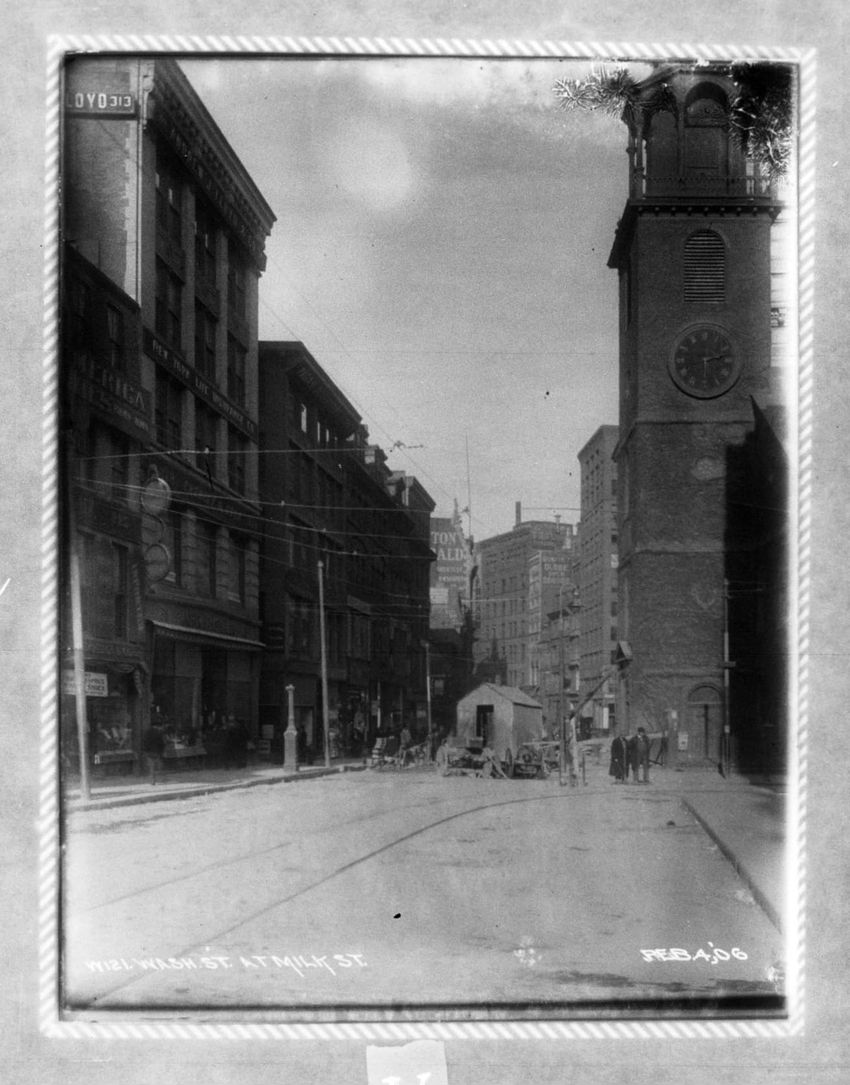 The Empire Theatre can be seen on the left side of the image. Further down on the right the Old South Church can be seen.