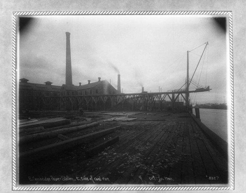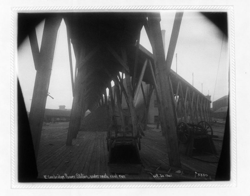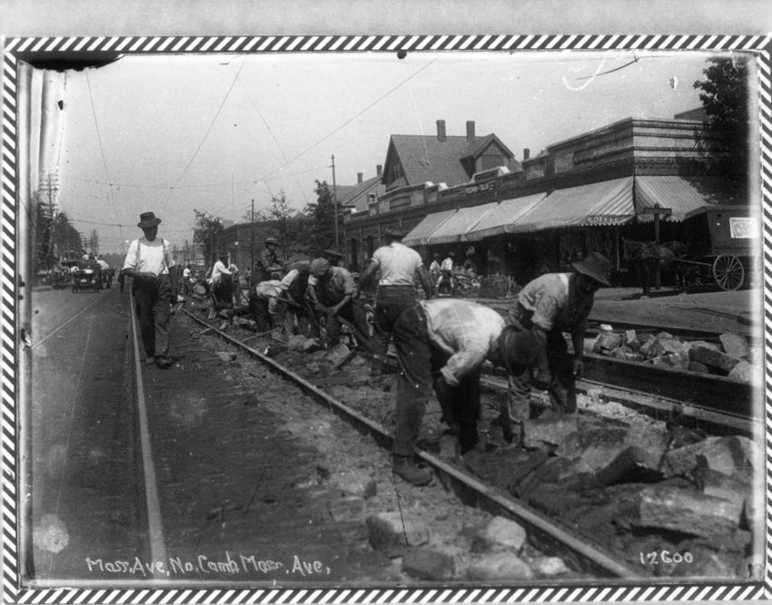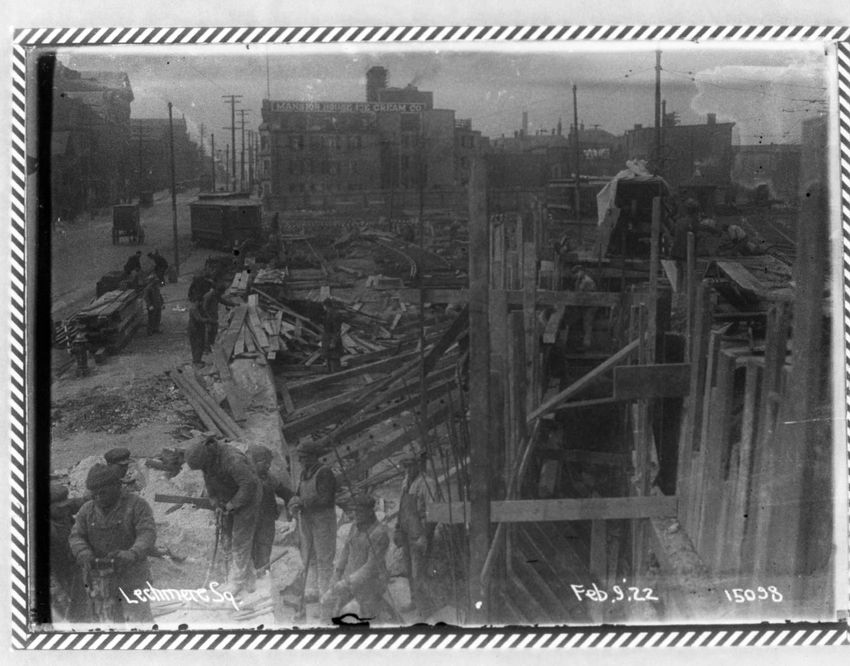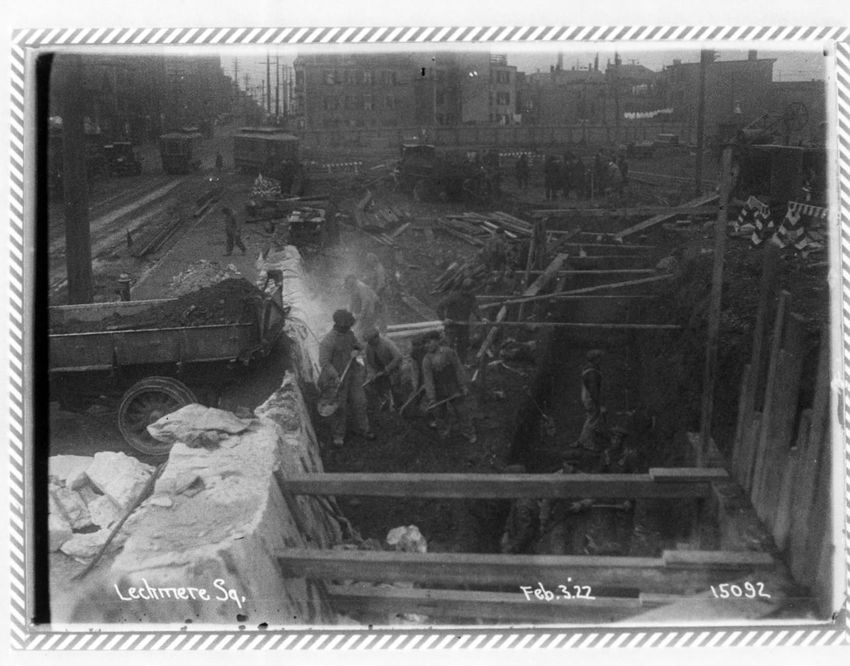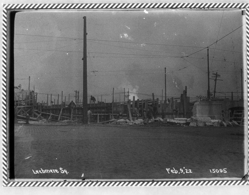 The construction site for the subway in Lechmere Square has workers and equipment. In the background the Mansion House Ice Cream Company building at 183 Cambridge Street can be seen. A streetcar can be seen in the image as well.
