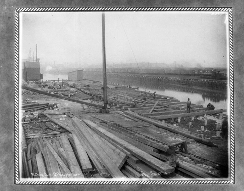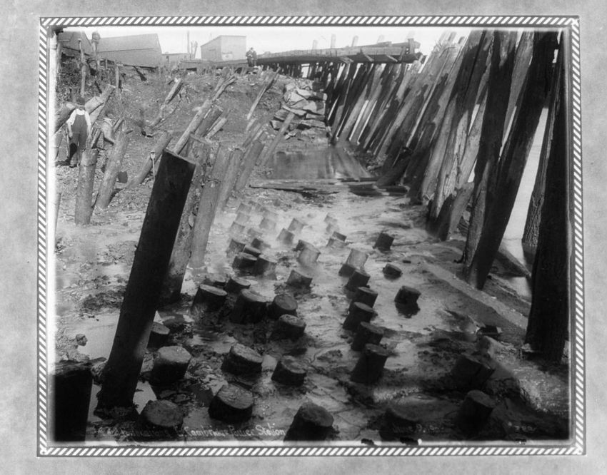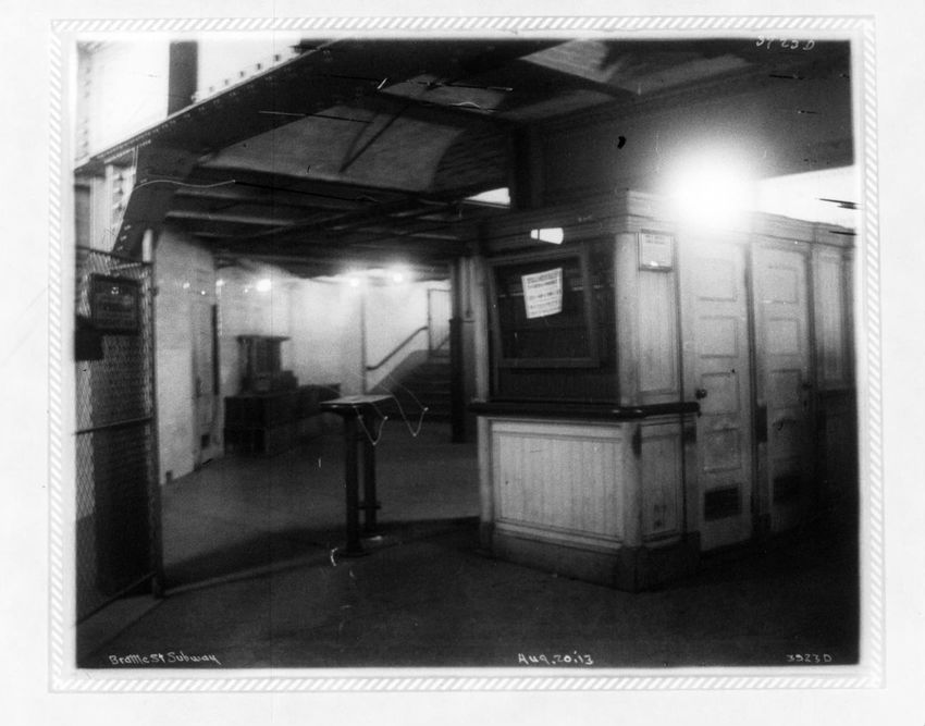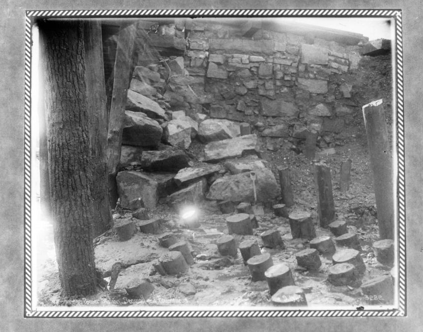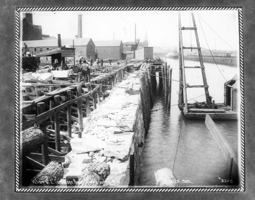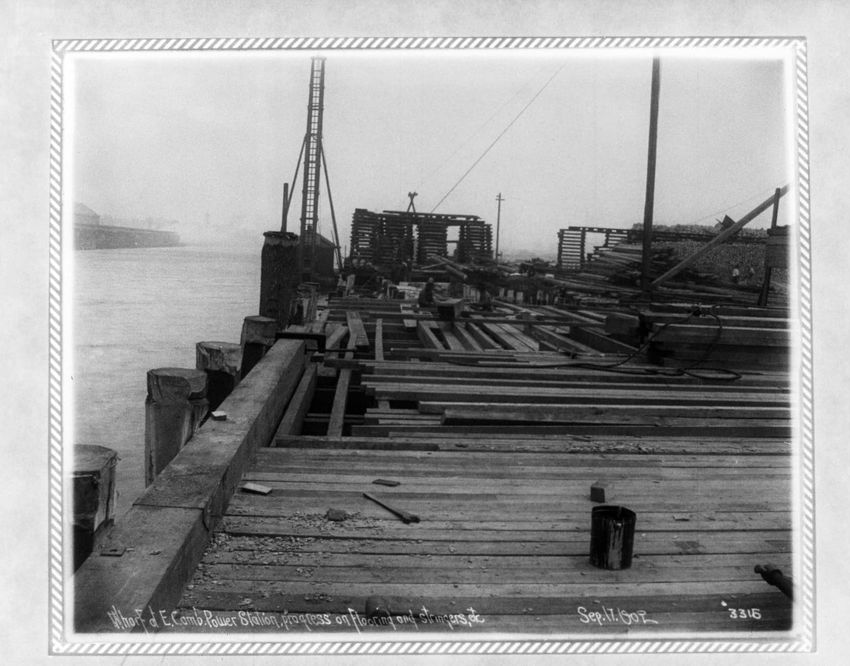 The construction site for the subway in Lechmere Square has workers and equipment. In the background the Mansion House Ice Cream Company building at 183 Cambridge Street can be seen. A streetcar can be seen in the image as well.