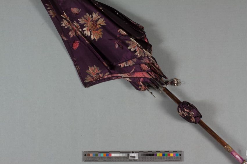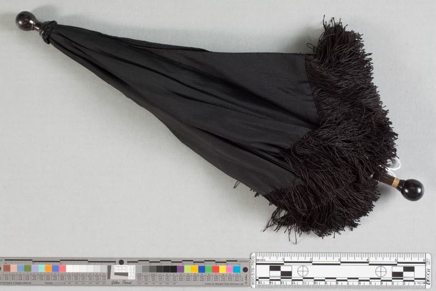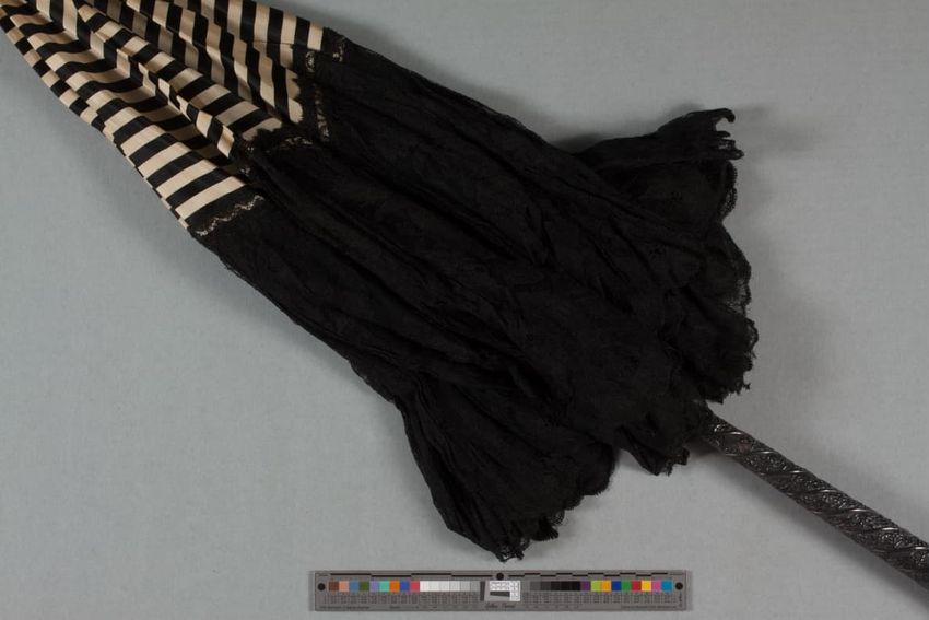 Parasol (A) of black Chantilly lace over two layers of ivory taffeta with scalloped edges; ivory folding shaft, handle and tip; handle carved with cherubs and flowers; knob at tip carved with flowers; metal hardware; black silk cord and tassel around knob. Box (B) is hinged, covered in dark red le...