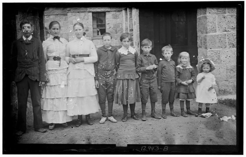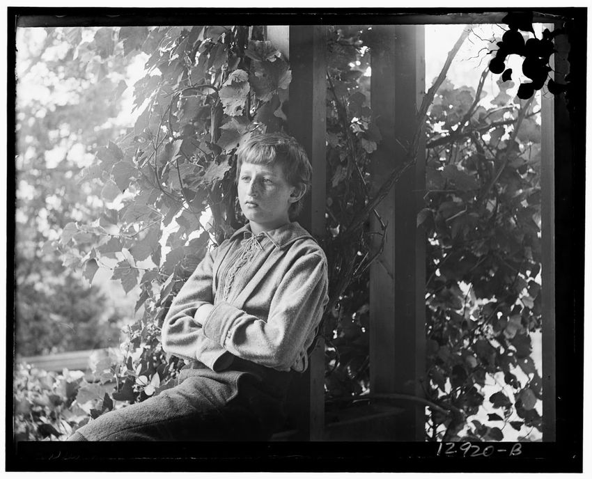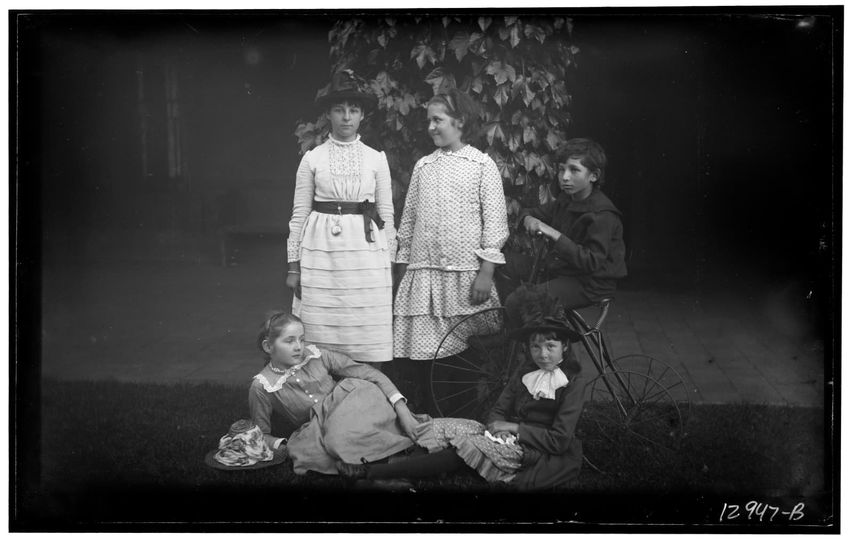 The image shows a group portrait of nine of the Curtis children. From left to right, they are William Curtis, Francis Greely Curtis, Elinor Curtis, Greely Stevenson Curtis, Isabella Curtis, Harry Appleton Curtis, Frazier Curtis, Harriot Sumner Curtis, and Margaret Curtis. They are standing in a row ...