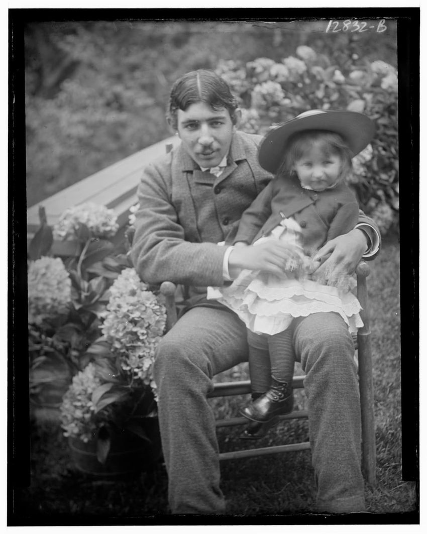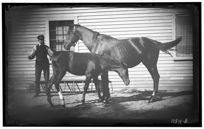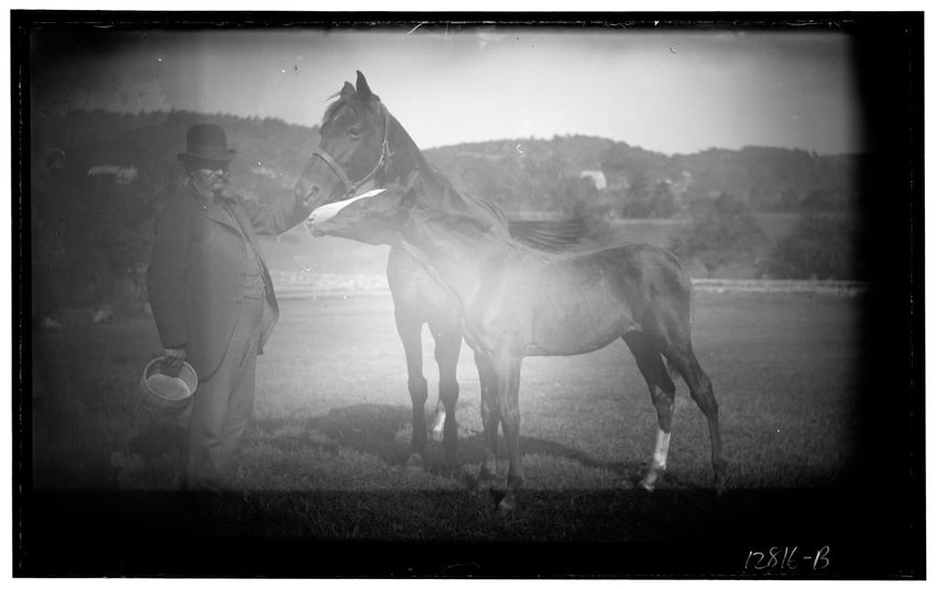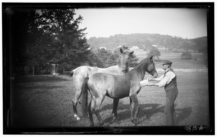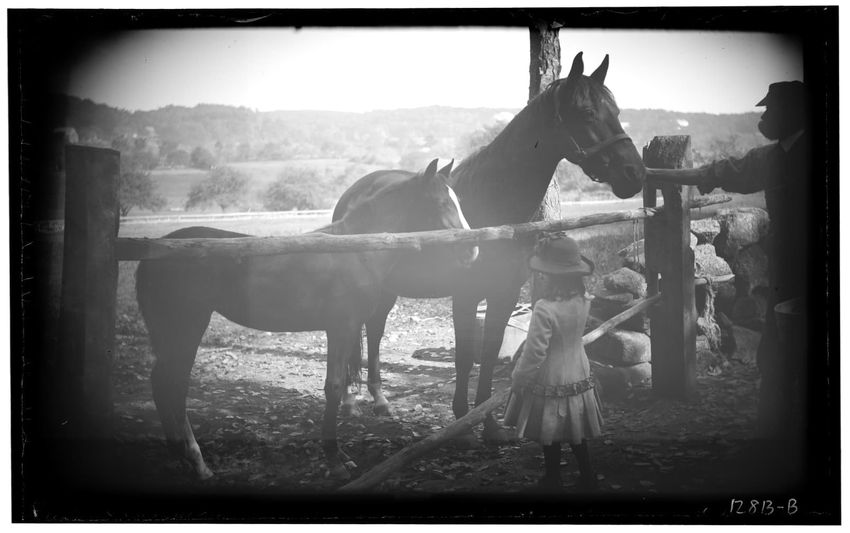 The image shows two horses, Jezabel and a colt, standing behind rustic wooden bars at Sharksmouth Estate in Manchester-by-the-Sea, Massachusetts. In the foreground, there is a young girl wearing a hat and coat, facing the horses. A man is visible on the right, appearing to interact with the horses. ...