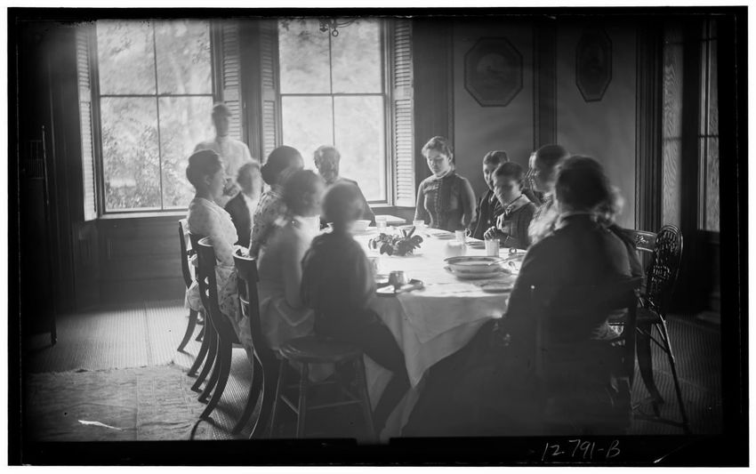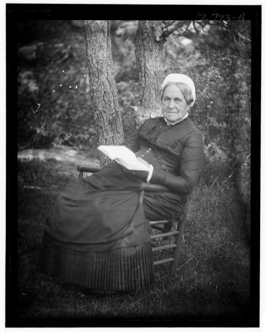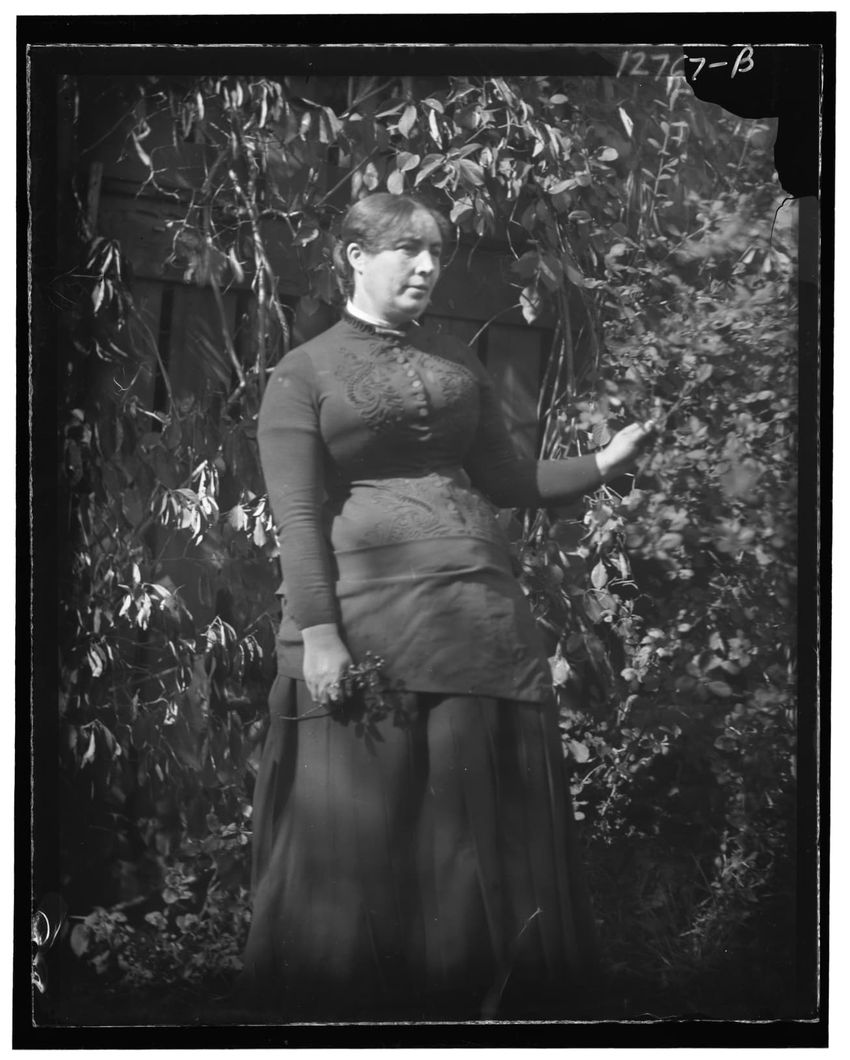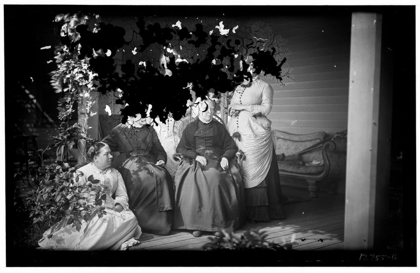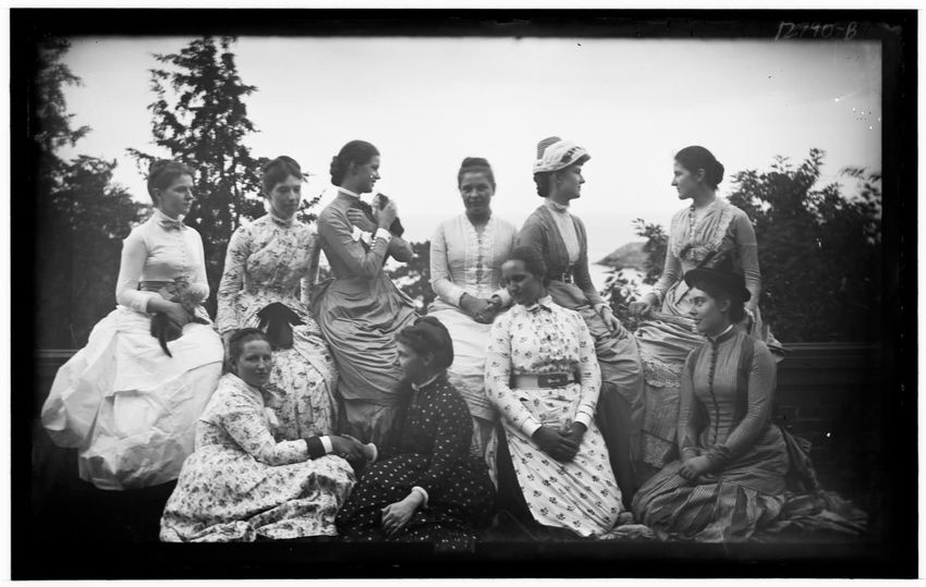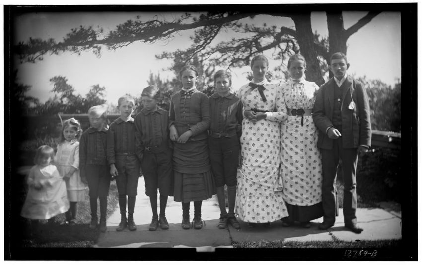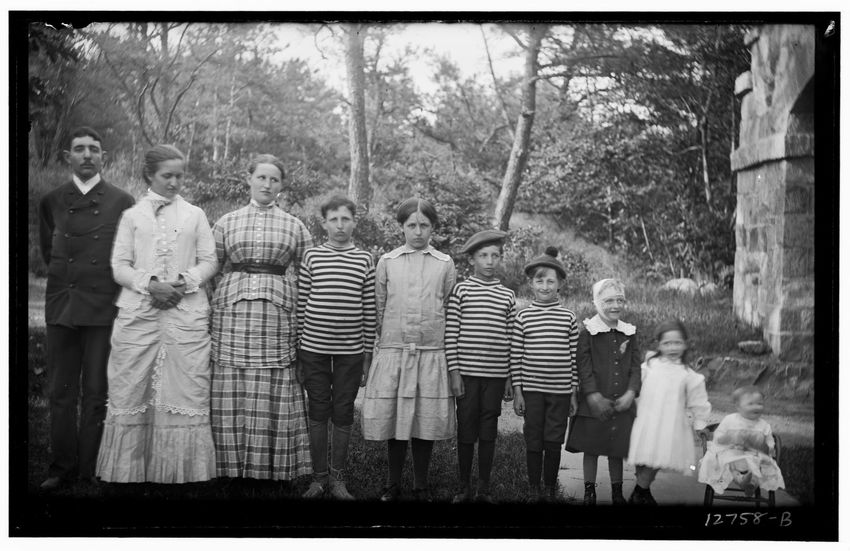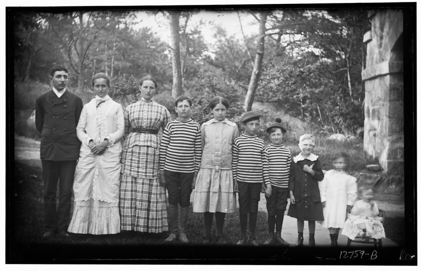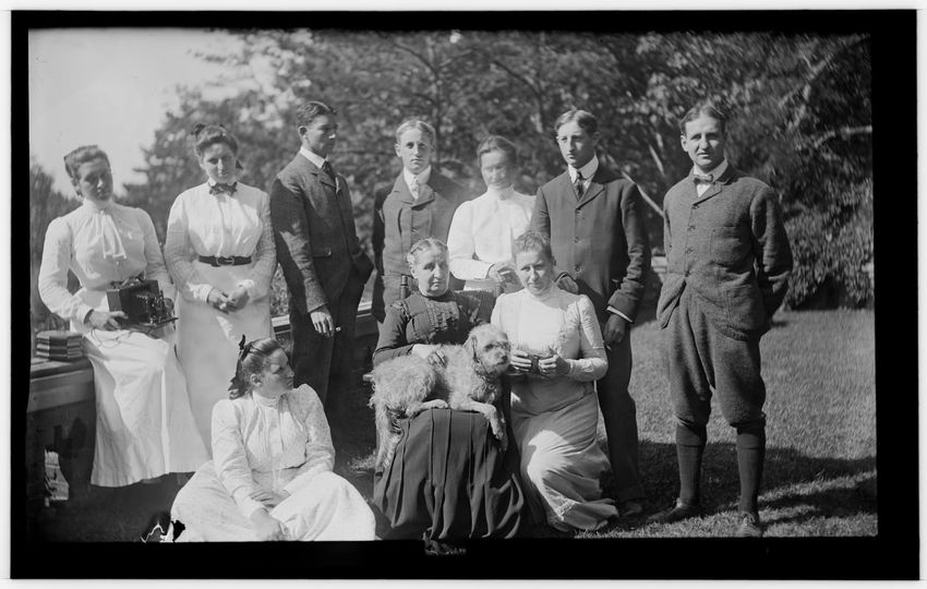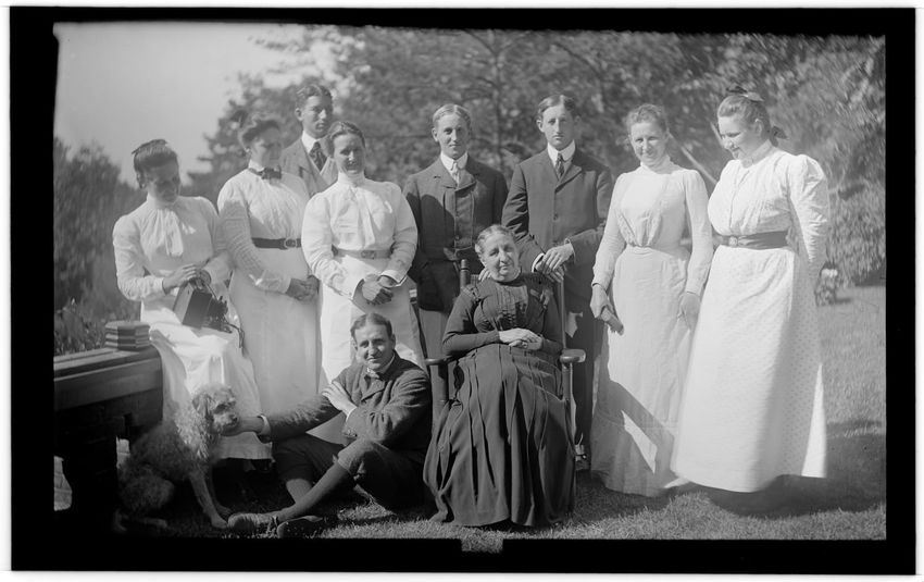 The image shows Harriot Appleton Curtis and her children. In the front row are Margaret Curtis, Harriot Appleton Curtis, Elinor Curtis, and a dog. In the back row are Isabella Curtis, Harriot Sumner Curtis, Harry Appleton Curtis, James Freeman Curtis, Frances Greely Curtis, Frazier Curtis, and Greel...