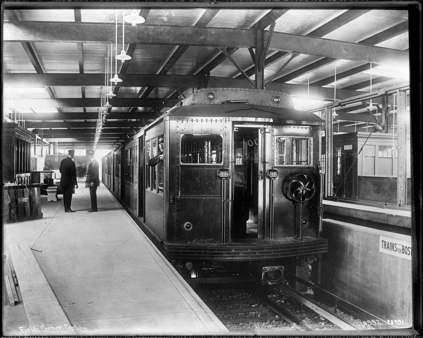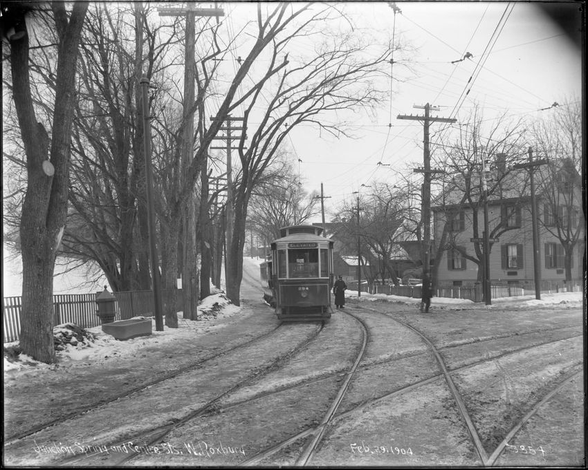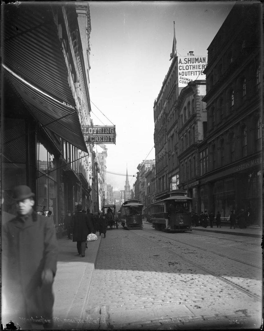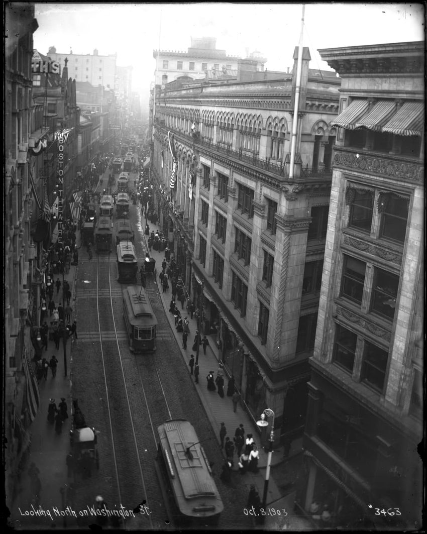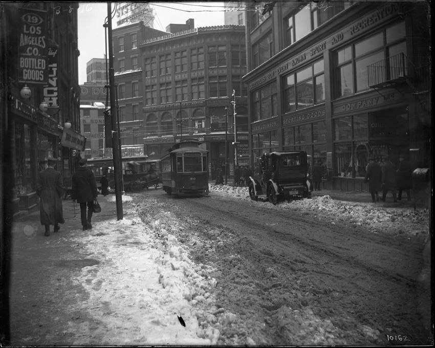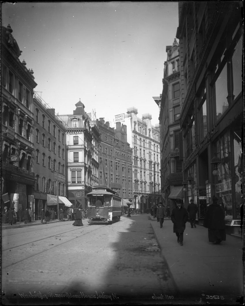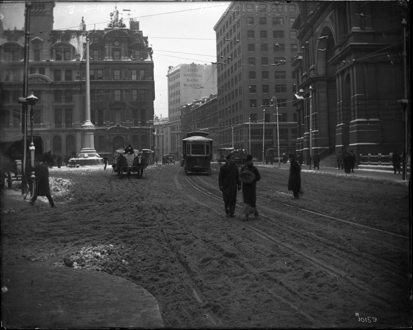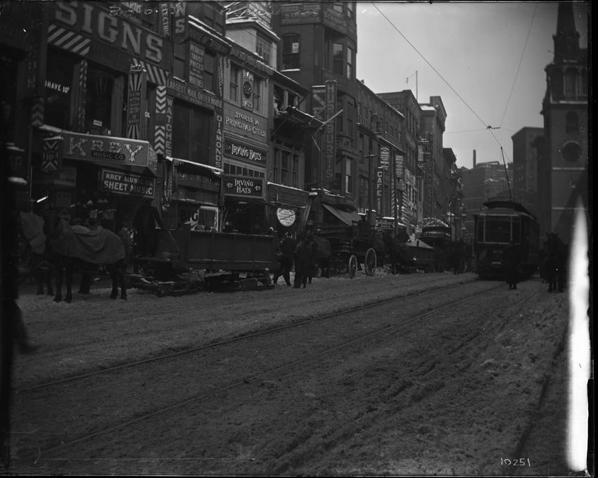 Street scene (winter), snow on the ground. Horse drawn wagon, trolley #91, sign: South Station, North Station, First National Bank Building, sign: left: New England Mutual Life Insurance Building, Angel Memorial Park, Far Right: Post Office + Subtreasury. Building, pedestrians.