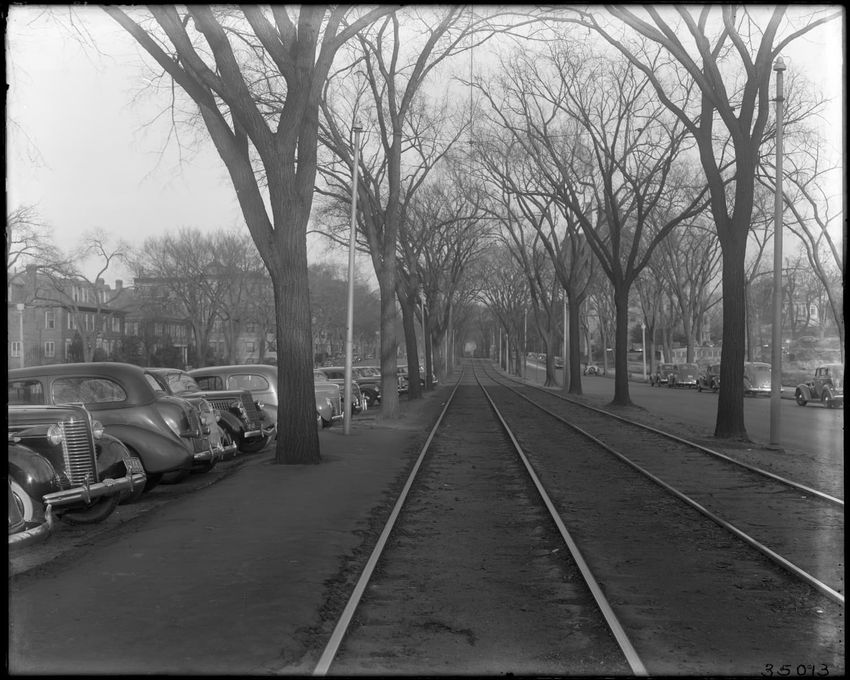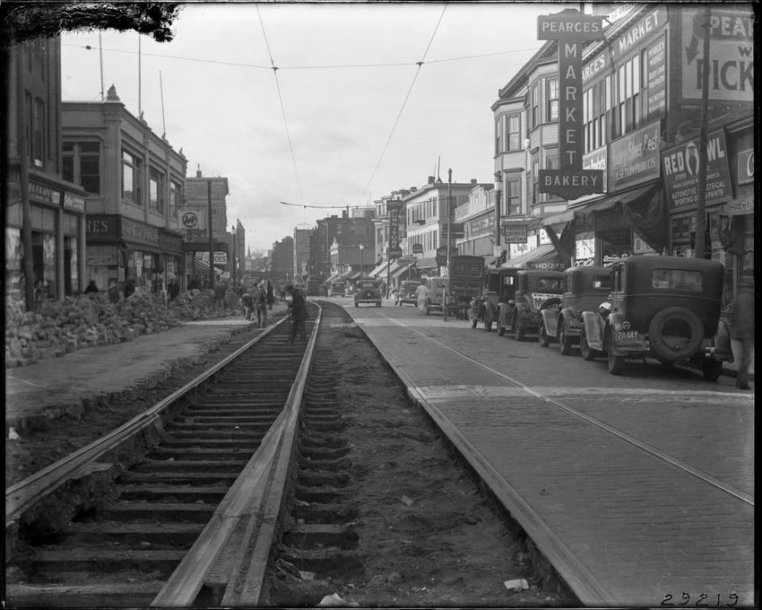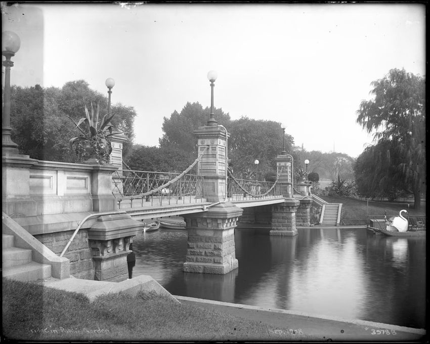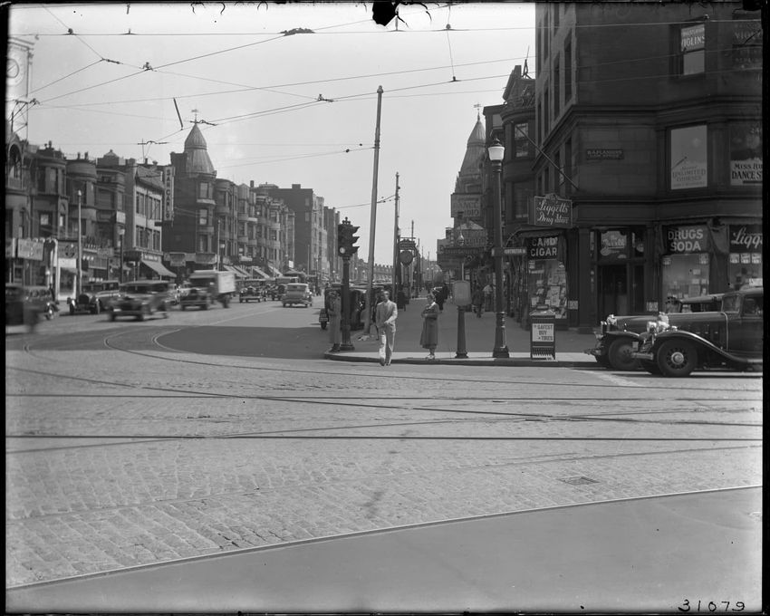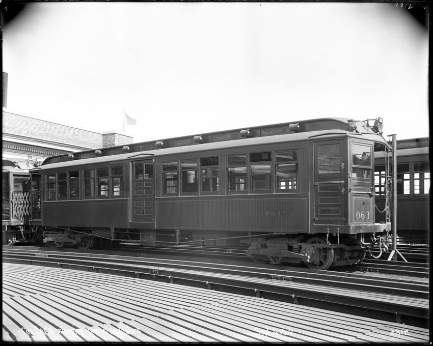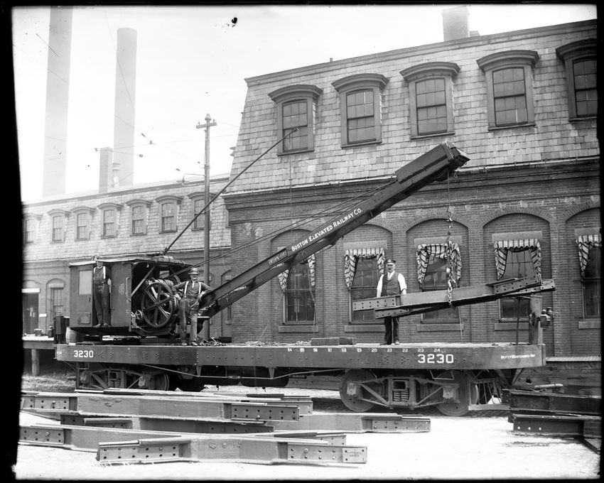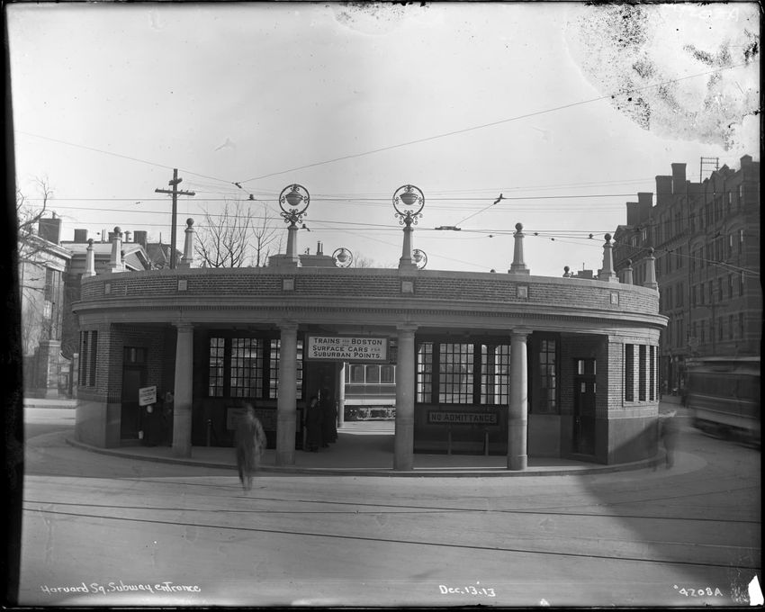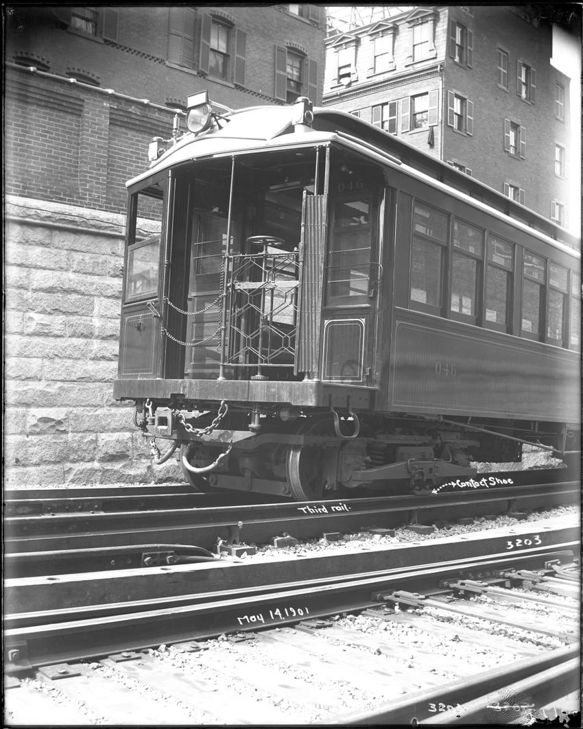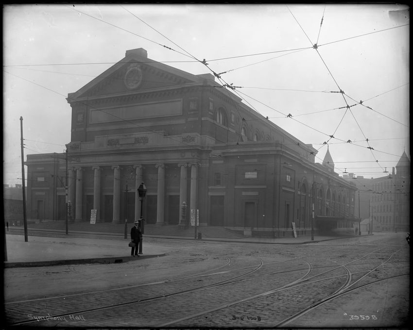 Street scene (winter), snow on the ground. Horse drawn wagon, trolley #91, sign: South Station, North Station, First National Bank Building, sign: left: New England Mutual Life Insurance Building, Angel Memorial Park, Far Right: Post Office + Subtreasury. Building, pedestrians.